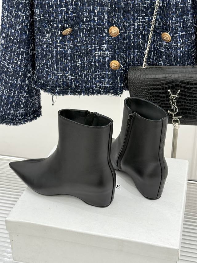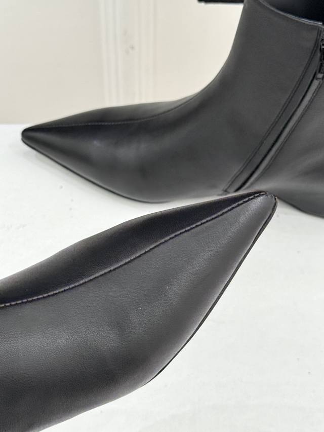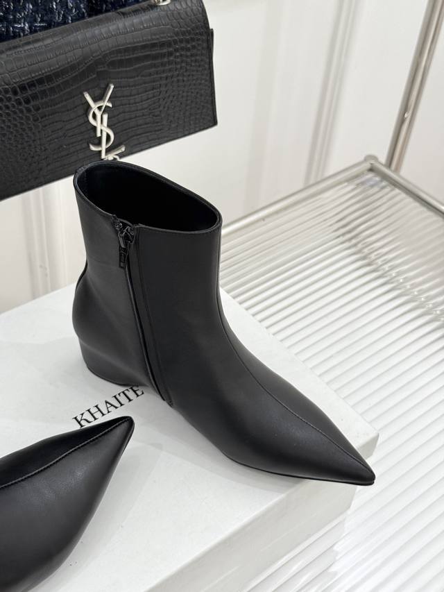 Factory Price: Khaite 25Wf New Retro Pointed-Toe Heightened Ankle Boots. These ankle boots imbue your steps with a time-tested edge. The signature pointed toe flows smoothly into the sculpted, curved heel. The 4cm rise subtly elongates the leg, instantly enhancing the silhouette. A true stealth tool for enhancing proportions. A side zipper creates a sleek yet practical look. The shaft fits snugly around the ankle yet remains flexible, ensuring a secure, level footing. From commuting with a cashmere coat to casually pairing with a knit maxi skirt, these boots blend seamlessly with a neutral palette. Metallic stitching creates a shimmer with every step, creating a harmonious fusion of vintage elegance and modern style . Each step treads the line between classic and contemporary, renewing the contemporary narrative of vintage footwear with unwavering confidence.