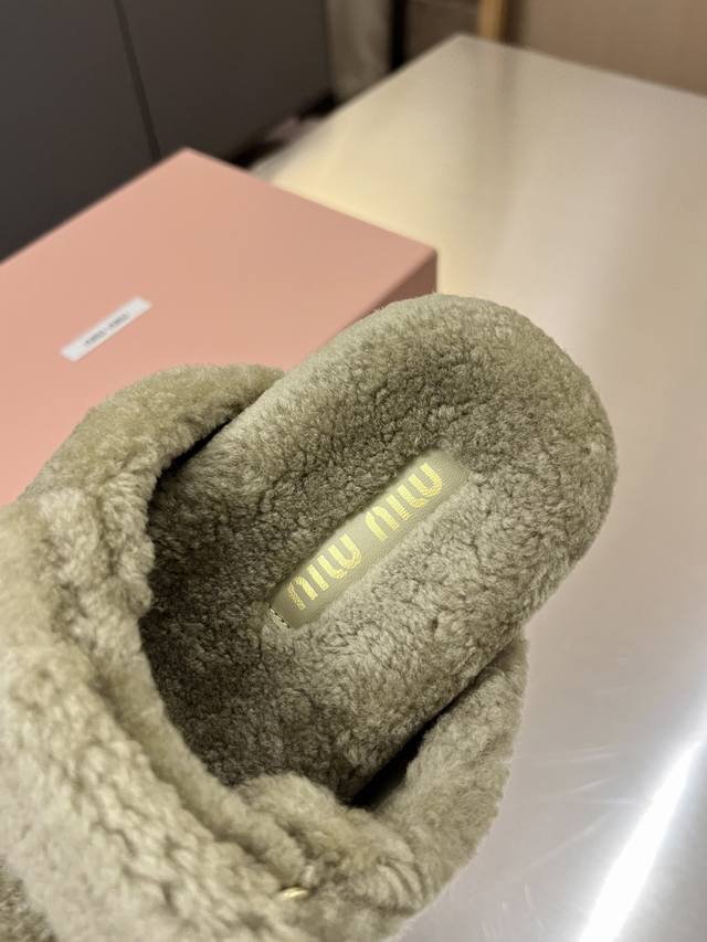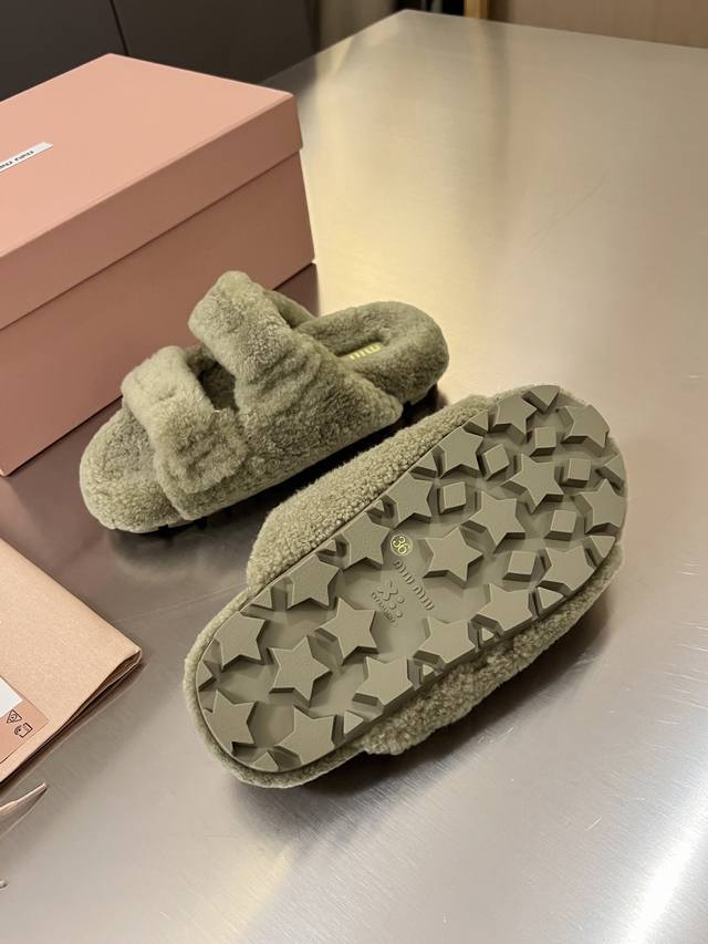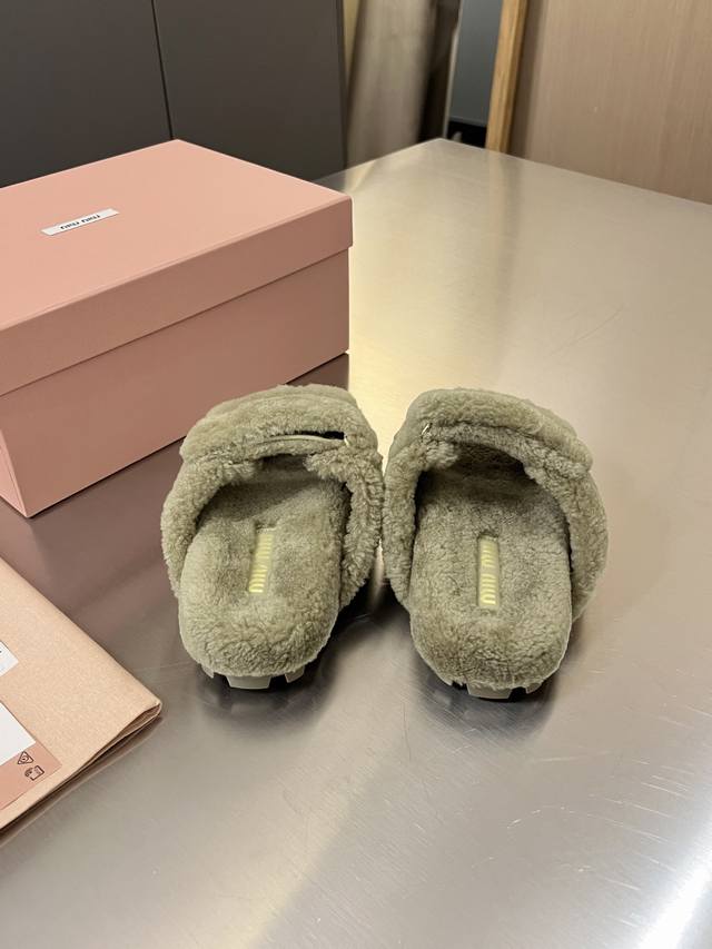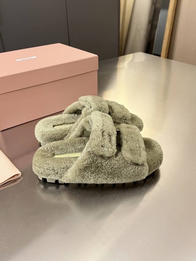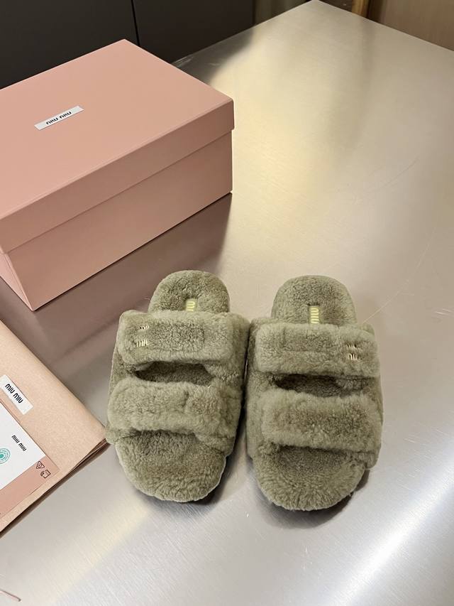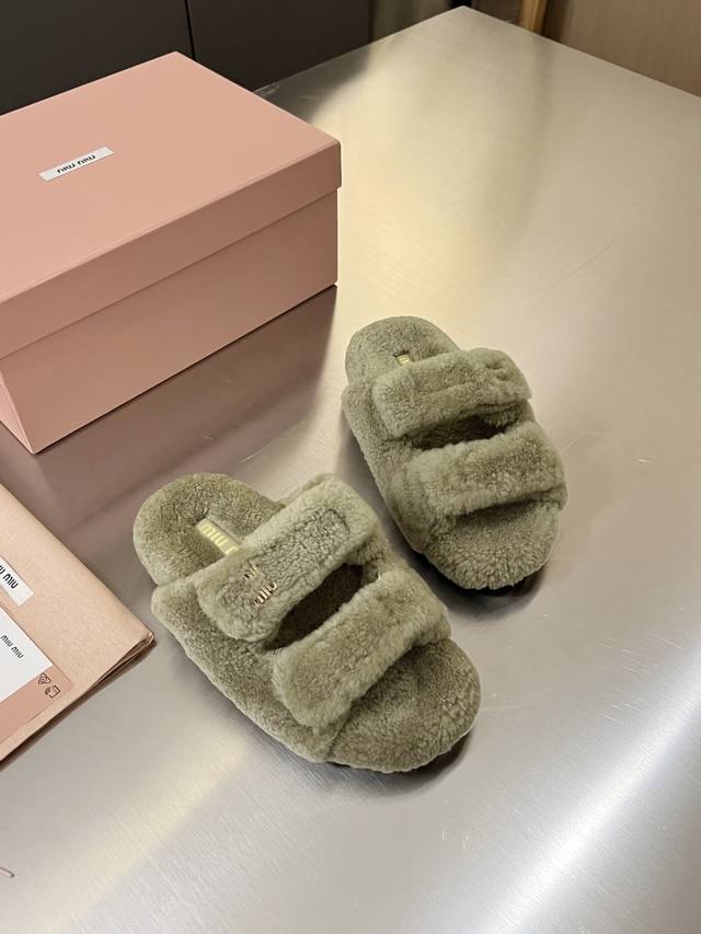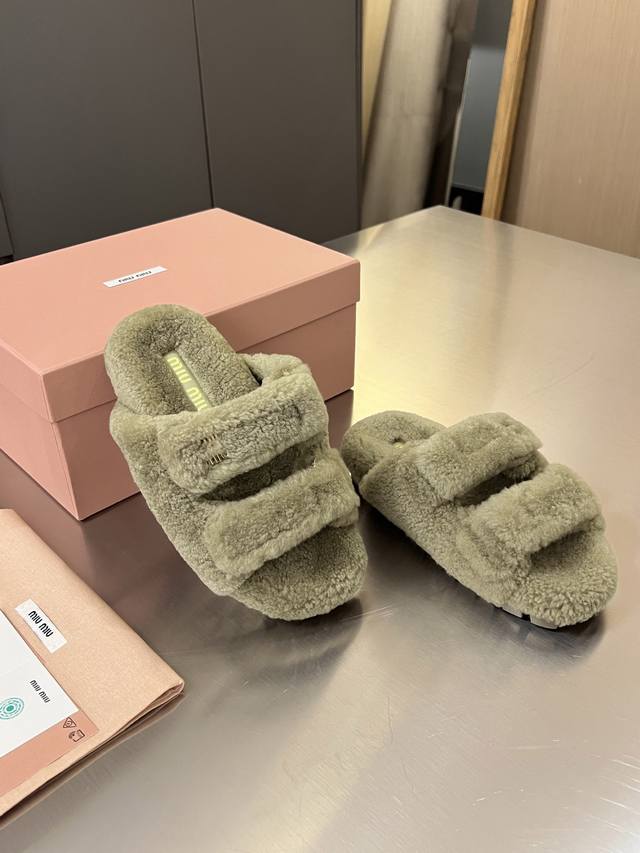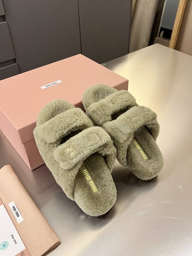 Factory Price: Miu Miu 2025 Autumn/Winter New Fashionable One-Strap Velcro Flat Furry Slippers. The upper is made of imported Grade A wool, identical to the original. The entire shoe is made of 100% pure wool. The upper and insole logo are made of mixed sheepskin. 1:1 mold of the original. TPU material outsole, wear-resistant and non-slip. Sizes: 35-40, 41 (custom orders are non-refundable). Black, white, yellow, light gray.
