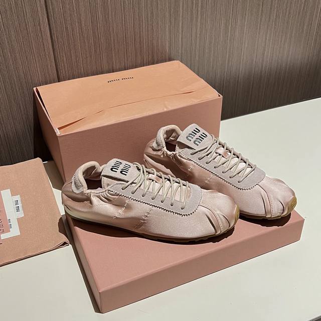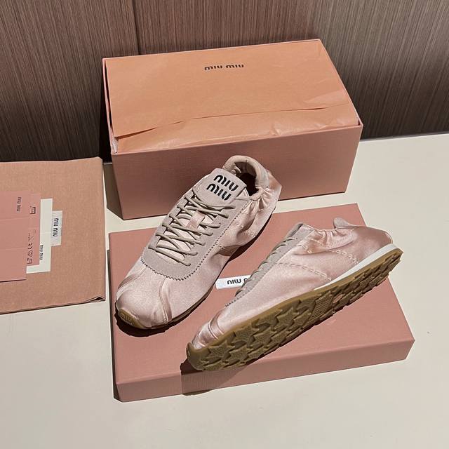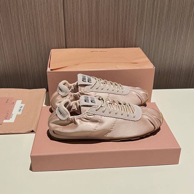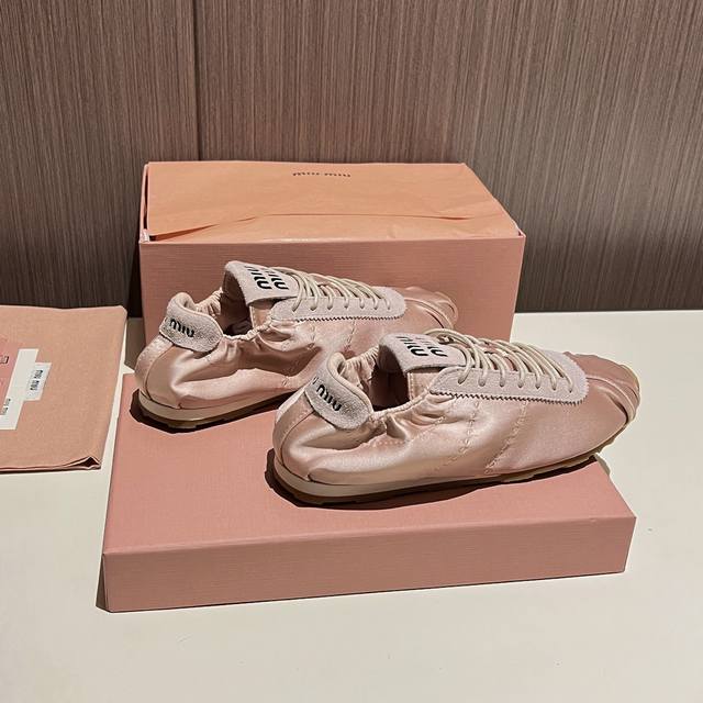 Factory Price: Miu Miu 2025 Early Spring New Plume Sneakers Ultra-light design meets the essence of satin, evoking the charm of classic ballet flats. Explore exquisite color matching and unique details, showcasing Miu Miu's experimental spirit. The silk texture fabric looks really luxurious, super soft and comfortable on the feet, full of girlish charm. Colors: Nude pink, light blue, sophisticated gray, off-white, black, dark brown. Size: 35-40, 41 (custom made). Factory direct supply.