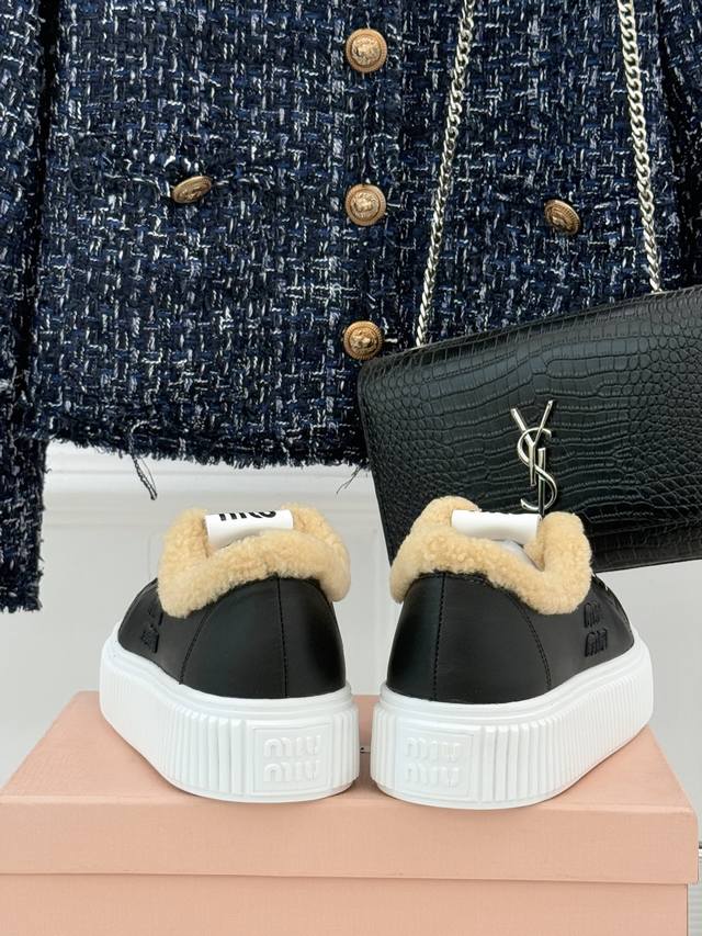 Factory Price Miu Miu 25Wf New Wool Casual Platform Biscuit Shoes When the warmth of wool meets the retro gene of biscuit shoes, these biscuit shoes become the winter exclusive for sweet and cool girls. The iconic wave-patterned platform sole replicates the classic biscuit silhouette. The approximately 3.5cm heel subtly elongates the leg line, allowing even petite girls to easily achieve superior proportions. The upper is made of fine wool material, gently wrapping the feet. The sheepskin lining locks warmth firmly inside the shoe, allowing you to travel freely even in the cold winter of the north. The printed logo on the tongue and heel subtly reveals the brand identity, complementing the rounded toe and showcasing a cute and girlish feel. The rubber five-pointed star pattern outsole provides both slip resistance and rebound, making walking light and burden-free, and won't tire your feet even when shopping or walking around for a long time. Whether paired with sweatpants or jeans for a casual everyday look, or with a skirt for a sweet and girly style, the