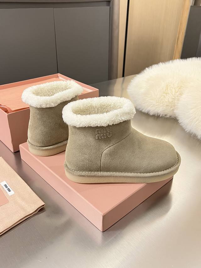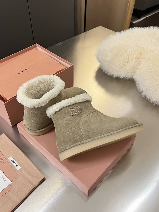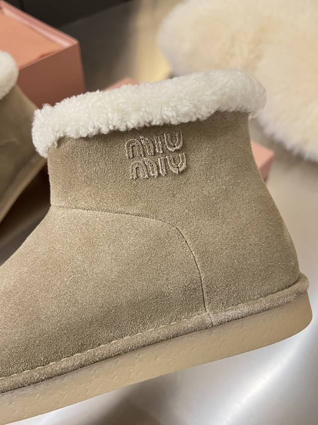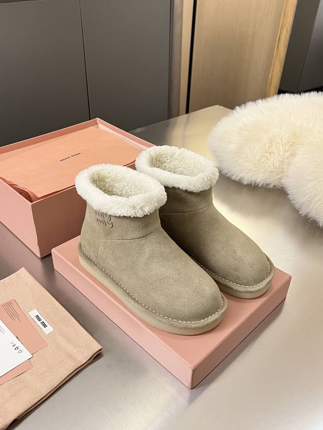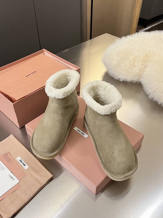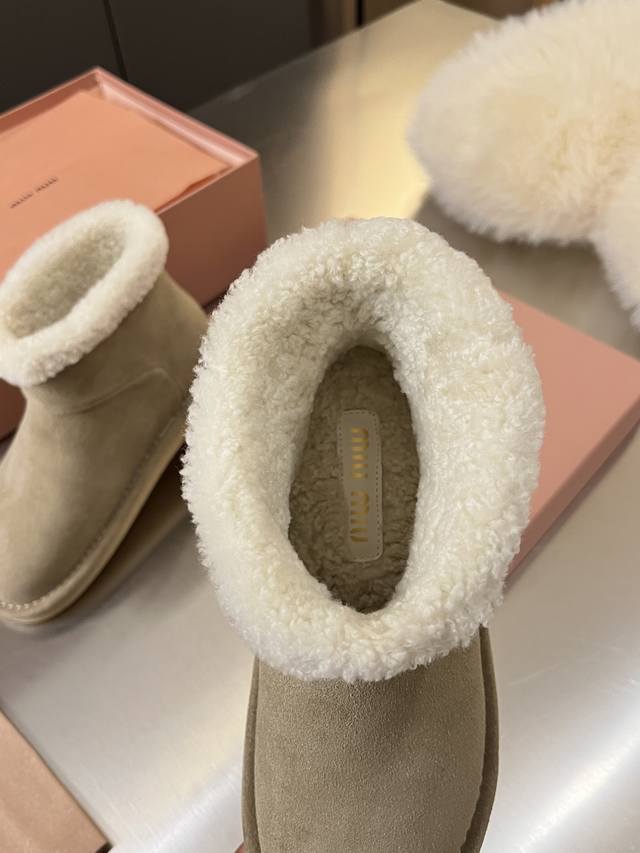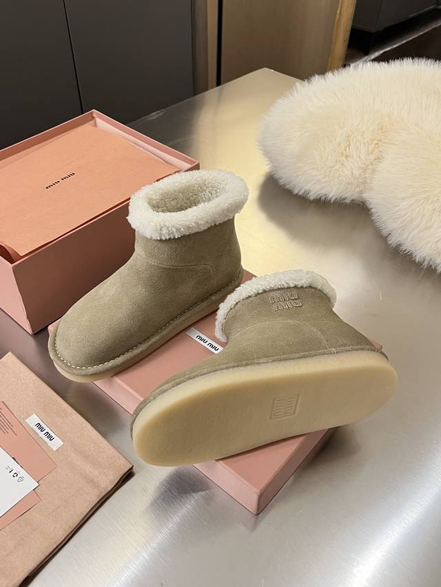 Miumiu Autumn/Winter Runway New Pure Wool Snow Boots Original 1:1 Edge-wrapped High-End Version A warm choice for sweet and cool girls in winter. Snow boots reach a new level of sweetness and coolness. From the design to the details, they perfectly balance girlishness and warmth. The silky cow suede material has a delicate and high-end feel. The woolen trim at the shoe opening is fluffy and soft, visually "warm" and can also modify the ankle line, making the calves look slimmer.
