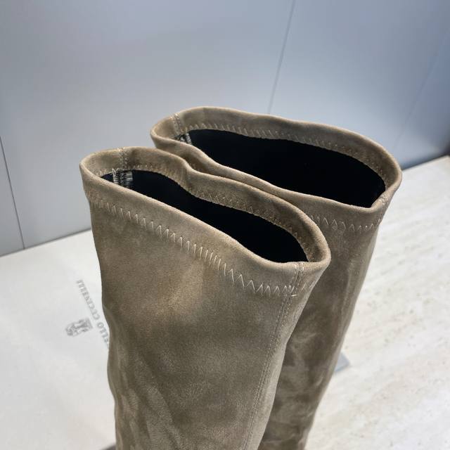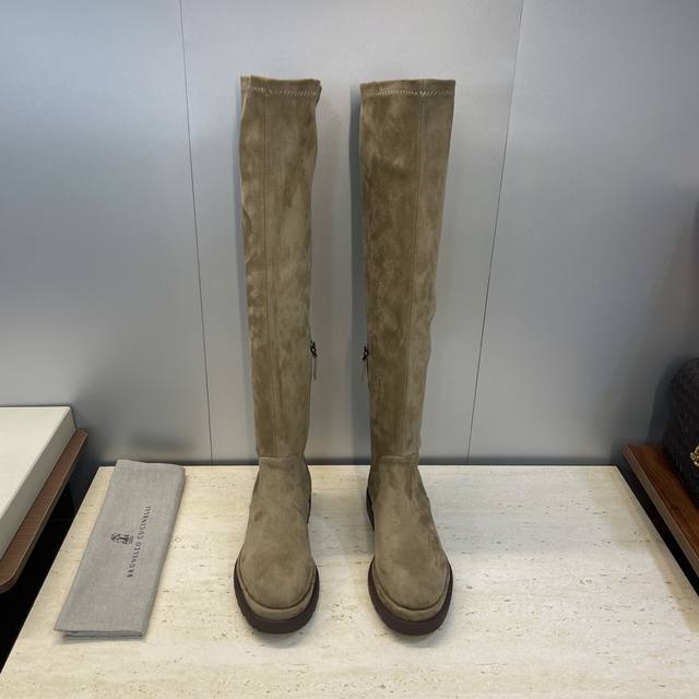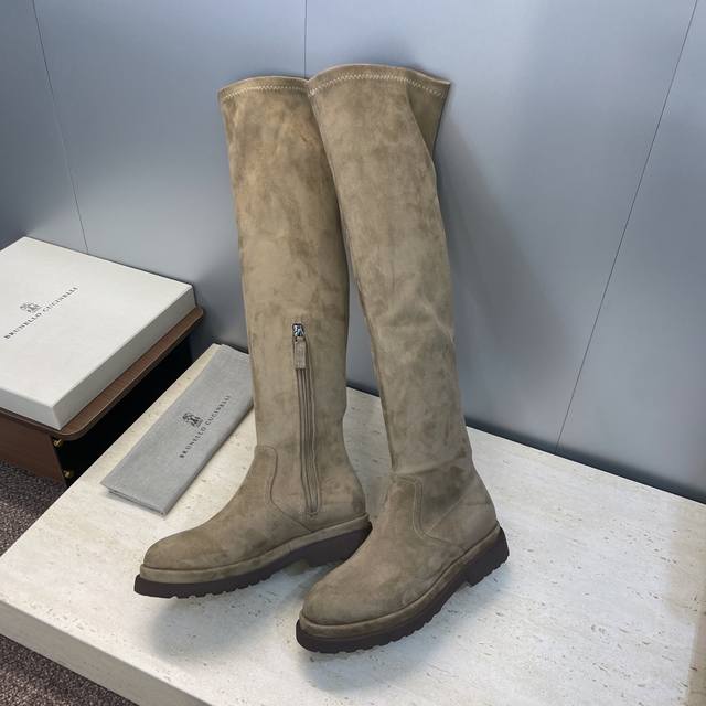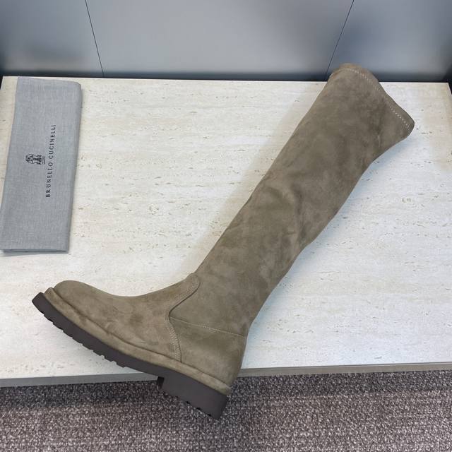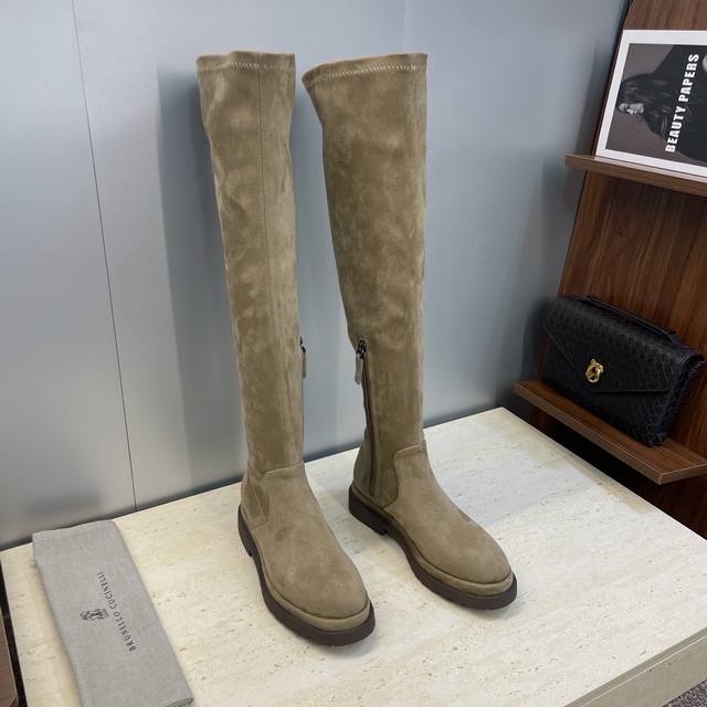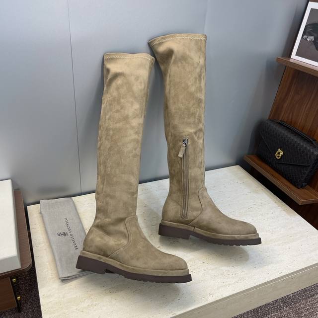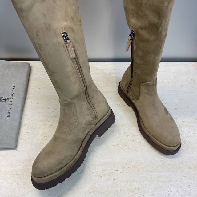 Brunello Cucineli 2025 Autumn/Winter New Nomadic Style Warm High-Top Women's Boots Bc Thick Sole Round Toe Side Zipper Slip-on Over-the-Knee Elastic Motorcycle Rider Boots