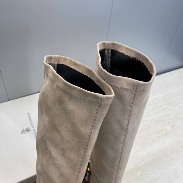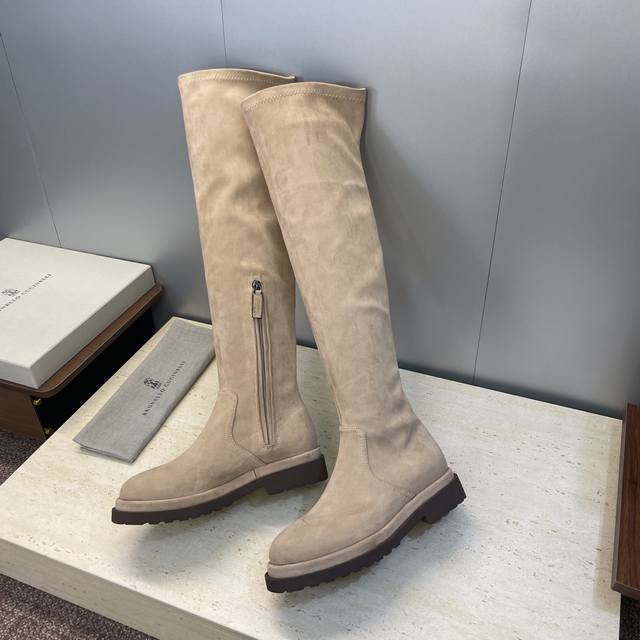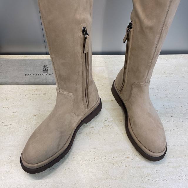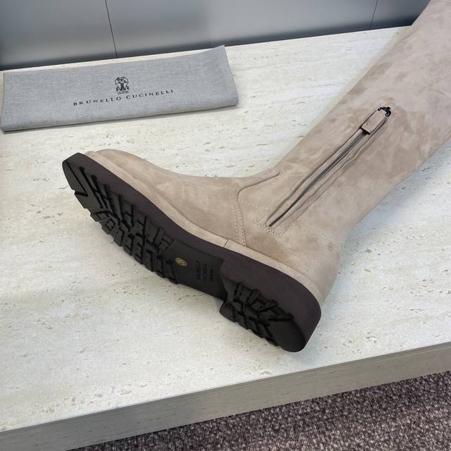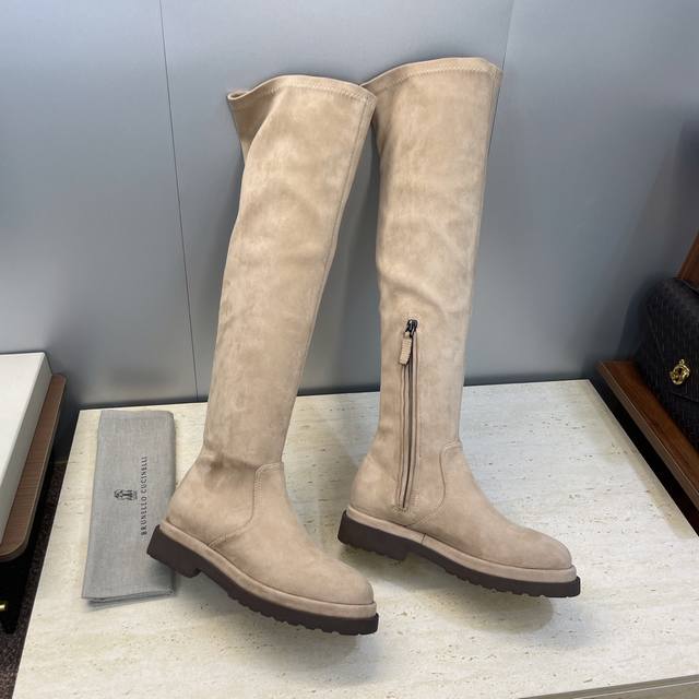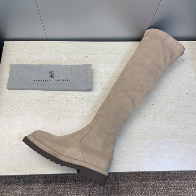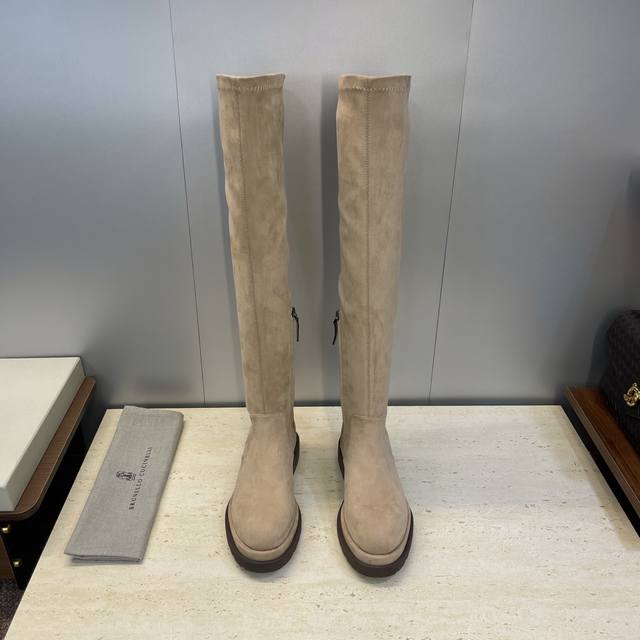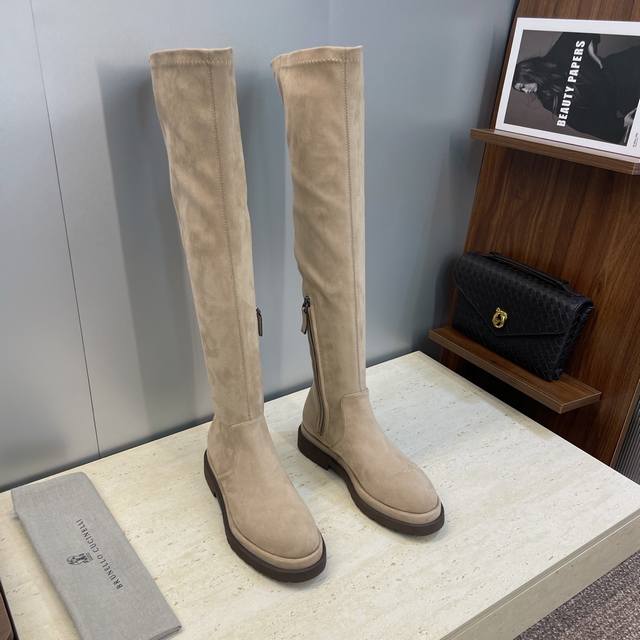 Brunello Cucineli 2025 Autumn/Winter New Nomadic Style Warm High-Top Women's Boots Bc Thick Sole Round Toe Side Zipper Slip-on Over-the-Knee Elastic Motorcycle Rider Boots