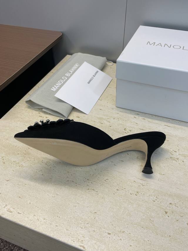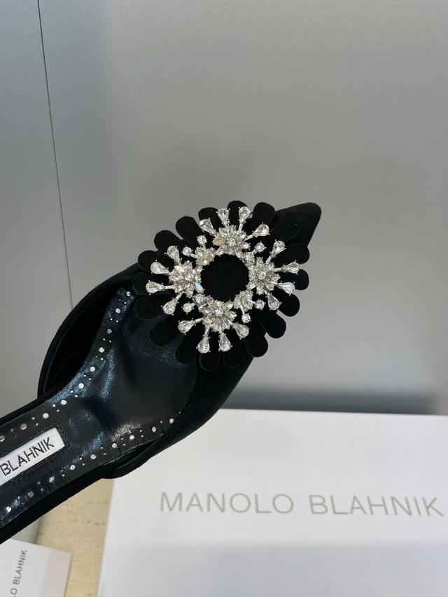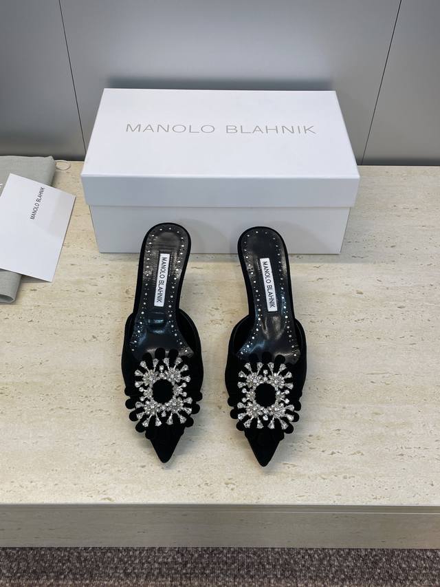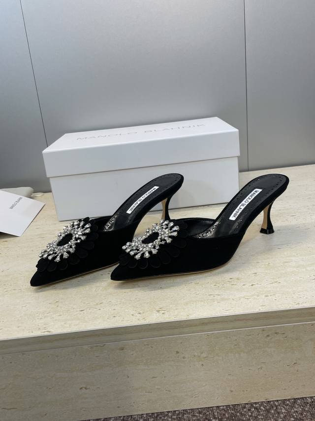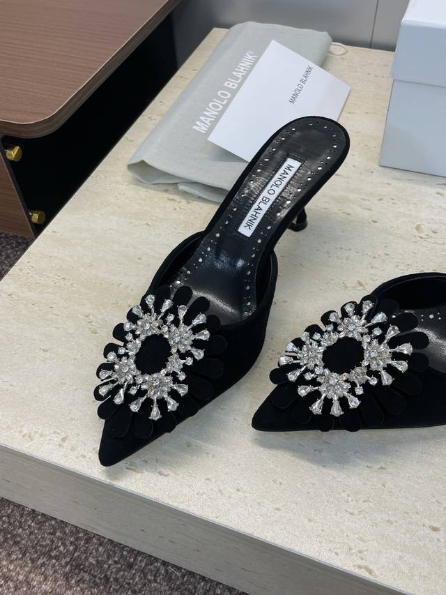 Manolo Blahnlk 2025 Spring/Summer New Mid-Heel Women's Shoes Mb Pointed Toe Rhinestone Flower Mule Sandals
