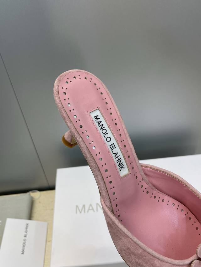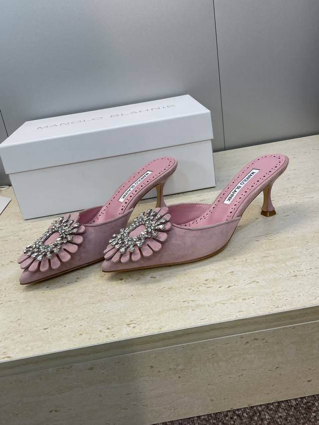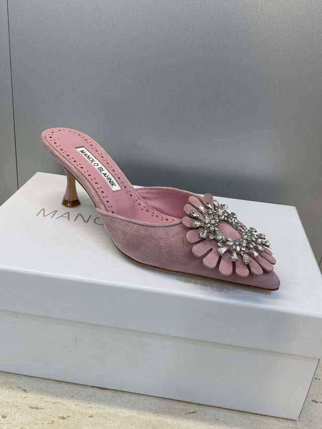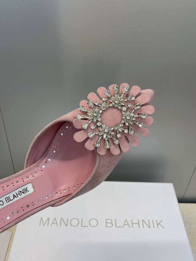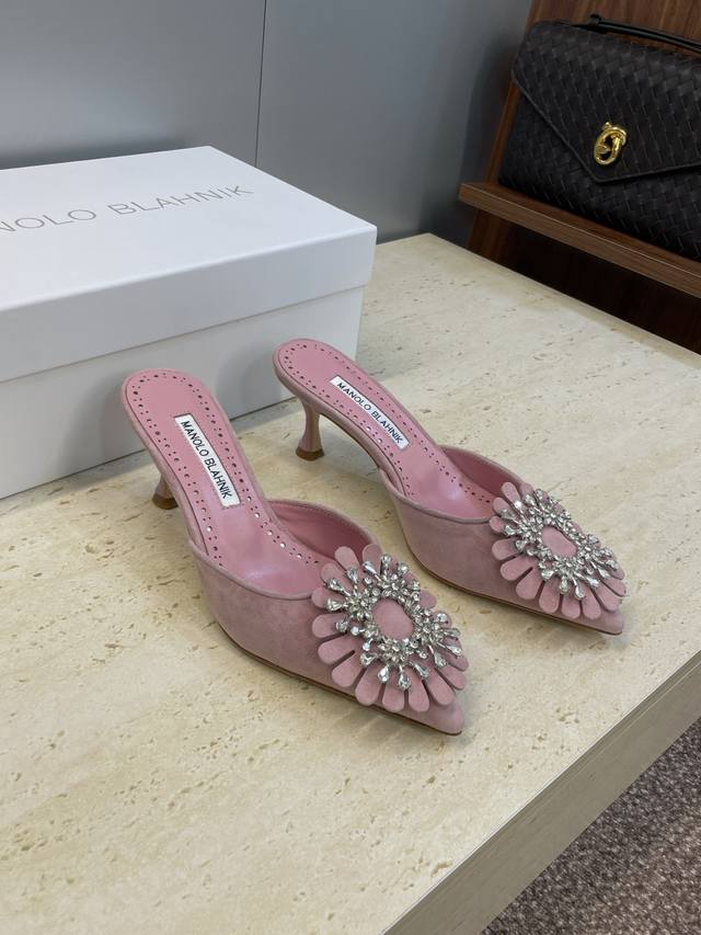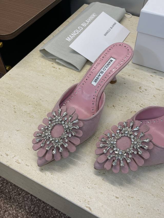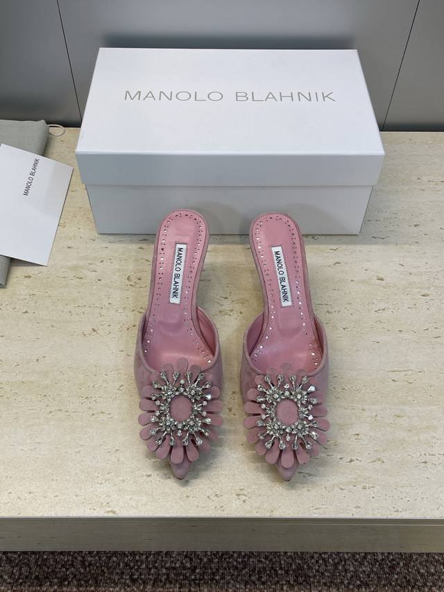 Manolo Blahnlk 2025 Spring/Summer New Mid-Heel Women's Shoes Mb Pointed Toe Rhinestone Flower Mule Sandals