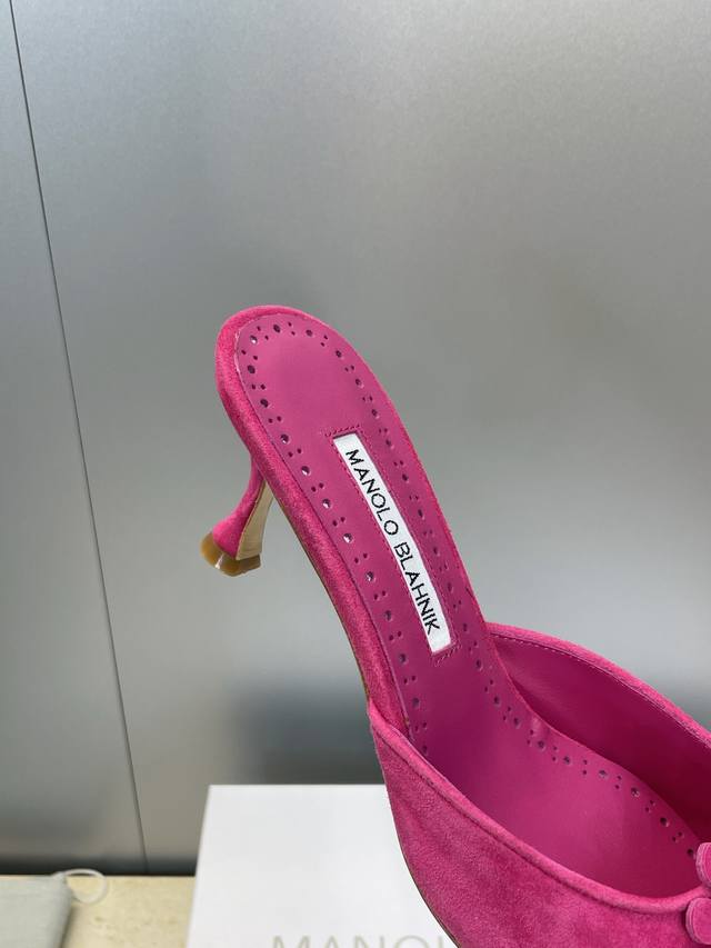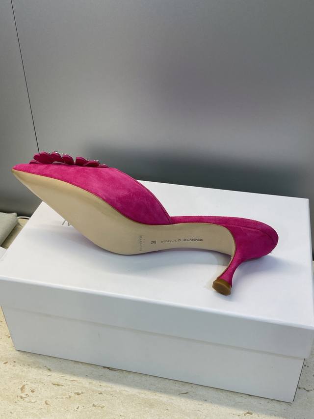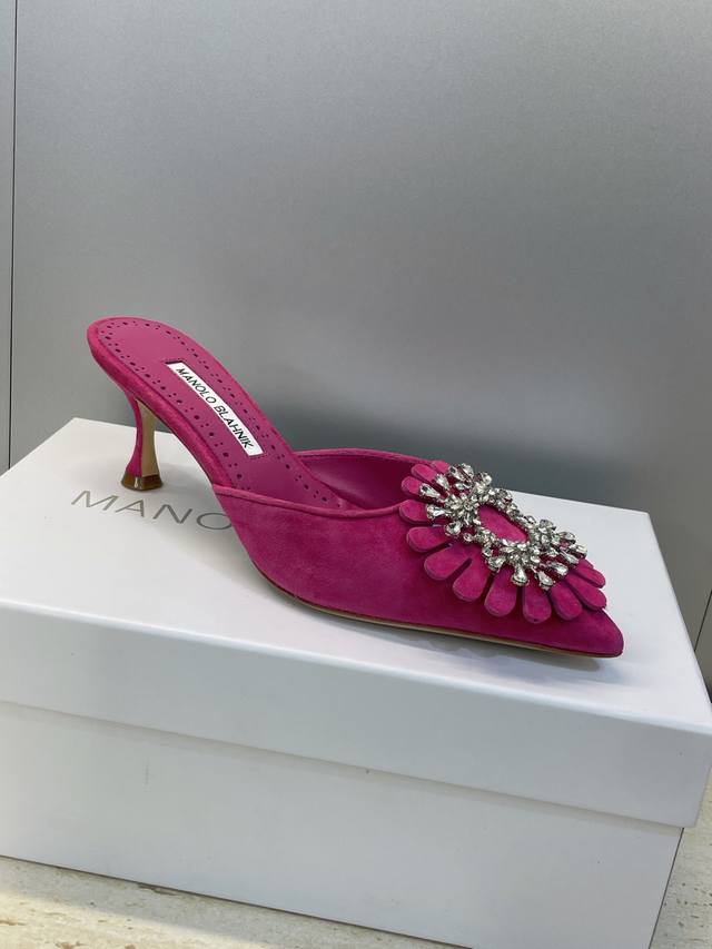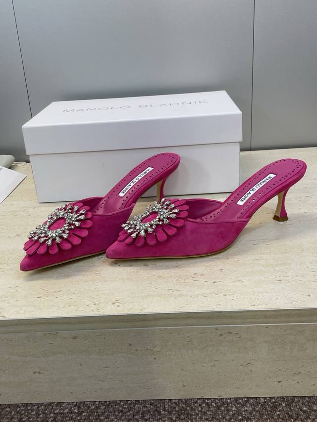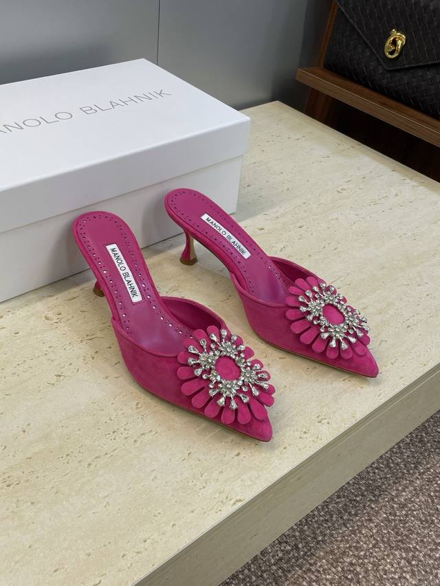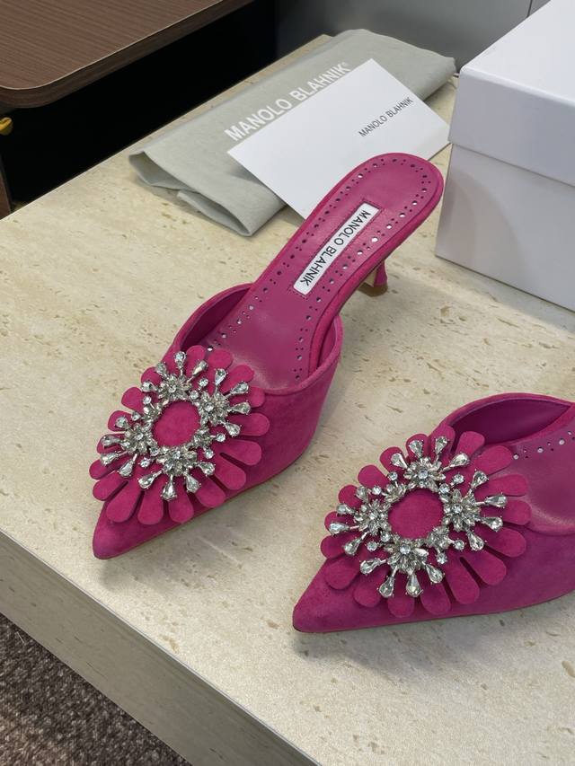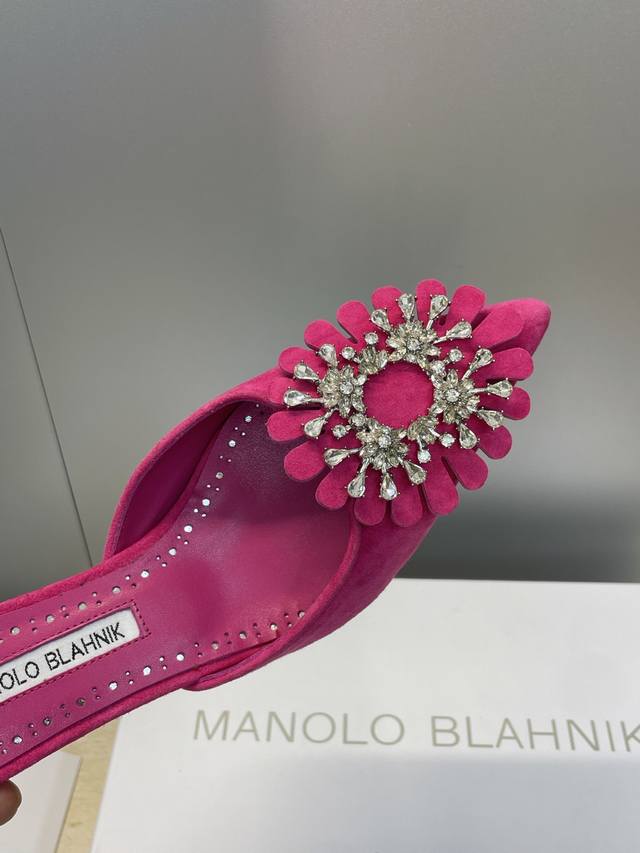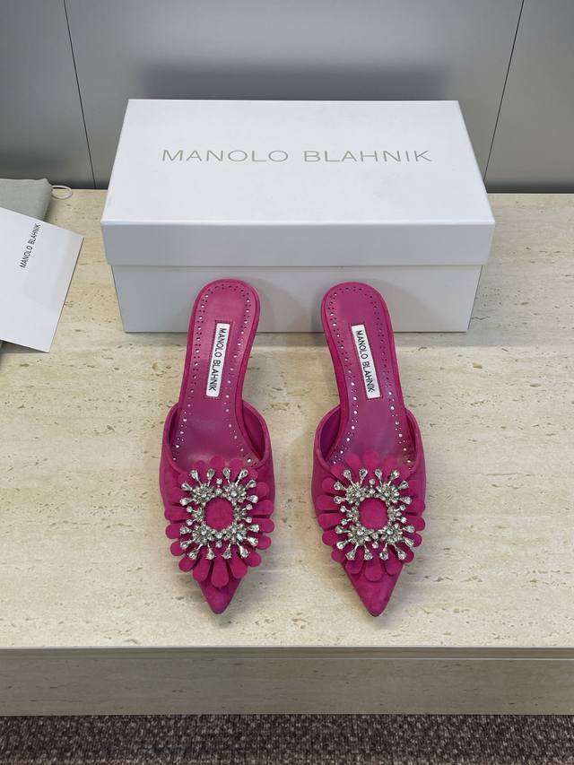Manolo Blahnlk 2025 Spring/Summer New Mid-Heel Women's Shoes Mb Pointed Toe Rhinestone Flower Mule Sandals