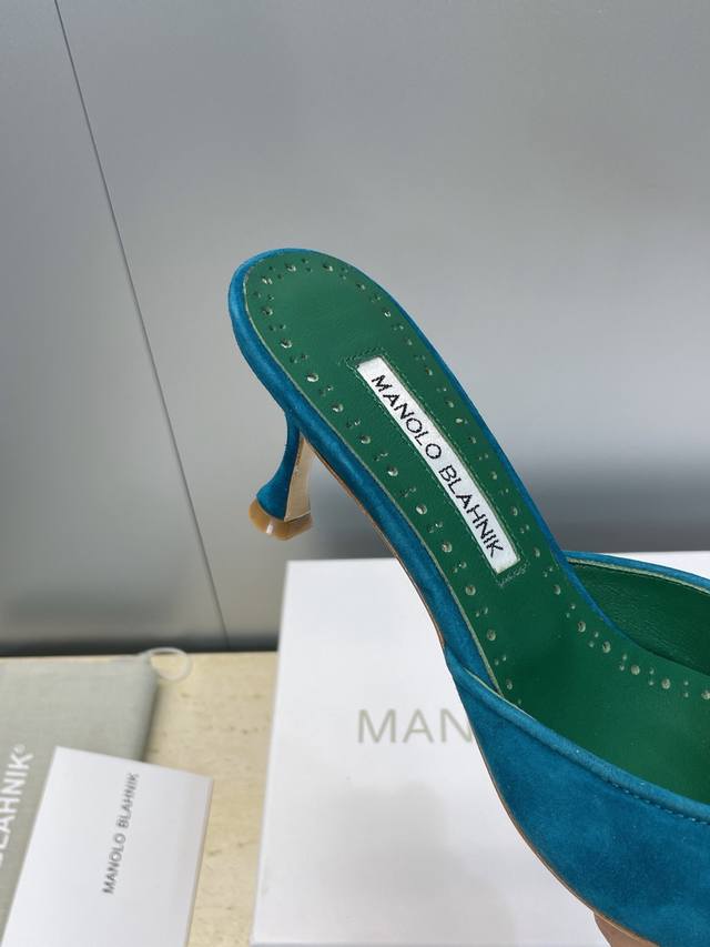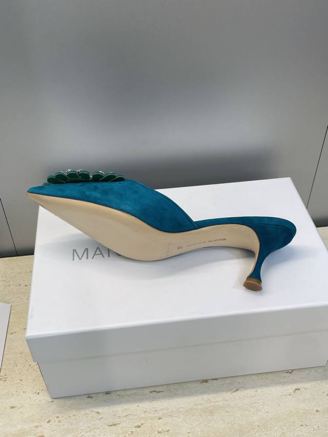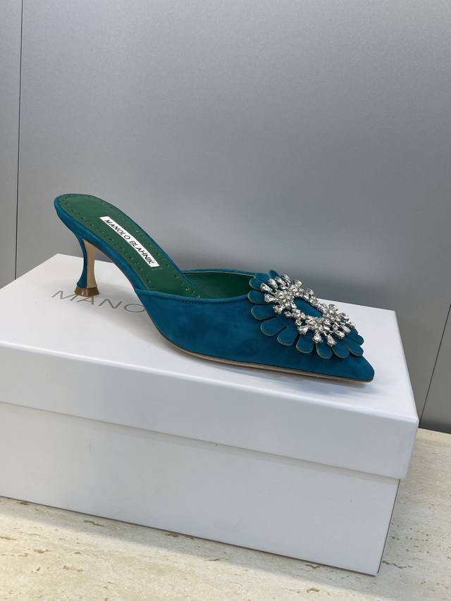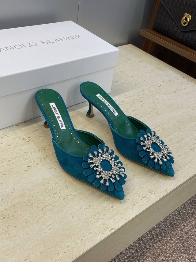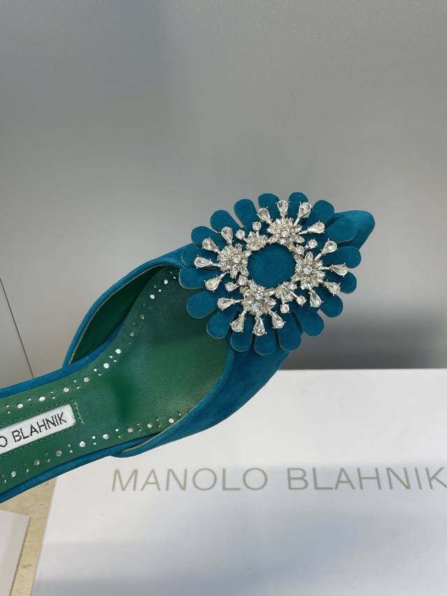 Manolo Blahnlk 2025 Spring/Summer New Mid-Heel Women's Shoes Mb Pointed Toe Rhinestone Flower Mule Sandals