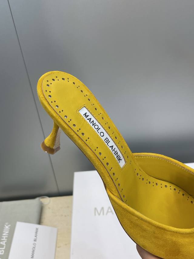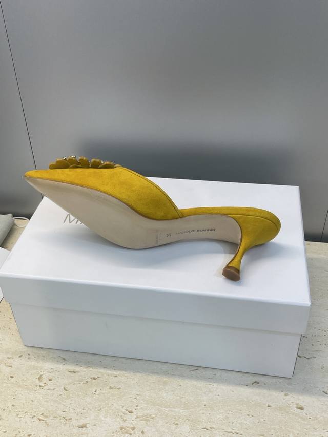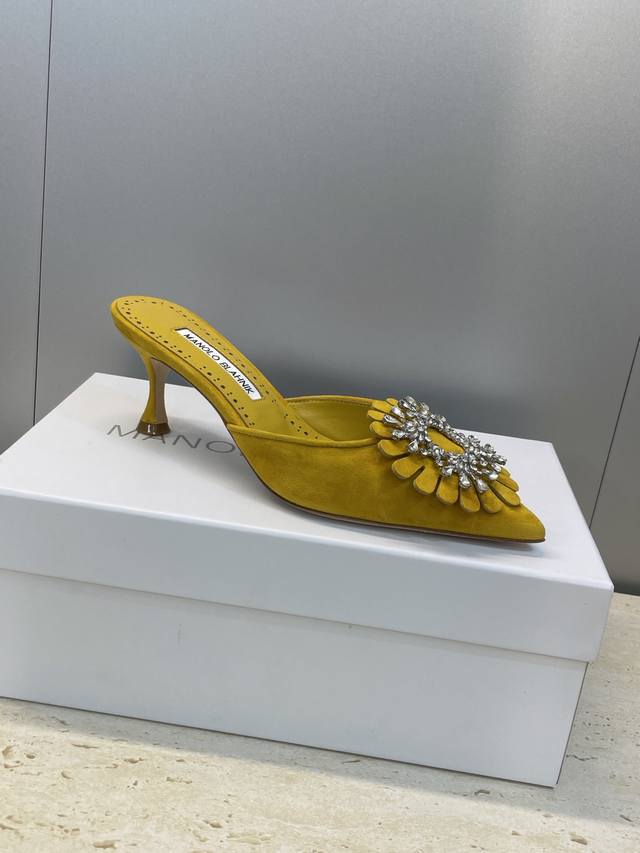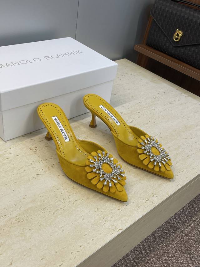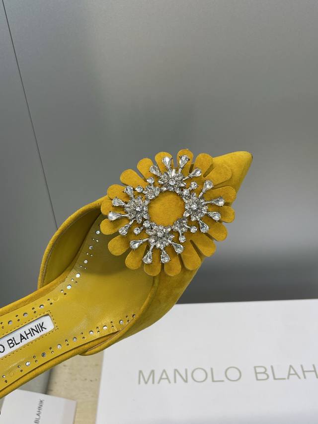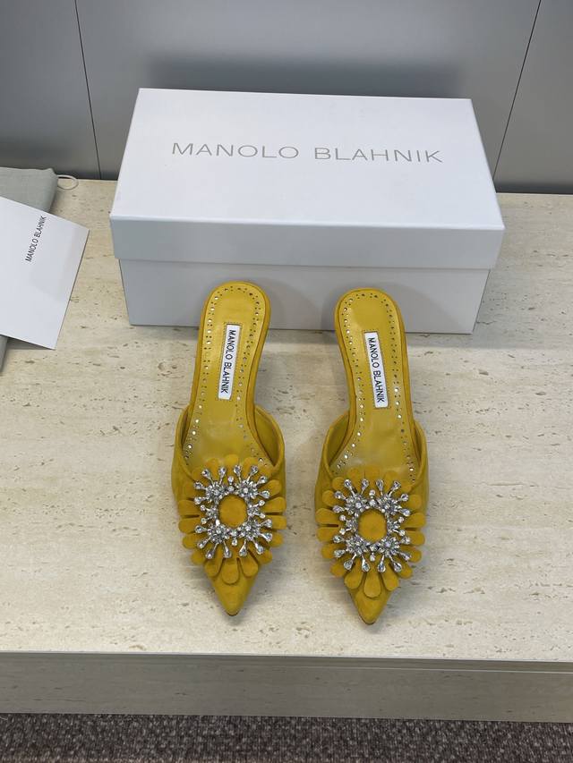 Manolo Blahnlk 2025 Spring/Summer New Mid-Heel Women's Shoes Mb Pointed Toe Rhinestone Flower Mule Sandals