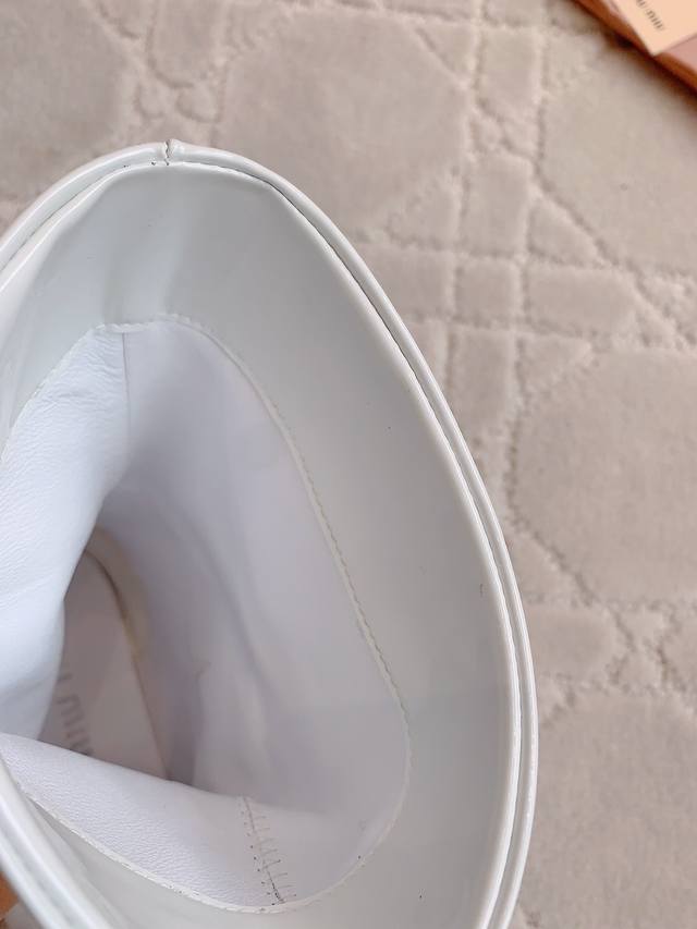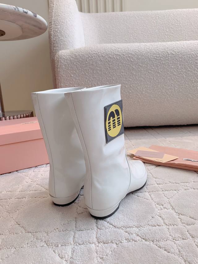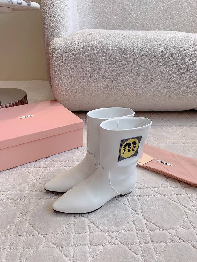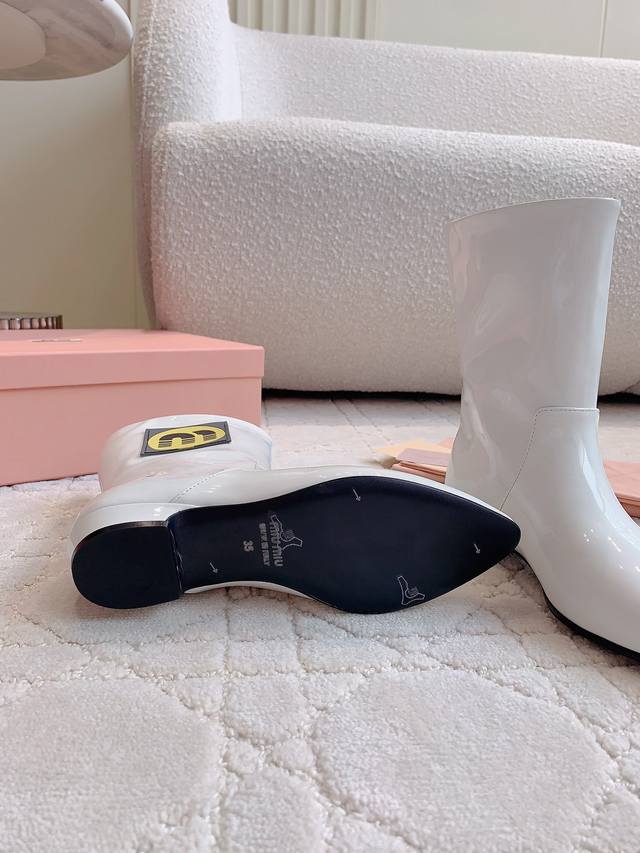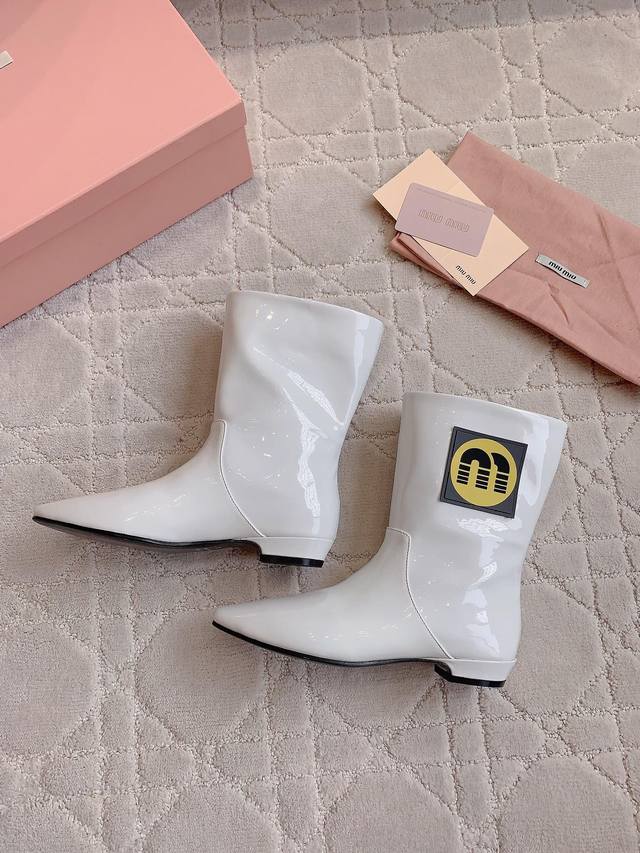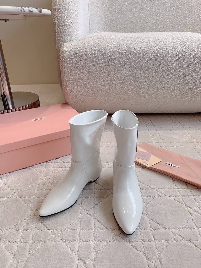 Miu's new patent leather ankle boots are super soft and comfortable to wear. They are fashionable and good-looking. They make your legs look thinner and create a relaxed feeling.