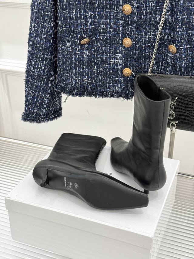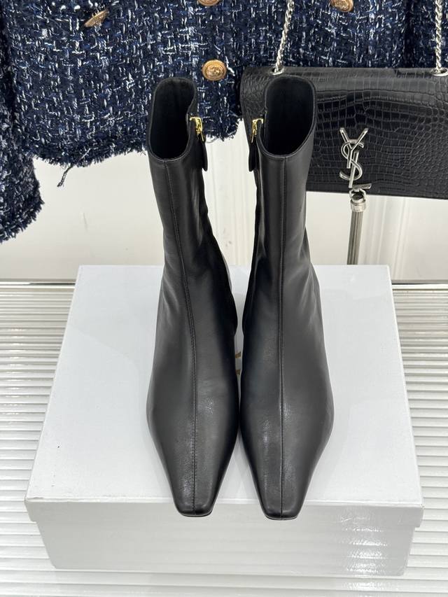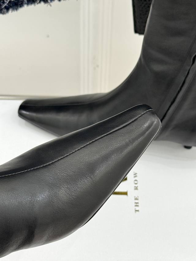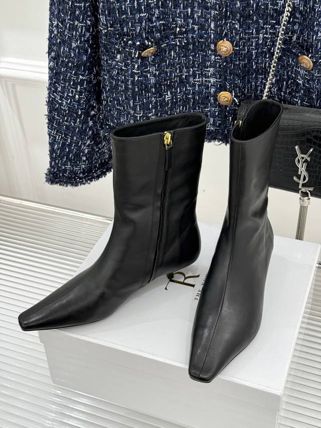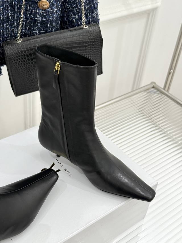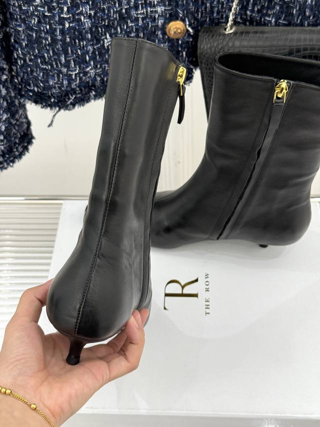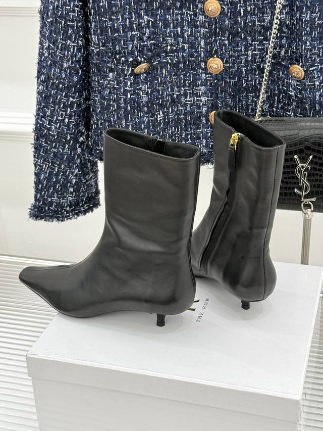 The Row's classic autumn/winter kitten heel boots with a small square toe. These ingeniously designed boots combine the formality of a square toe with a subtle, rounded design for a smooth, natural feel. They visually enhance the foot's shape, creating a more delicate and refined look while adding a touch of casual elegance. A trendy trend in the fashion world, these boots are a perfect fit. The kitten heel offers just the right amount of height, showcasing a woman's graceful figure while ensuring comfort and stability, making them effortless and effortless for everyday commutes. Whether paired with a simple dress for a soft and elegant look or a pair of smart trousers for a sharp, stylish look, they're the perfect finishing touch to any outfit, ensuring you exude confidence and charm in every situation.
