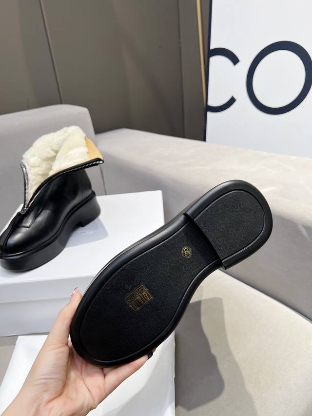 Factory price: The Row's classic thick-soled ankle boots for fall and winter. The same style worn by Liu Wen, and seen on numerous celebrities, these boots are truly original and have been carefully restored. The upper is custom-made from imported calfskin, with a soft, mixed-breed sheepskin lining. The front zipper design is simple and stylish! They're incredibly comfortable and practical. The molded, one-piece PU foam sole is just as light and soft as the original! Original matching set. Sizes 35-40 and 41 are customizable and non-refundable.