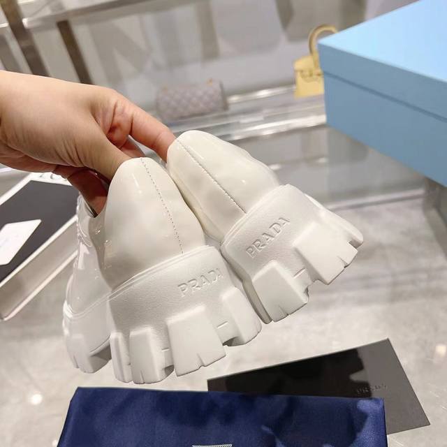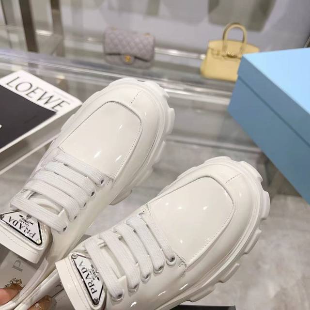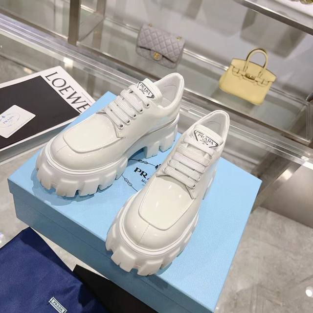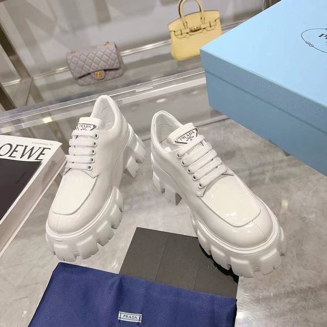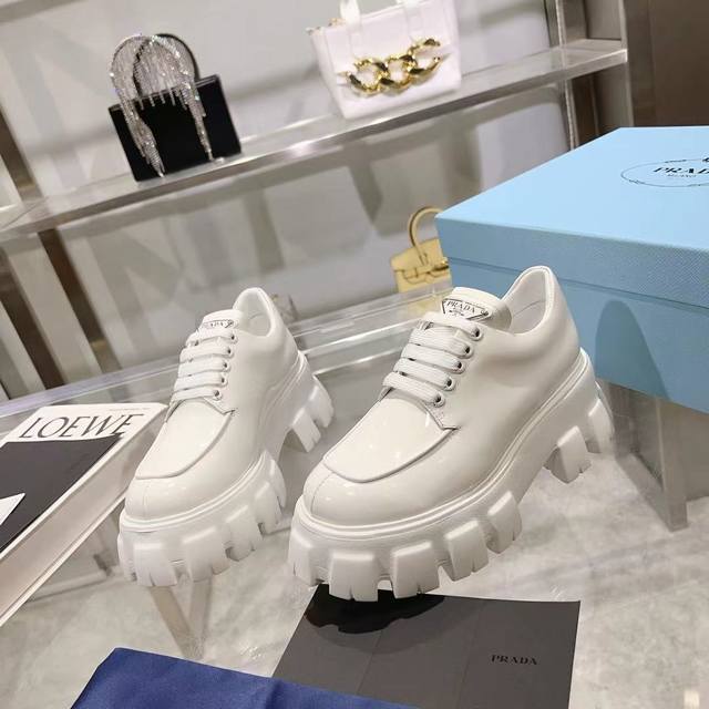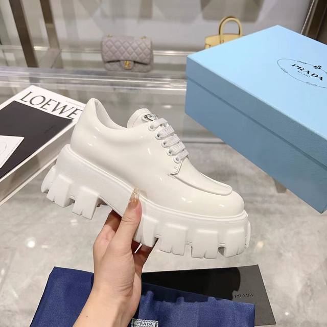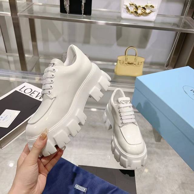 Factory Price: This novel and avant-garde lace-up shoe embodies the dualistic concept rooted in the brand's aesthetics. A distinctive, modern platform sole is paired with a meticulously crafted glossy leather upper. The Monolith series blends contradictory imagery, achieving harmony through mix-and-match to create a timeless silhouette. Features include: upper with toe cap piping and enamel eyelets; leather lining; enamel metal triangle logo; lace closure; 5.5cm rubber outsole; textured outsole pattern; four colors; sizes 35-41.