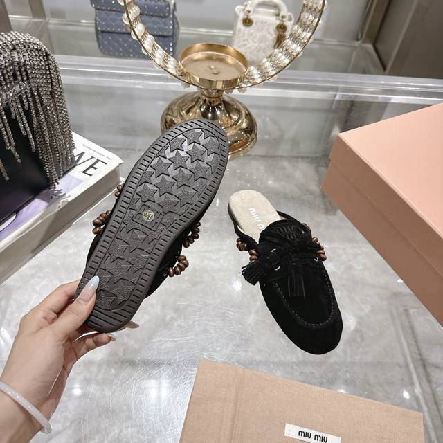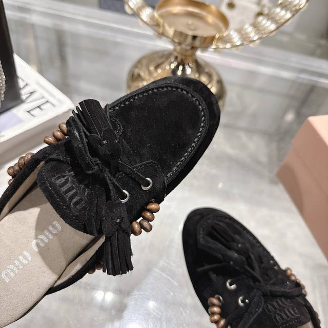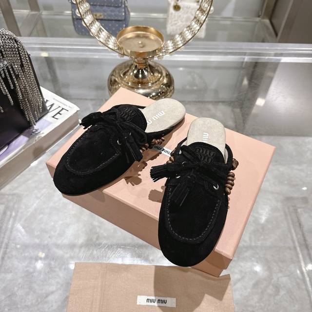 Factory slippers 50Miu Miu lace-up eyelet flats. Miu Miu 25 new fall/winter slip-on retro shoes. Playful lace-up tassels. Retro dry, different-color, brushed lining for a more comfortable and stylish look. Extremely versatile. Simple, high-end lining with sheepskin lining. Original outsole. Sizes 35-40. 40 custom