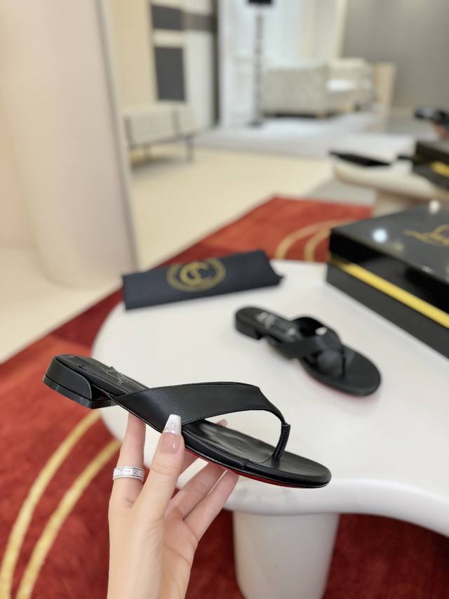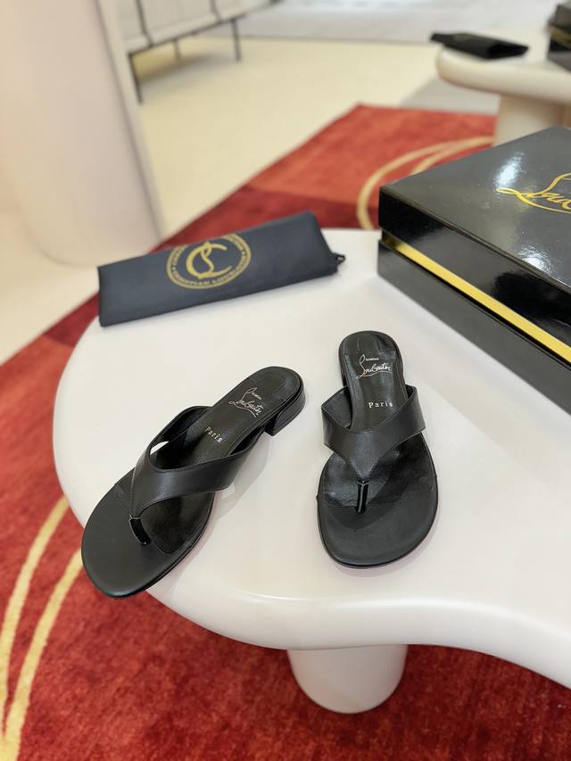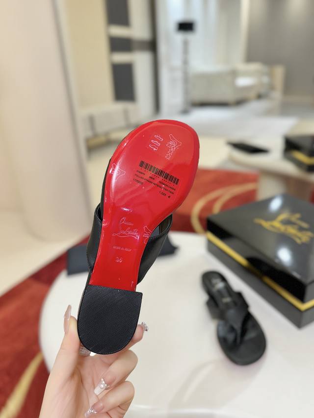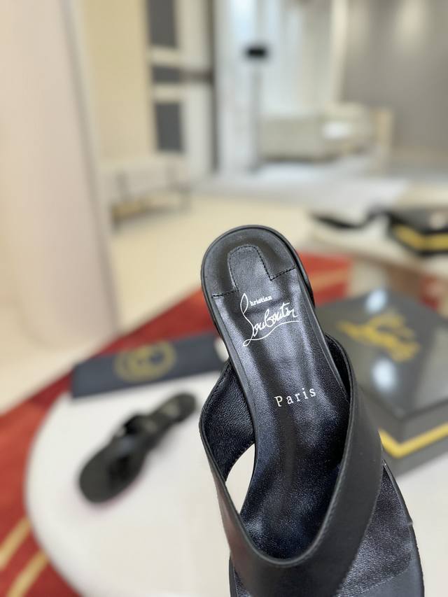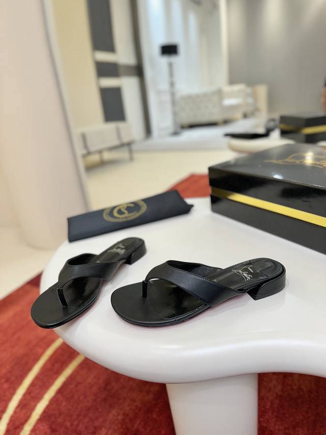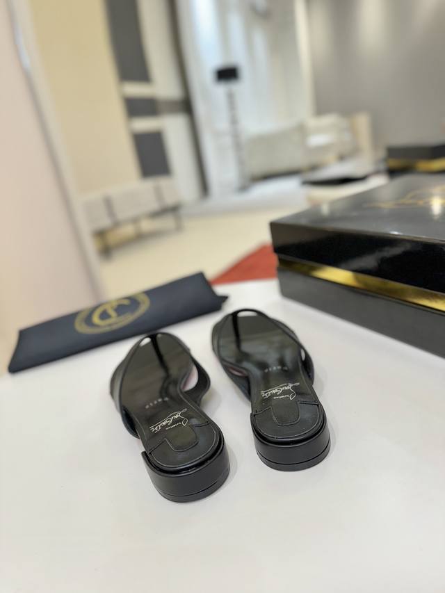 Flip-flop Janetonga Thongs feature a striking square 55mm slanted heel. Crafted from black wool-nappa leather, these Maison Christian Louboutin sandals showcase a V-shaped strap that subtly secures the foot, offering a stylish and timeless design. Sizes: 34-42 (34, 40, 41, 42. Custom orders are non-refundable and non-exchangeable). Heel height: 5.5cm. Colors: Black and White.