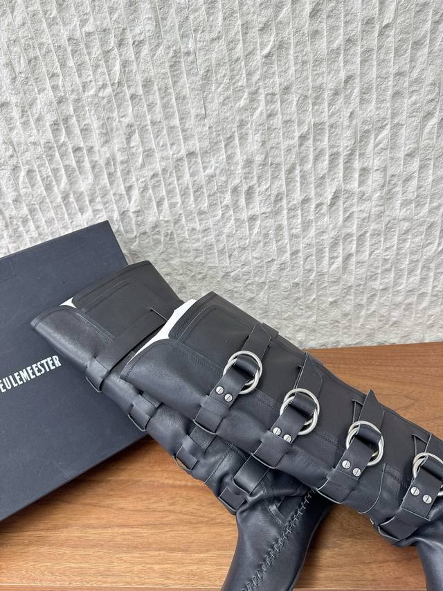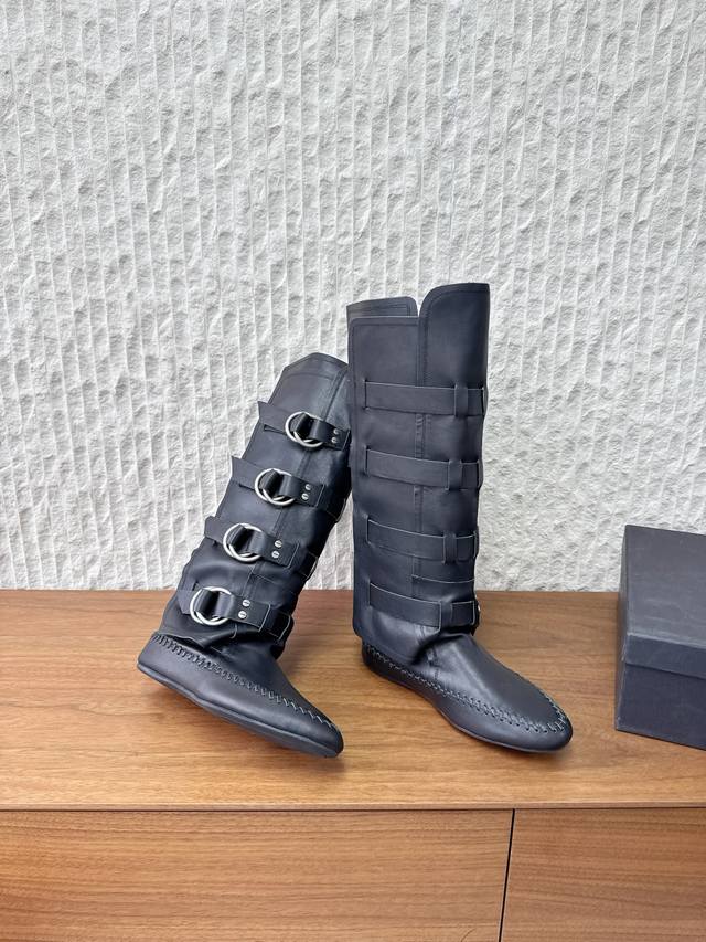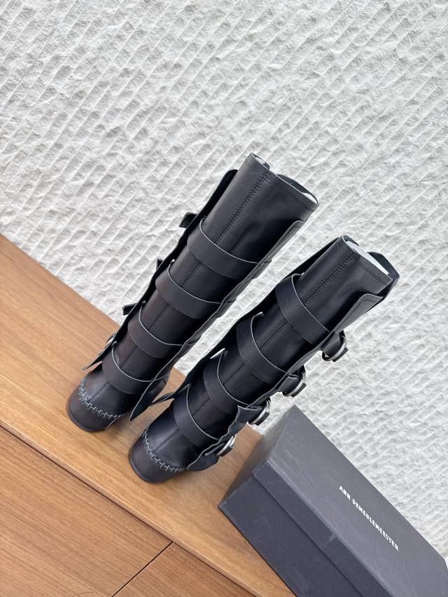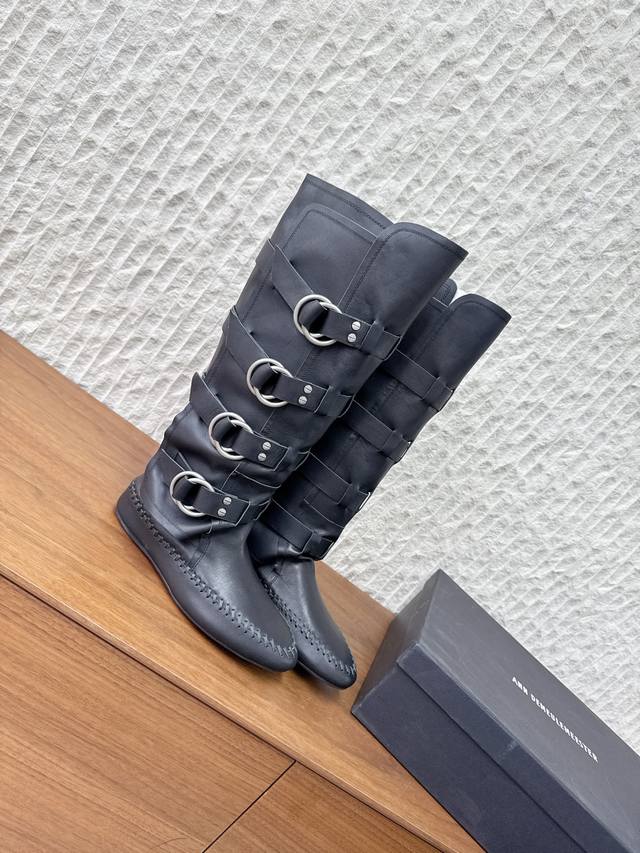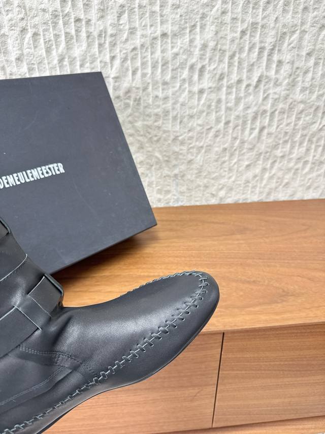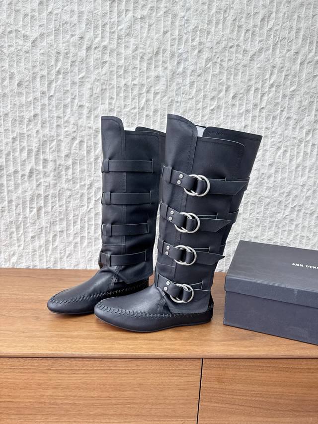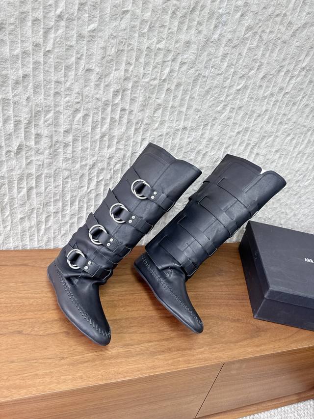 G101 Ann Demeulemesster, a niche streetwear brand, presents its new Fall/Winter 2025 buckle-front ankle boots. Antwerp Creative Director Stefano Gallici draws inspiration from the "nomadic spirit," blending the brand's signature dark romantic DNA with 70s hippie, motorcycle culture, and the American Southwest. This collection perfectly interprets the image of a "rebellious poet crossing the desert with a book of poems" through the collision of deconstructed tailoring and romantic ruffles, frayed edges, and layered, seemingly chaotic textures. The bags and footwear also maintain avant-garde design highlights, intertwining 19th-century romanticism with 90s rock aesthetics to create a unique aesthetic language that combines Antwerp's pioneering spirit with the free spirit of the American West. Upper: Original imported cowhide; Insole: Cowhide; Outsole: Original custom rubber outsole; Size: 35-40; 40.41: Custom orders are non-refundable.