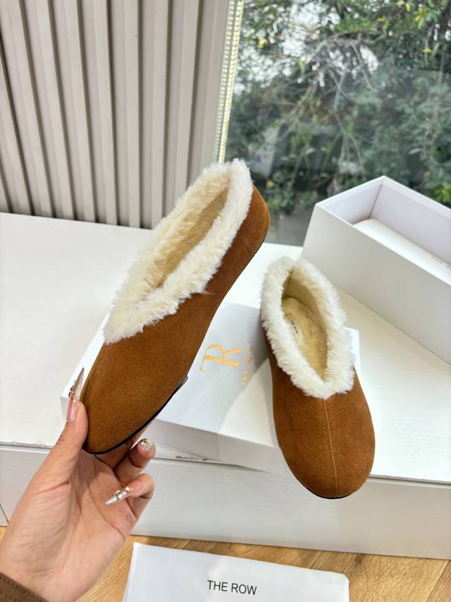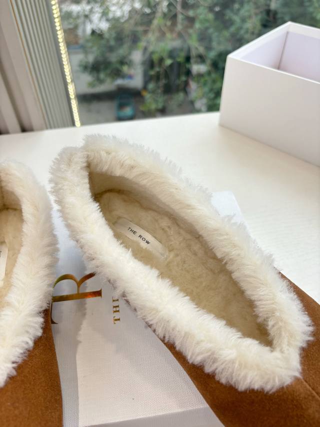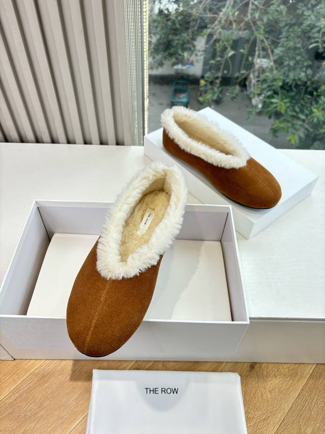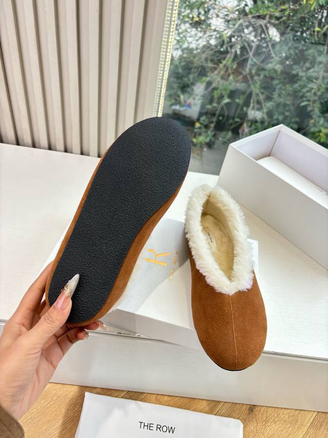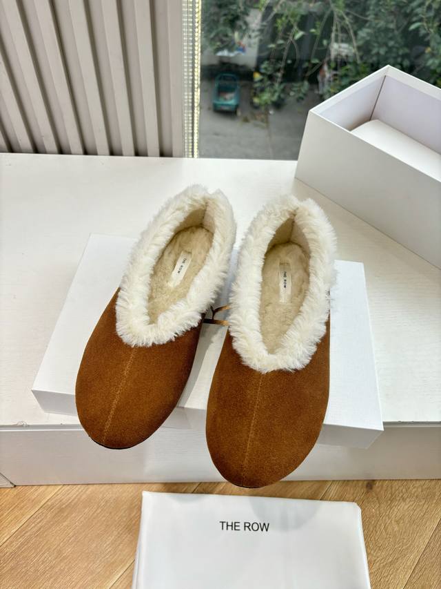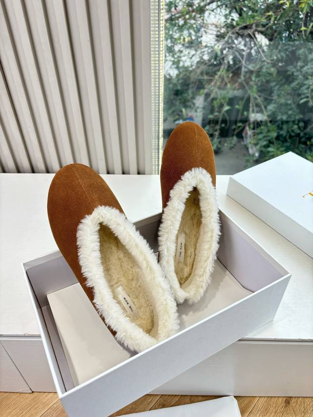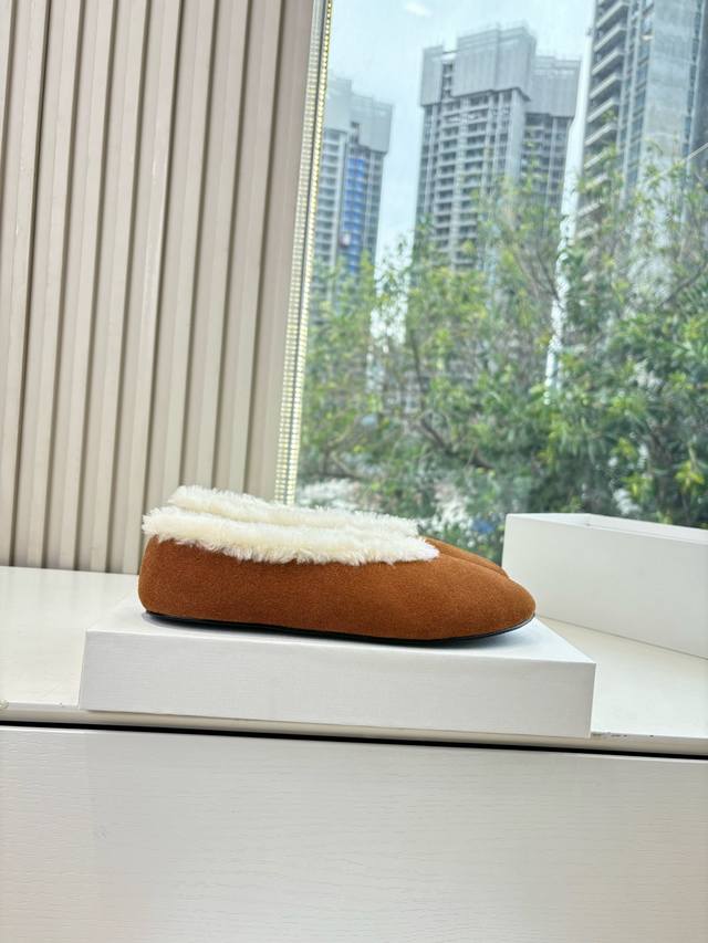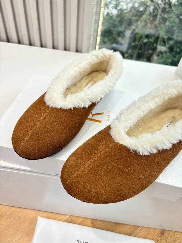 G679 What you see is what you get. The Row 25Wf New Retro Furry Shoes. These double furry shoes interpret the "stay-at-home sophistication" of autumn and winter with the brand's signature minimalist aesthetic. The upper is wrapped in soft, dense wool fleece. Low-saturation apricot tones, such as caramel, echo the Maillard style of autumn and winter. The clean lines without unnecessary embellishments allow for a gentle atmosphere whether paired with a knitted maxi dress or jeans for a casual and relaxed feel. The fleece warmth balances elegance and comfort, making every step feel like walking on clouds. It embodies the contemporary lifestyle aesthetic of "wanting to go out but also loving to stay home." Material: Imported cowhide. Lining: Wool for the toe box. Original design: Custom-made anti-slip outsole. Size: 35-39, 40-41 (custom sizes available).