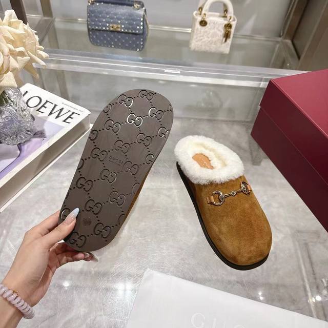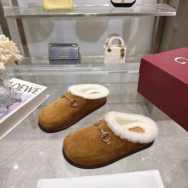 Gg Mule Wool Slippers are meticulously crafted from high-gloss cow suede! A modern interpretation of the brand's classic elements. The iconic horsebit buckle is presented in a light gold tone. Features include full merino wool insole and a wool-lined rubber non-slip sole. Women's sizes 35-40. Factory direct.