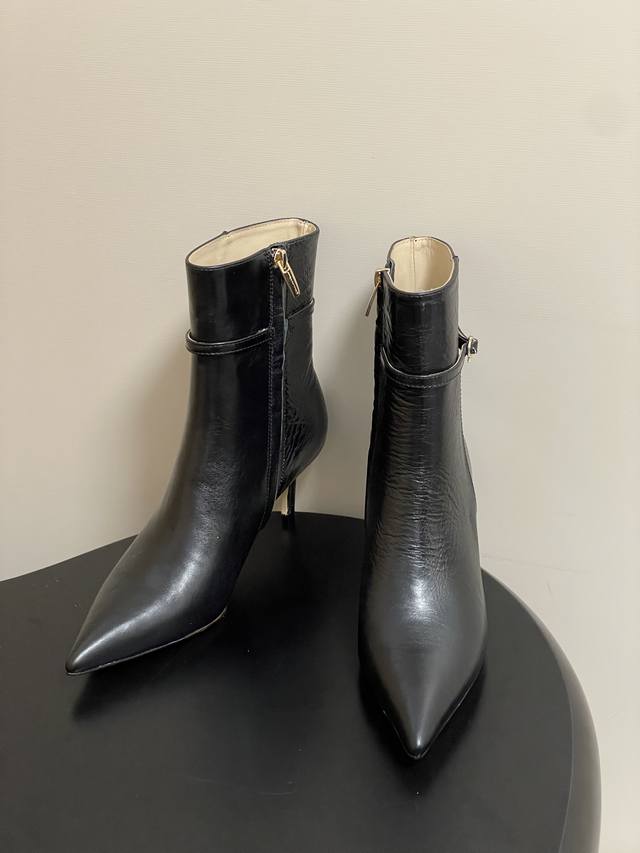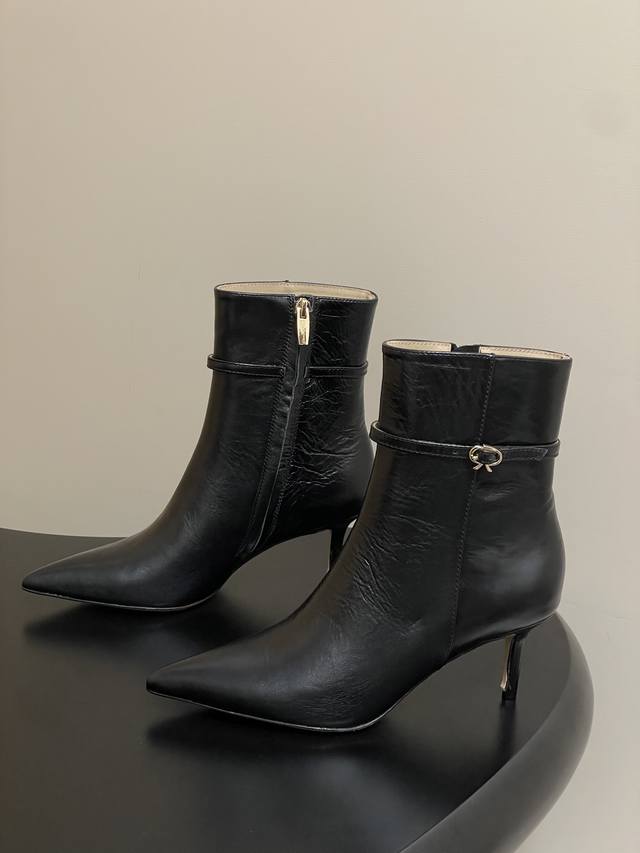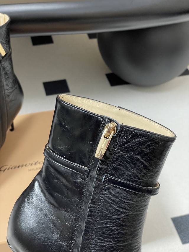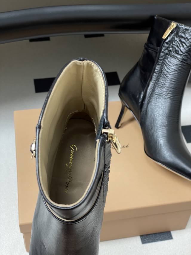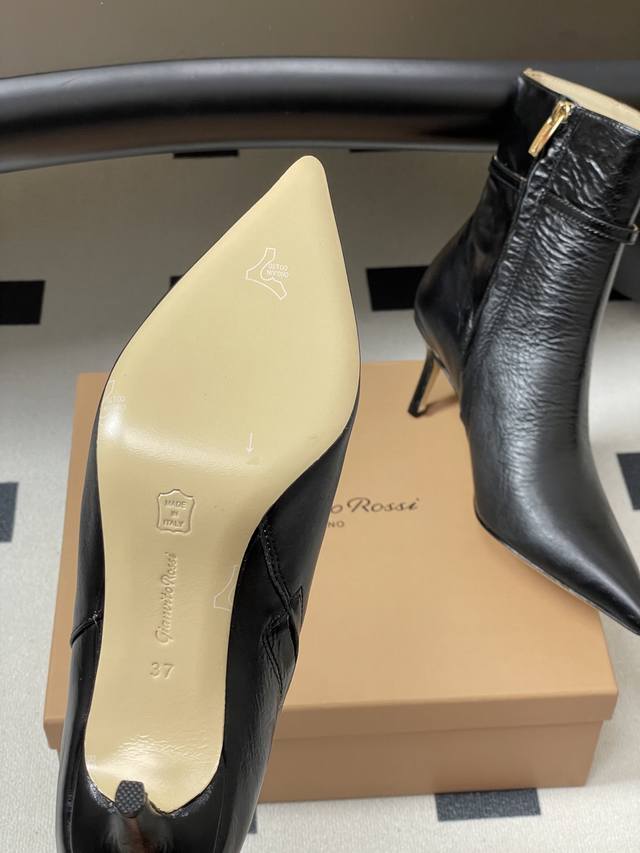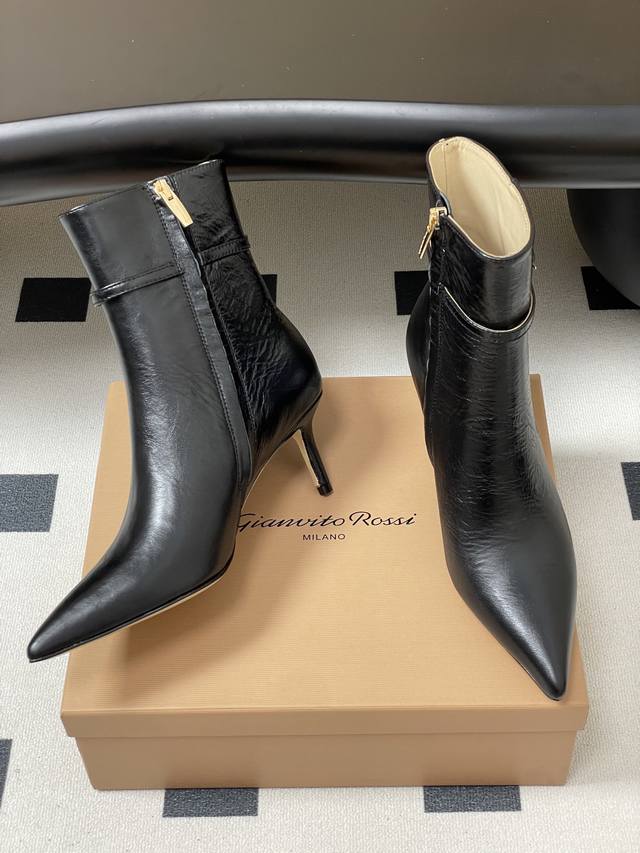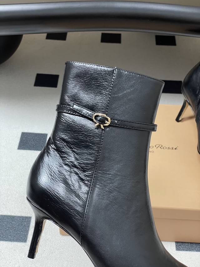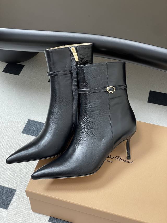 Gianvito Rossi 25S Autumn/Winter New Style Rossi Gr Pointed Toe Ankle Boots with Side Zipper and R Buckle Stiletto Heel. The upper is made of suede, soft and delicate in texture, exuding a luxurious and sophisticated feel while adding a touch of retro elegance to the overall look. The classic pointed toe design naturally elongates the leg line and flatters the foot shape, making it a timeless "leg-lengthening" weapon. The moderate shaft height places it in the ankle boot category, suitable for various trousers such as jeans and skinny jeans, or skirts such as dresses and skirts, making it versatile for various occasions. A horizontal stripe runs along the side of the shoe, adorned with a variation of the brand's iconic metal buckle 'R' element. Metal accessories are often used to enhance the luxurious feel, adding exquisite details and recognizability to the simple boot design.
