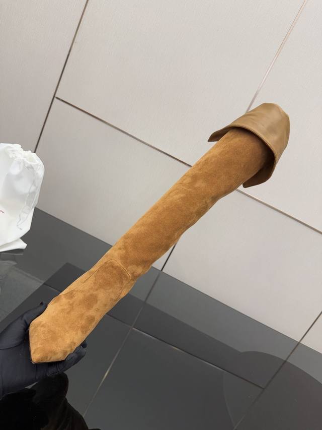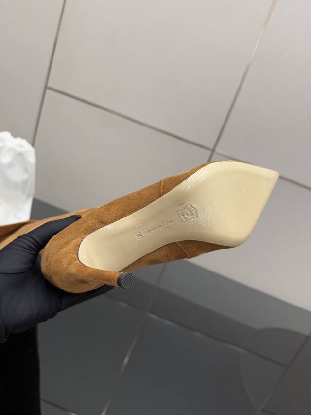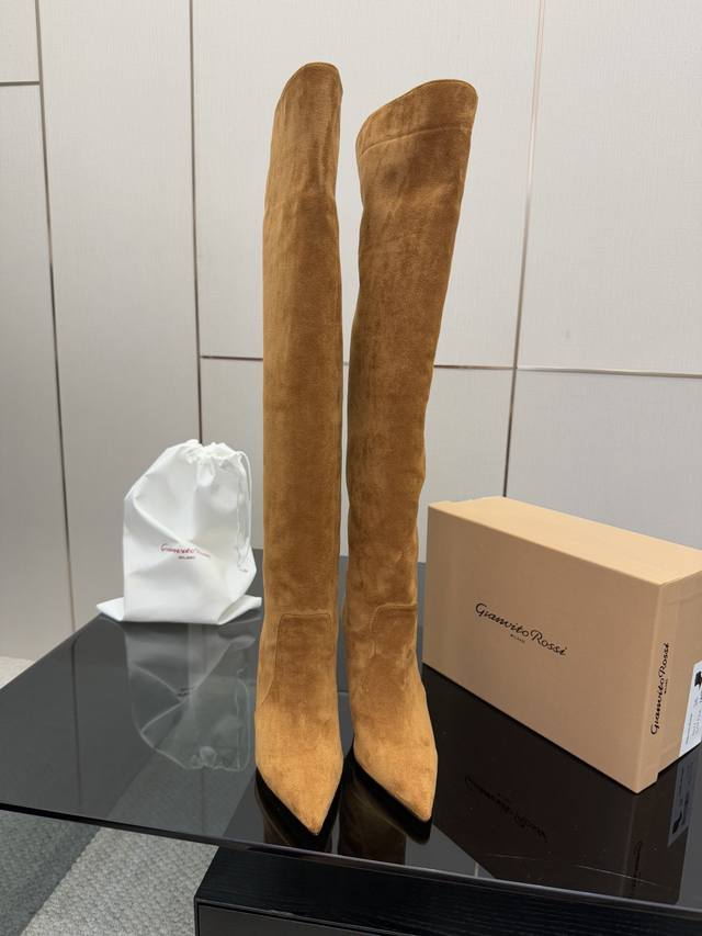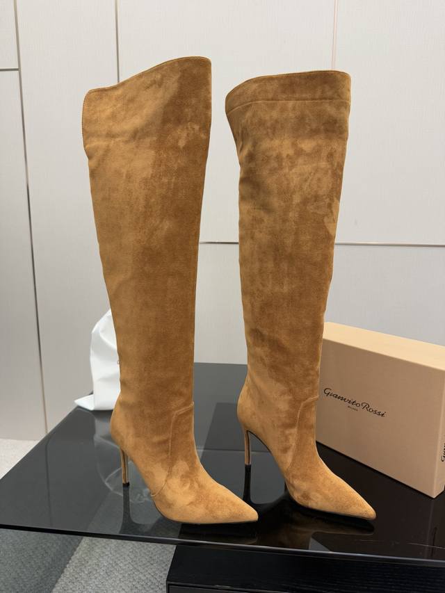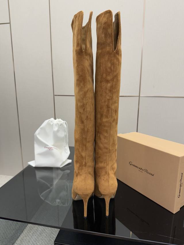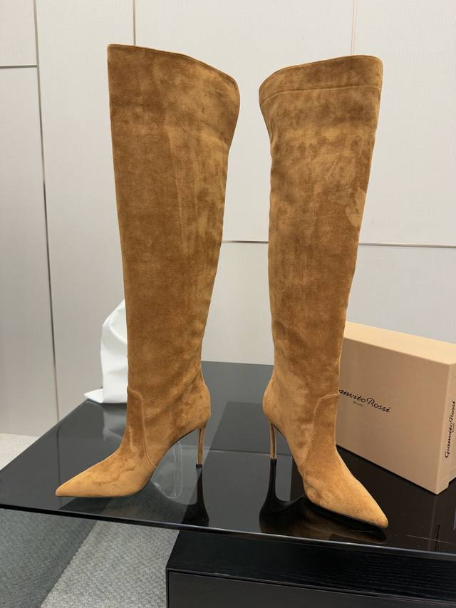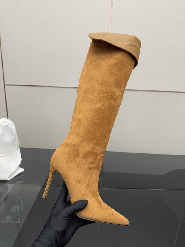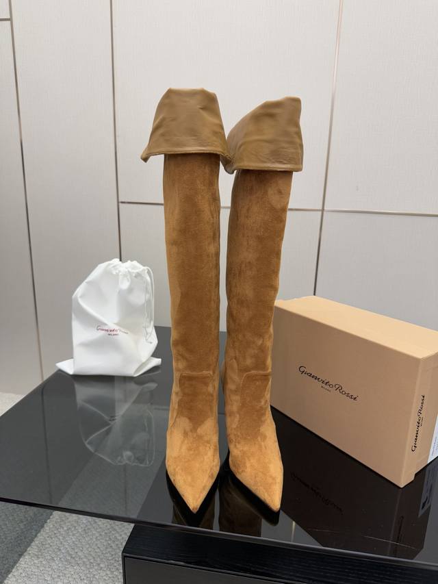 Gianvito Rossi pleated high-heeled boots, beige suede upper, pointed toe design to elongate legs, pleated shaft to flatter the calf curve. Brand new with box, heel height approximately 9.5cm, sheepskin lining, Italian genuine leather outsole, comfortable and easy to walk in. Brand new, sizes 35-39, size 40.41, custom made.