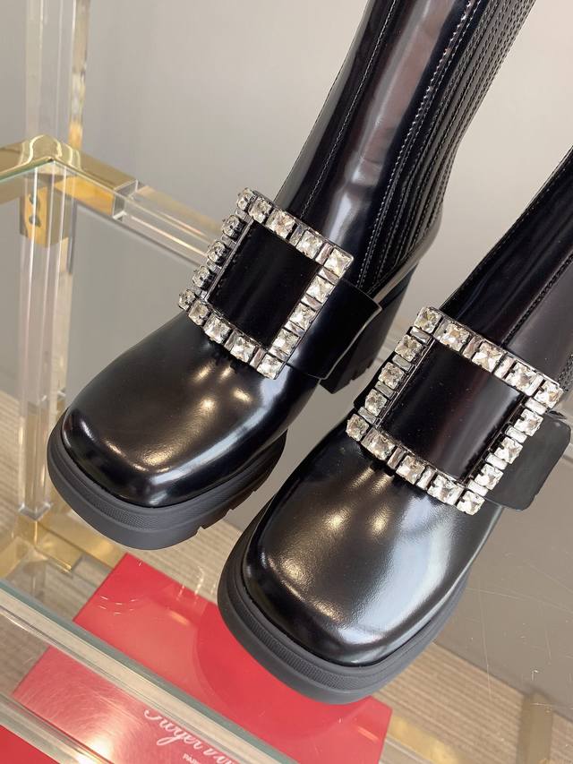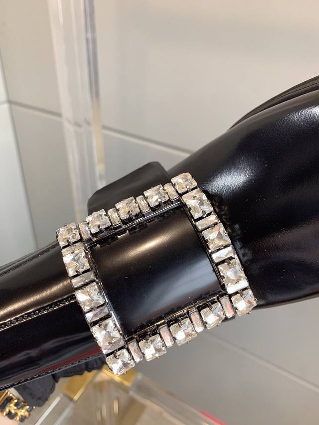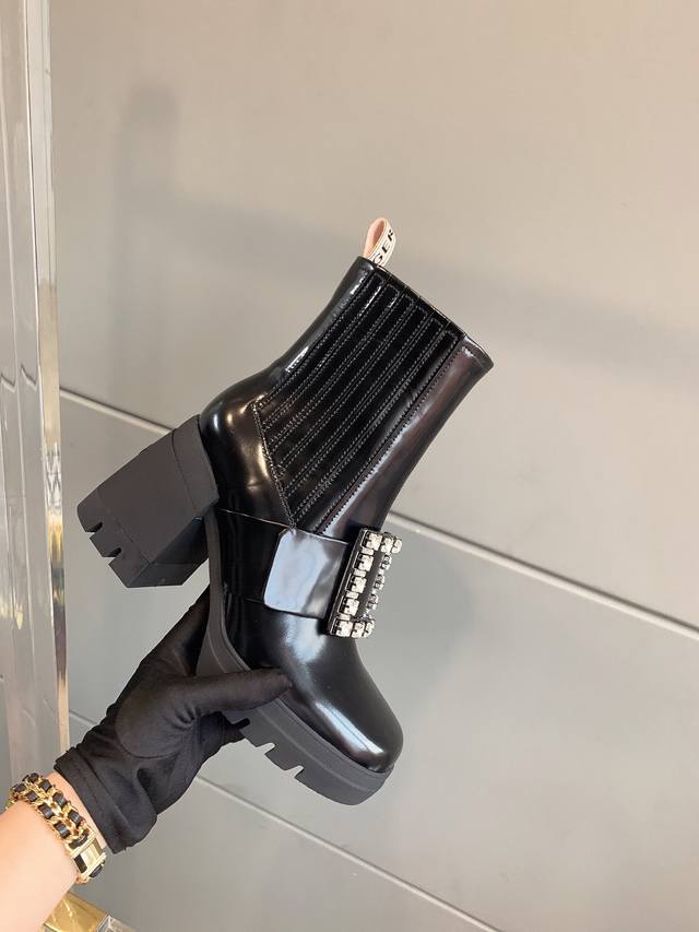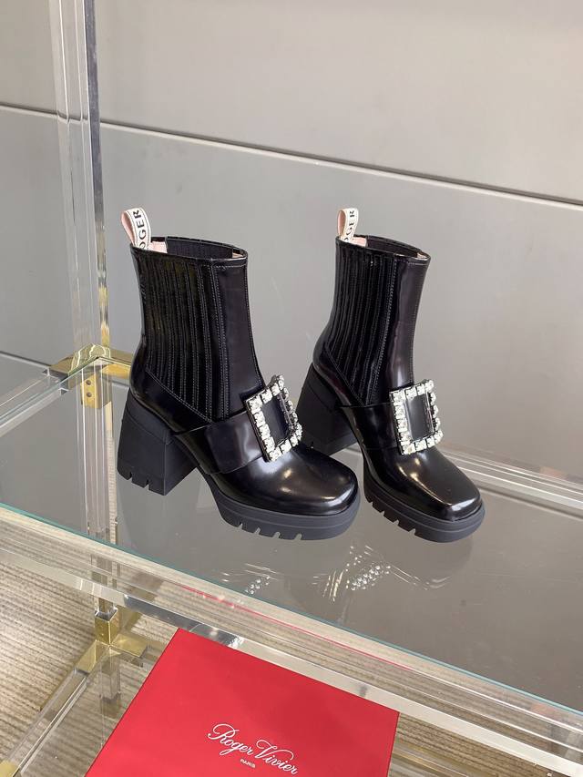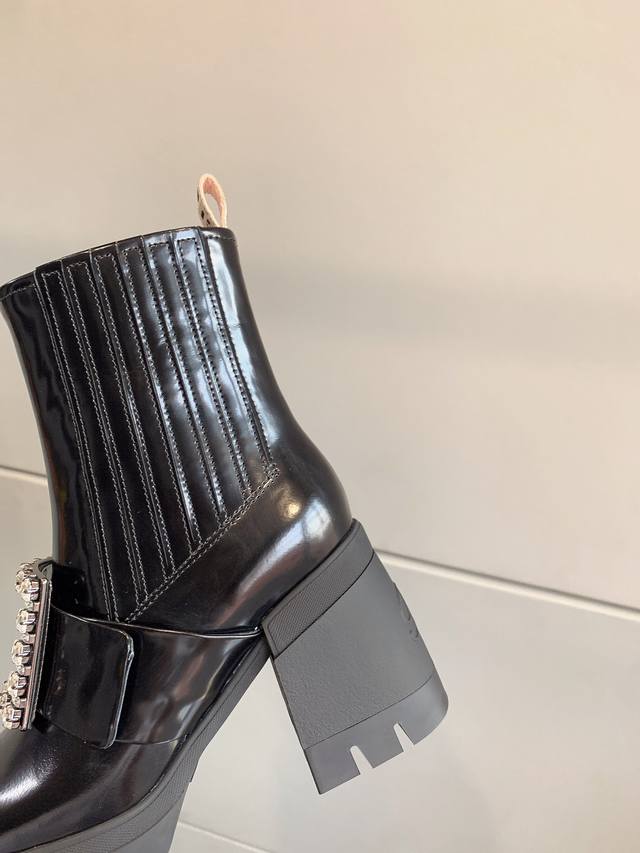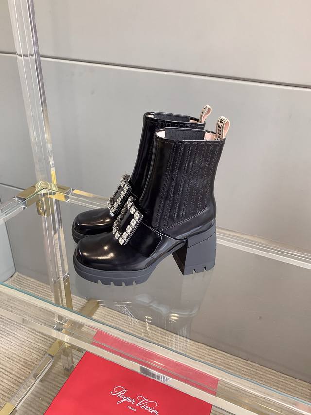 Roger Vivie*s new square-buckle high-heeled ankle boots are stable and show off your upright posture. They add a Vivier touch to the cool and stylish look.