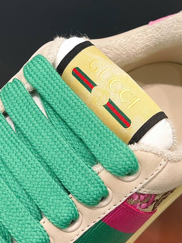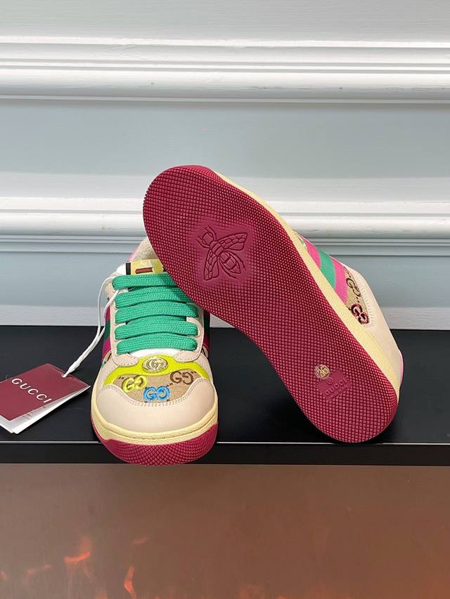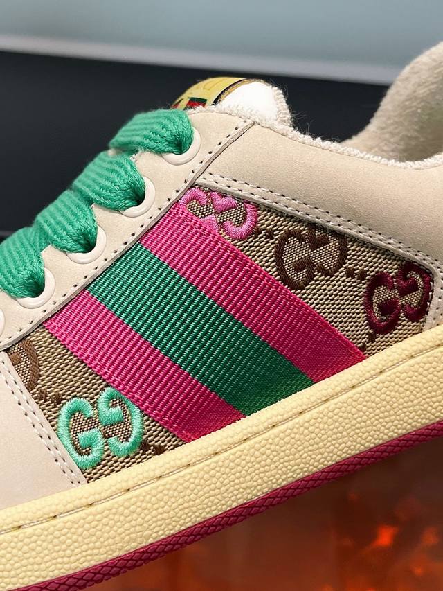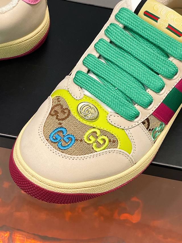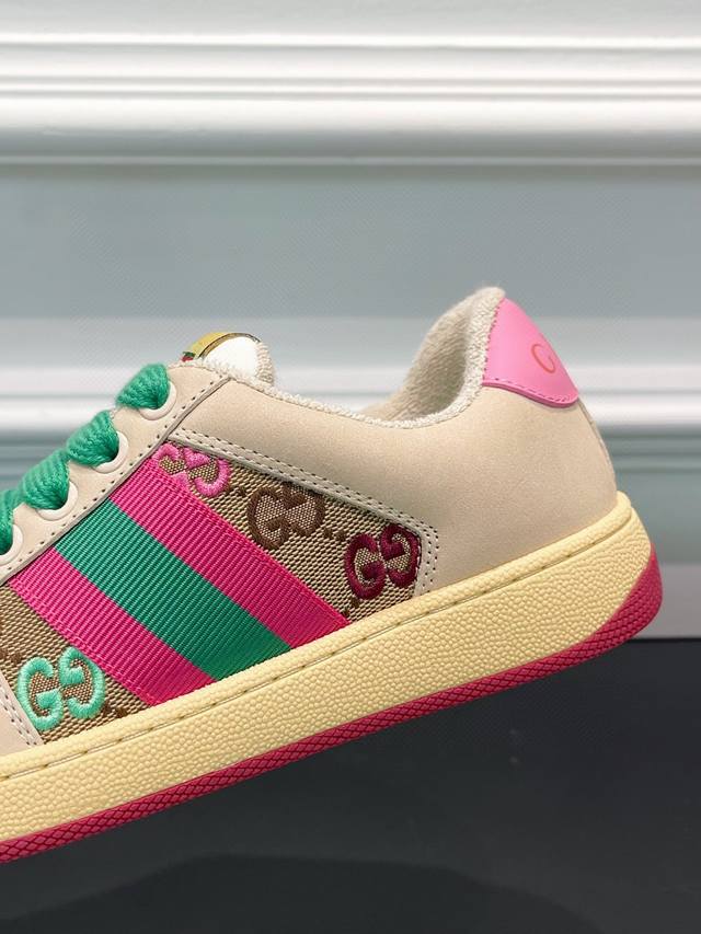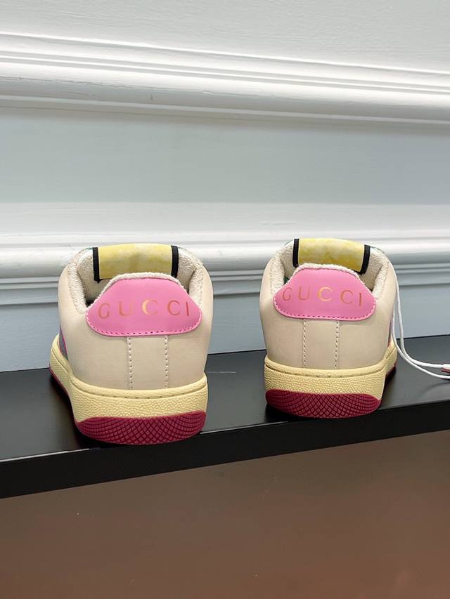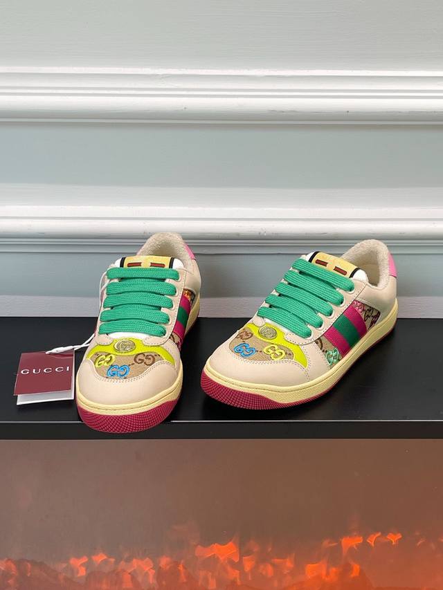 Gucci Screener series sneakers, dirty shoes for couples. The Screener series' name is inspired by defensive moves in sports, and the sneaker's design draws inspiration from classic sneakers from the 1970s.