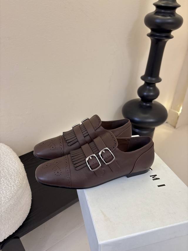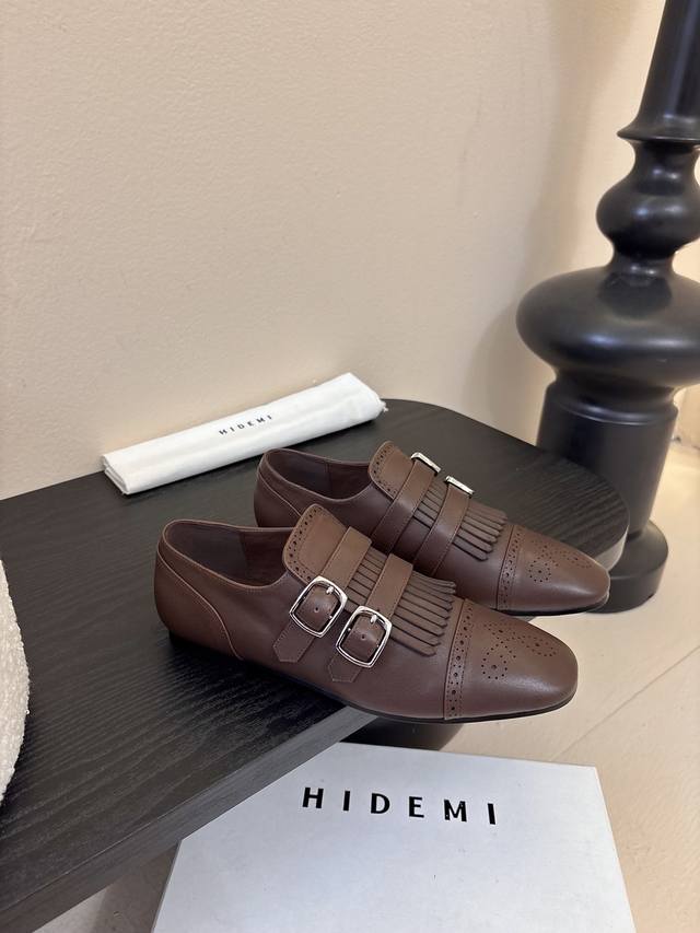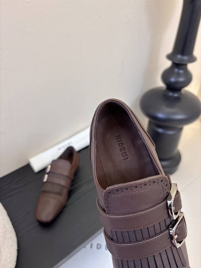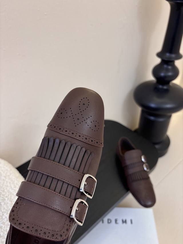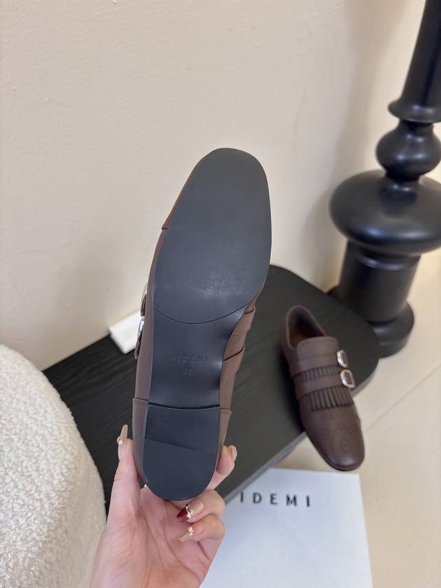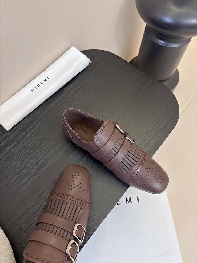 Hidem*25Ss Retro Baroque Style Flat Leather Shoes DDD These shoes feature brogue detailing and tassel embellishments, exuding a retro British dapper style. The double buckle design adds visual interest and allows for slight adjustment of the shoe's fit. DDD The upper is made of fine genuine leather with meticulous craftsmanship, and the details of the brogue detailing and tassels are neatly finished. The shoe shape leans towards casual leather shoes, offering more comfort than dress shoes; the color is versatile and can be paired with various styles, including casual and light formal wear. DDD Upper: Sheepskin Ddd Lining: Sheepskin Ddd Outsole: Rubber Ddd Height Increase: 2.5cm Ddd Size: 35-41, sizes 40 and 41 are custom-made and non-refundable DDD