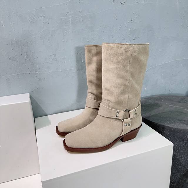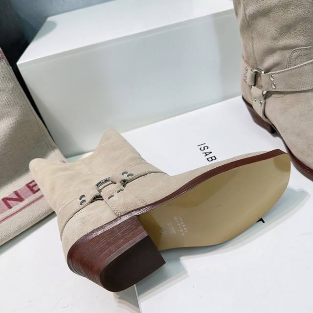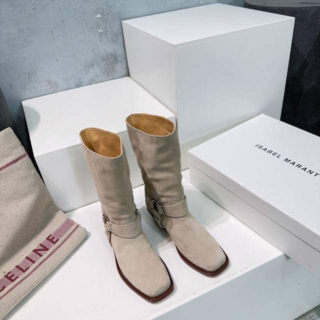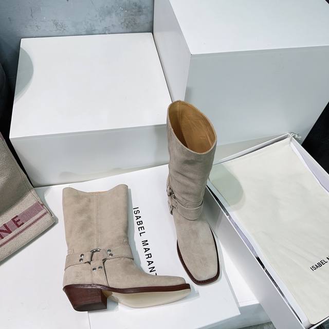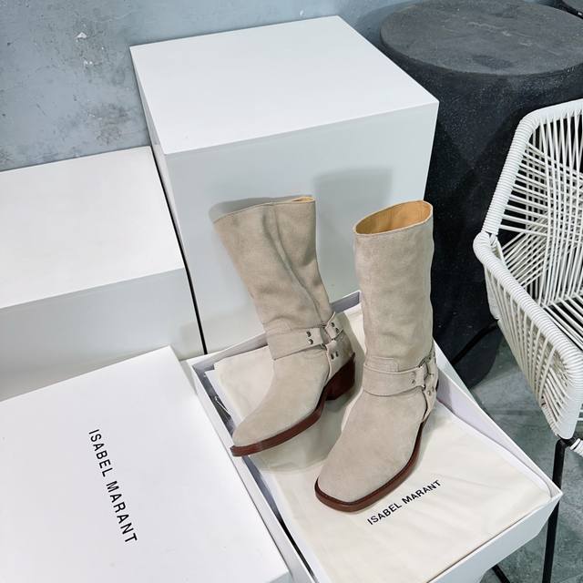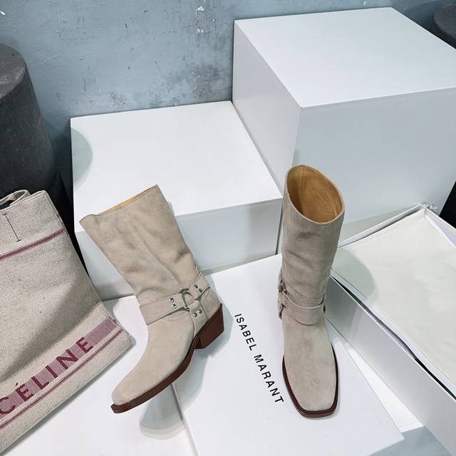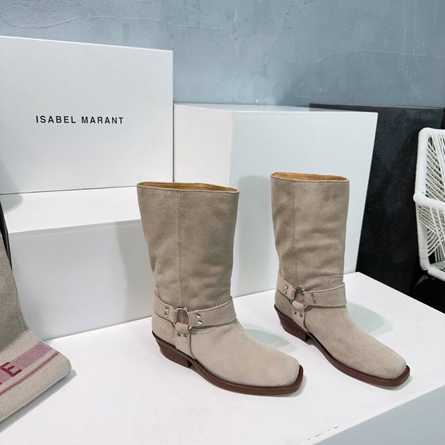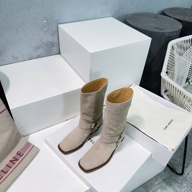 High quality factory boots! Isabel Marant 2025 SS Fall/Winter Retro Hardware Round Buckle Strap Thick Heel Square Toe Slip-On Boots!