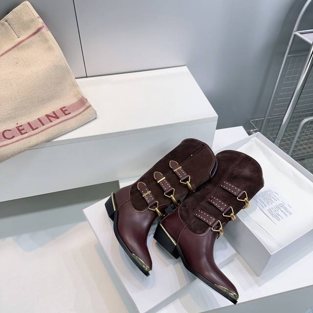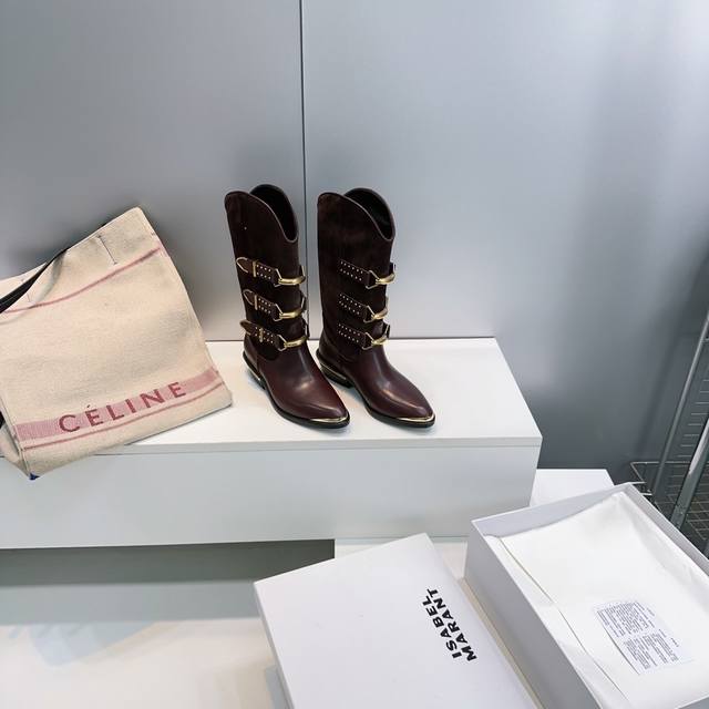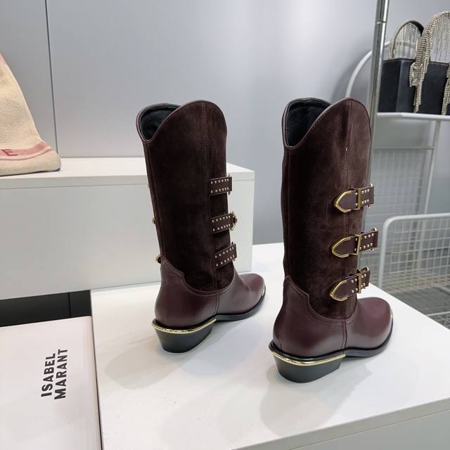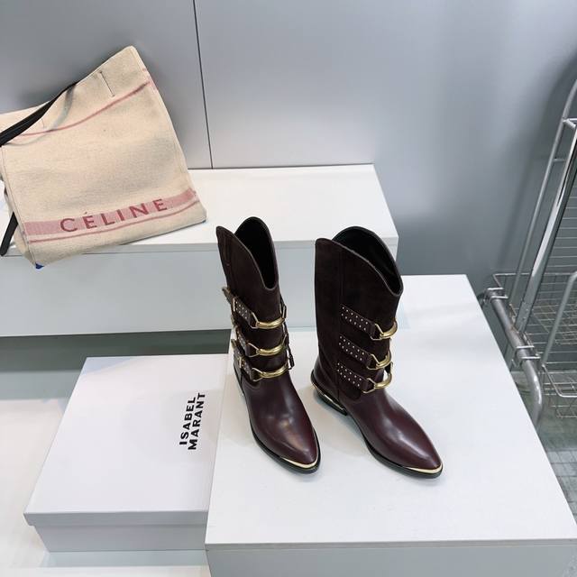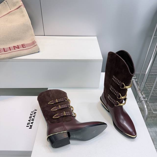 High quality factory boots! Top-quality Isabel Marant 2025 SS Fall/Winter Western Cowboy boots with European and American retro rivet hardware buckle straps, thick heels, pointed iron toe, straight-leg slip-on boots! Super heavy-duty punk-style knight boots, Martin boots, and short boots!