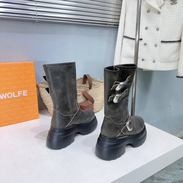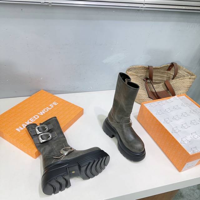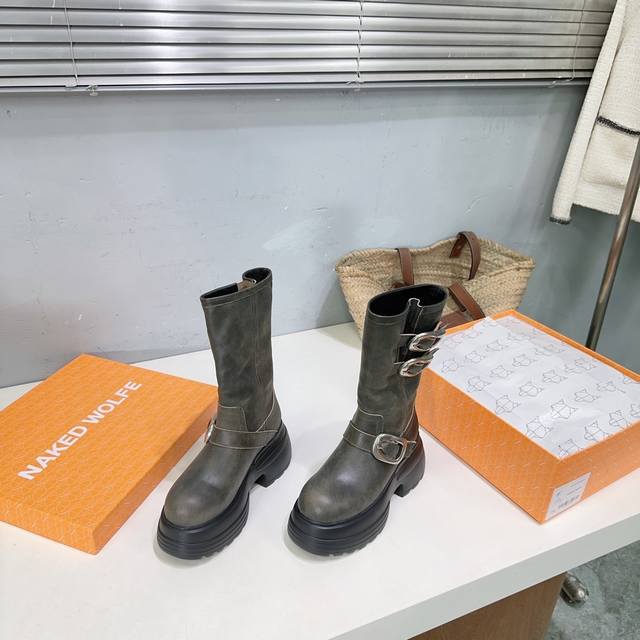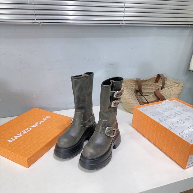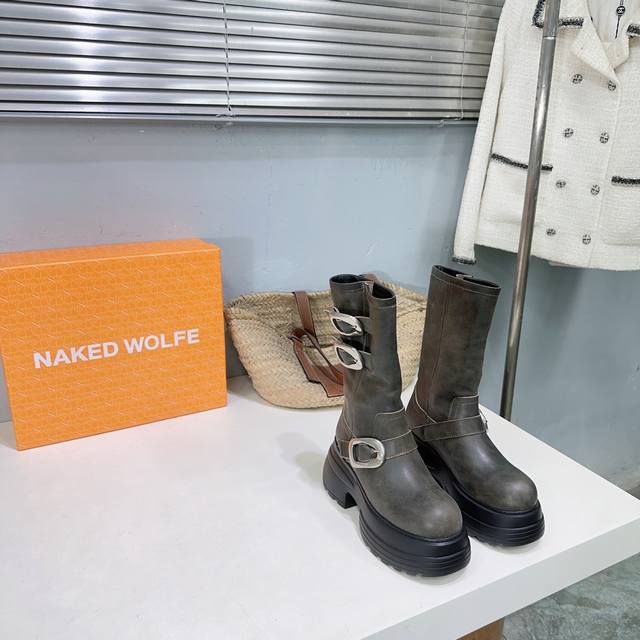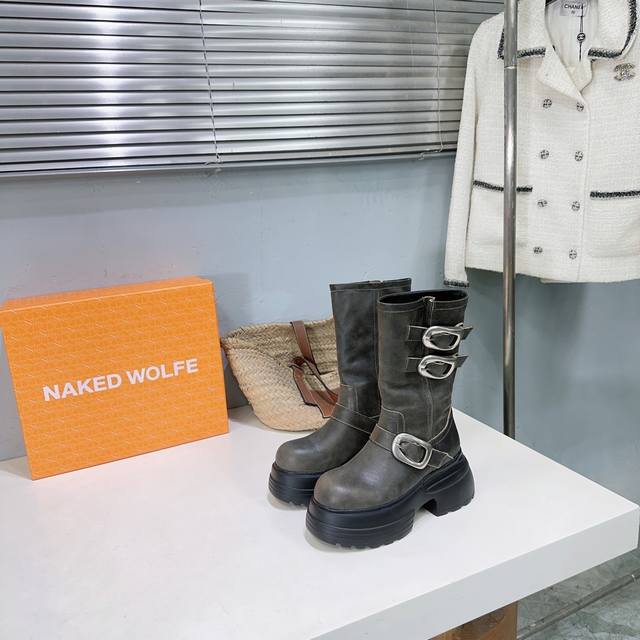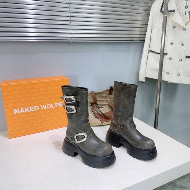 High quality, factory direct! Naked Wolfe 24Ss Autumn/Winter New Platform Retro Buckle Ankle Boots. Naked Wolfe is a typical streetwear icon, a representative of platform shoes that elongate the legs! The design features fashionable and avant-garde streetwear elements, full of youthful energy. Wearing these Naked Wolfe platform boots is simply stunning! The upper is made of top-grain cowhide, the inner lining is sheepskin, and the original molded rubber foam outsole is super lightweight and comfortable. The sole is approximately 7cm thick. Sizes: 35-40. Size 40 is custom-made and non-refundable. Comes with original packaging.
