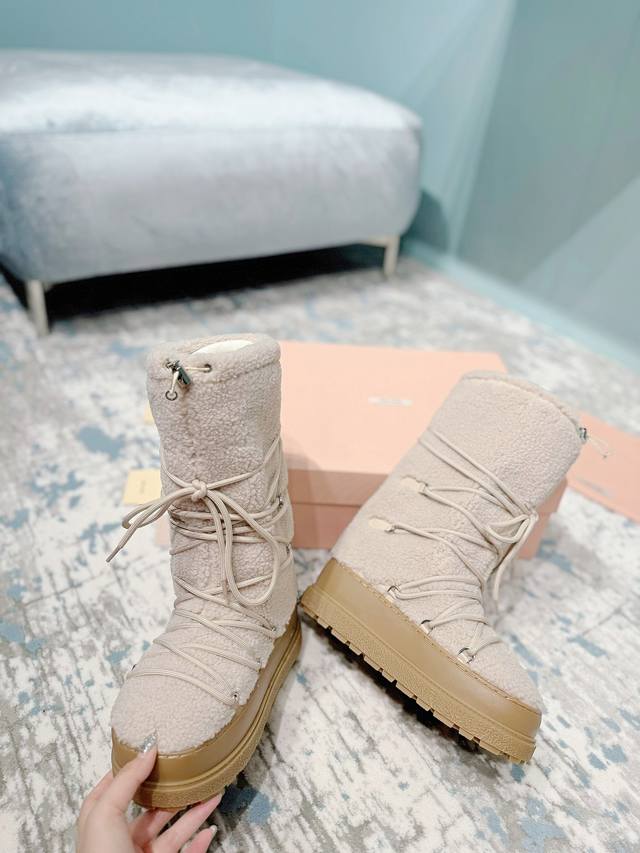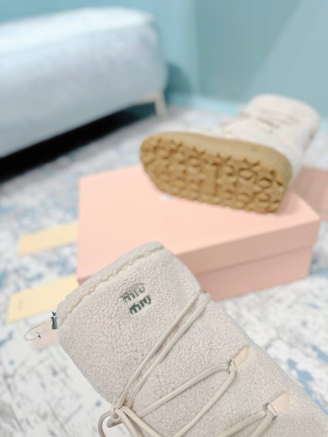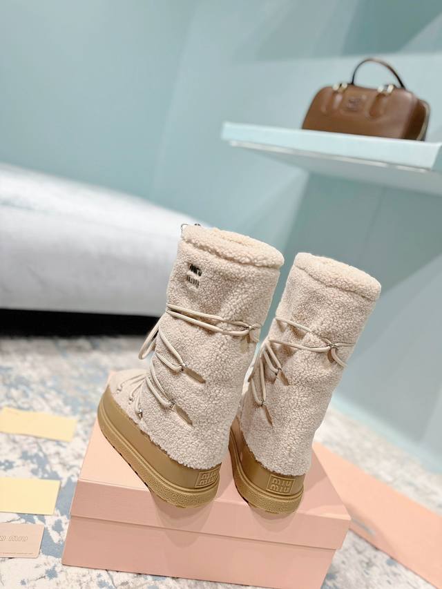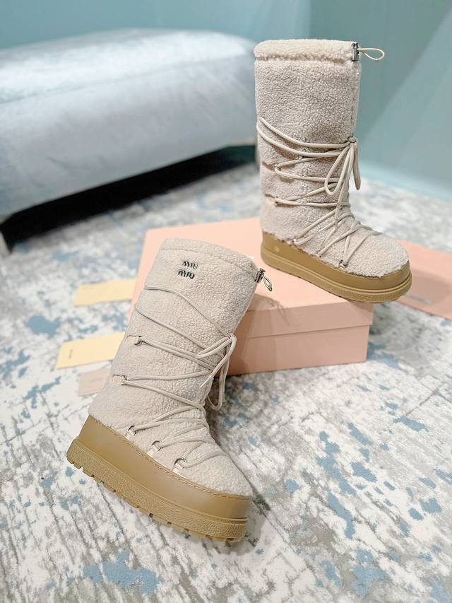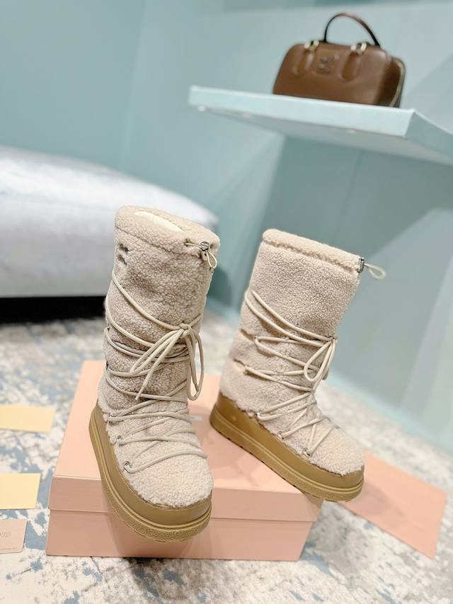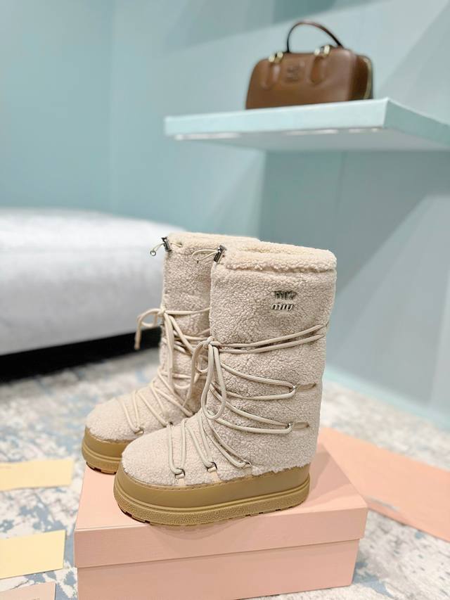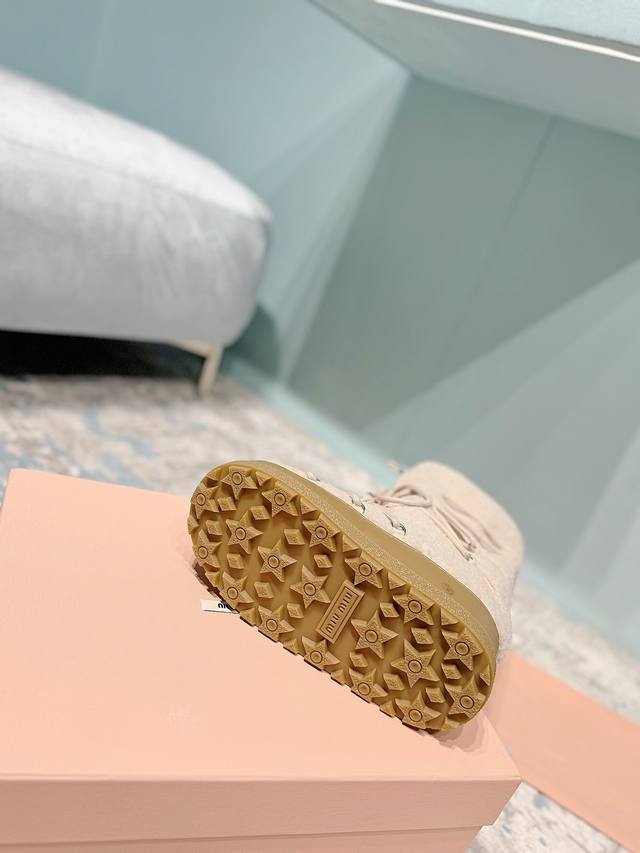 High-end version of the Miumiu Miu Miu 24Ss series, women's logo nylon gabardine snow party metal label two-tone thick-soled shrink-lace down snow boots, ski boots, fat toe boots!