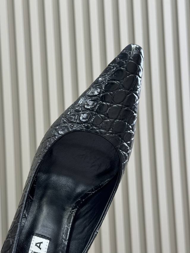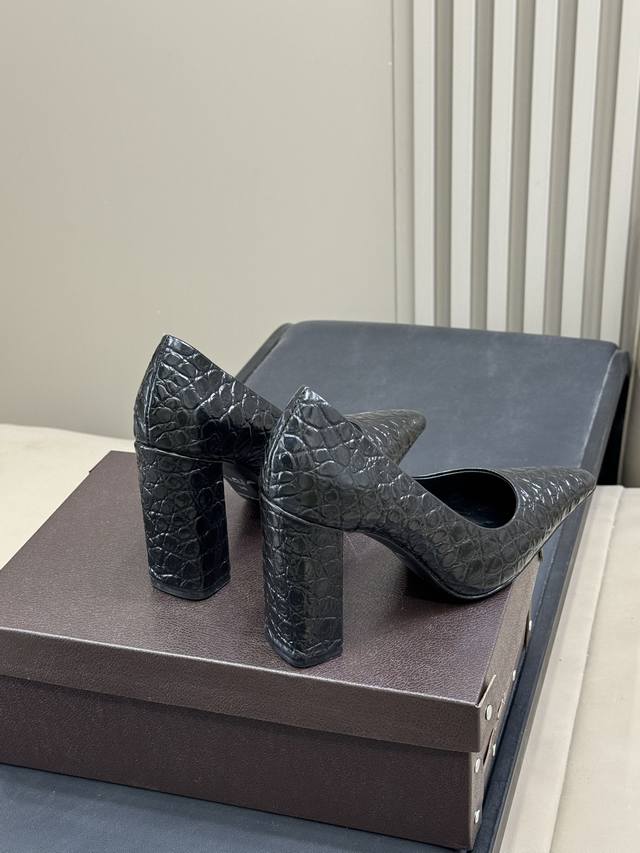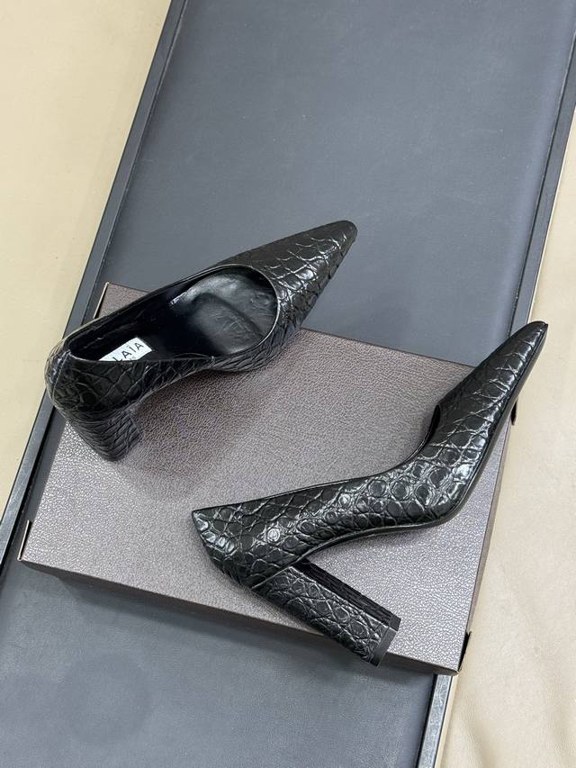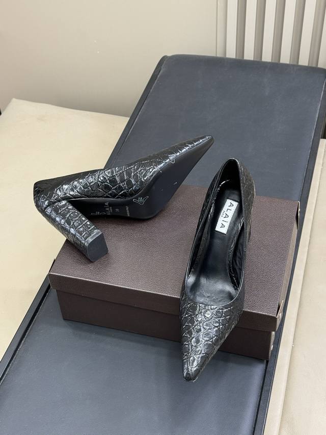High-quality Alaia 2025 new chunky heel pointed toe single shoes (retailer quality). Upper: Calfskin with embossed crocodile pattern for a more luxurious feel. Heel height: 9cm. Sole: Italian imported cowhide. Size: 35-41 (40/41 sizes are custom-made and non-refundable).