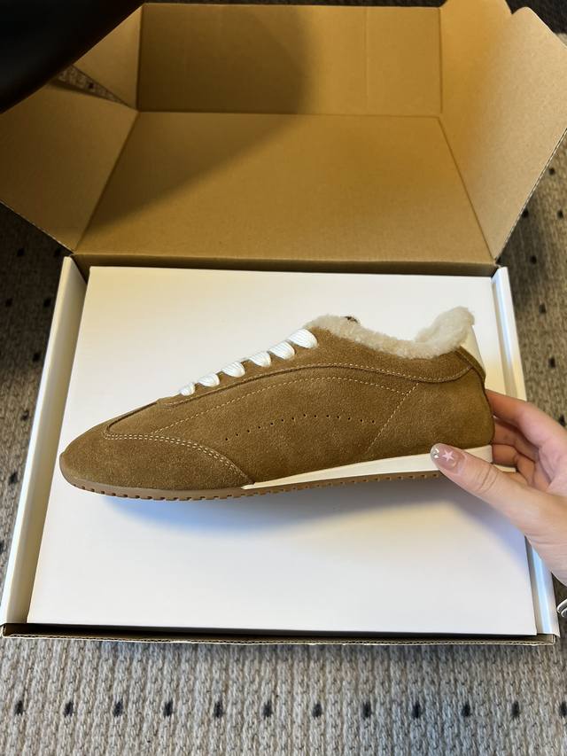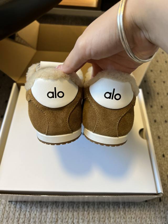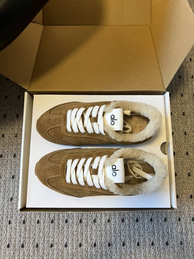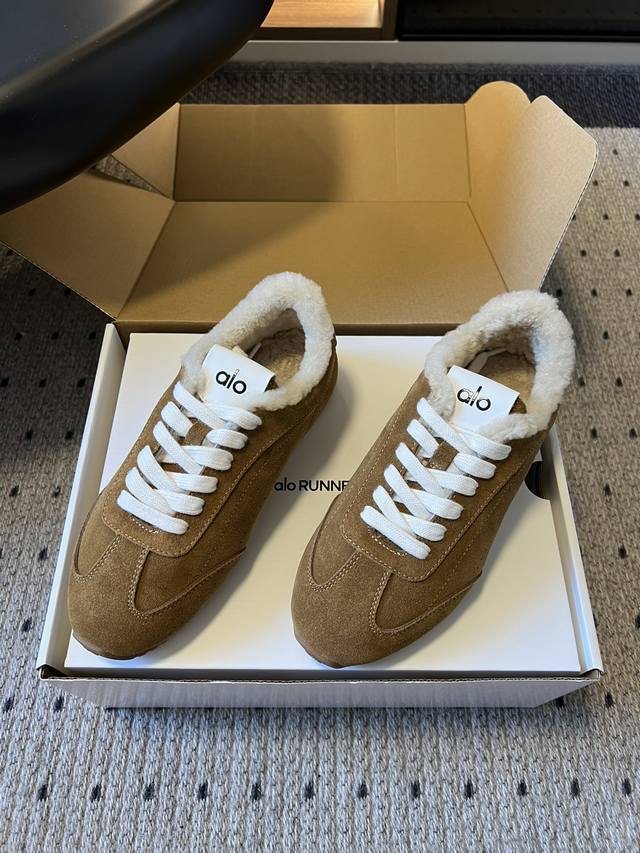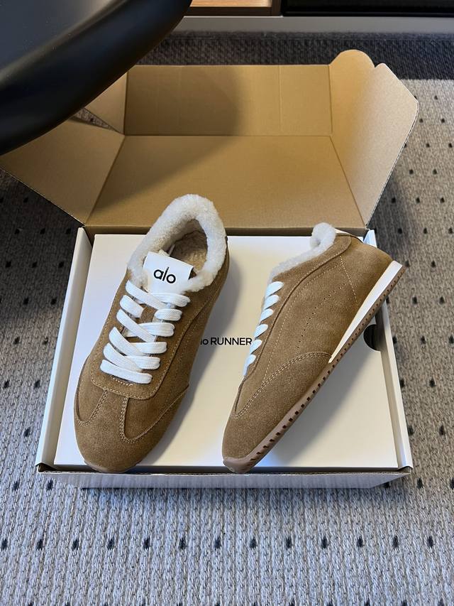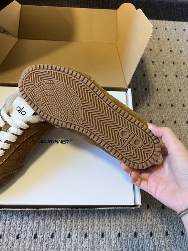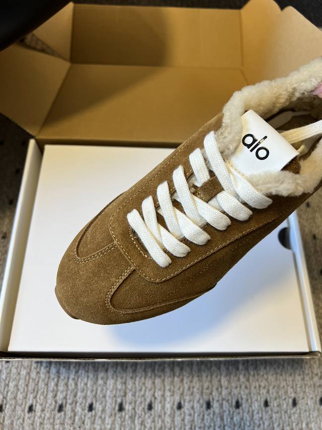 High-quality Alo 25Ss New Retro Fleece-lined Casual Sneakers DDD The upper is made of suede-like material, soft to the touch and with a premium feel; the inside of the shoe opening is lined with a plush lining, which not only enhances warmth but also adds a gentle visual layer. Available in low-saturation earth tones such as off-white, light brown, and dark brown, simple and versatile, suitable for various autumn and winter outfits. DDD Continuing the silhouette of retro sneakers, paired with a white lace-up design, it weakens the sporty feel while strengthening the casual and relaxed atmosphere, and the brand logo on the tongue makes the overall look more recognizable. DDD Material: Cow suede DDD Lining: Wool DDD Outsole: Rubber outsole DDD Height increase: 4cm DDD Size: 35-45, 40-45 sizes are custom-made and non-refundable DDD