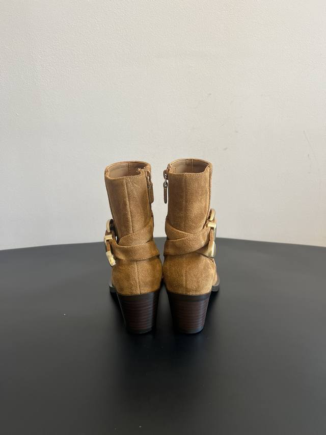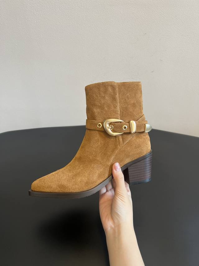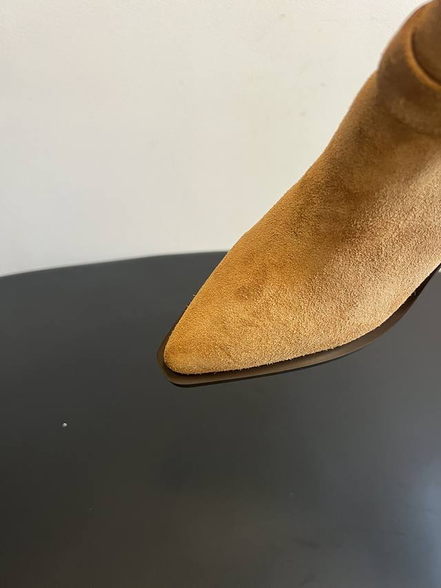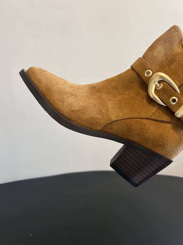 High-quality camel suede Shoes, size 25, retro-modern pointed-toe ankle boots. Made from finely textured camel suede, these boots are soft to the touch and have a vintage feel. The metal buckle design is a striking detail, both decorative and enhancing the boot's three-dimensional look. A side zipper makes them easy to put on and take off, and the craftsmanship details showcase quality. The pointed toe design paired with a chunky heel flatters the foot shape and adds a sophisticated touch, while the chunky heel ensures comfortable walking. The overall boot shape is simple and clean, with the retro texture of the camel suede contrasting with the exquisite metal buckle, creating a versatile and memorable style. Upper: Cow suede; Lining: Sheepskin; Outsole: Ip foam outsole; Size: 35-40 (Size 40 is custom-made and non-refundable).