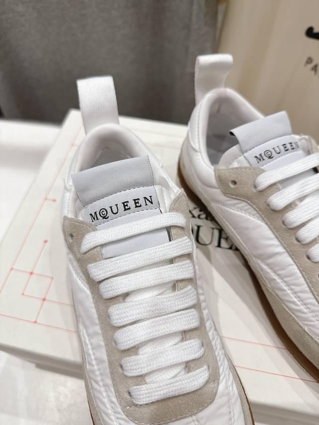 High-quality couple's shoes, Alexander McQueen's latest Flexion series retro casual sneakers, lightweight running shoes, white sneakers. This Flexion Off White suede low-top sneaker features a lightweight sole for exceptional comfort, showcasing the charm of a sporty style. It can add a fashionable touch to various casual looks. Material: Original custom imported fabric + high-gloss suede. Lining: Imported sheepskin. Sole: Original molded outsole. Size: Women's 35-40, Men's 40-45.