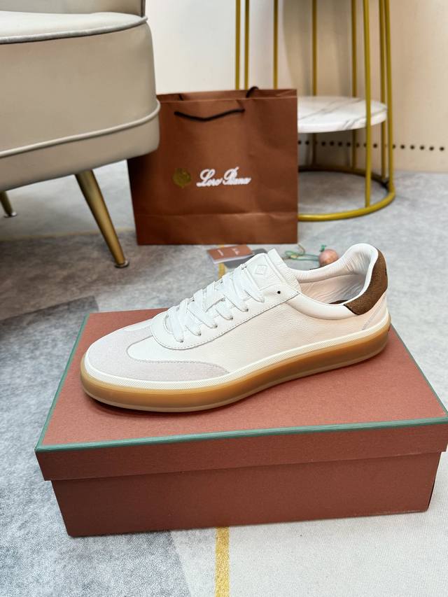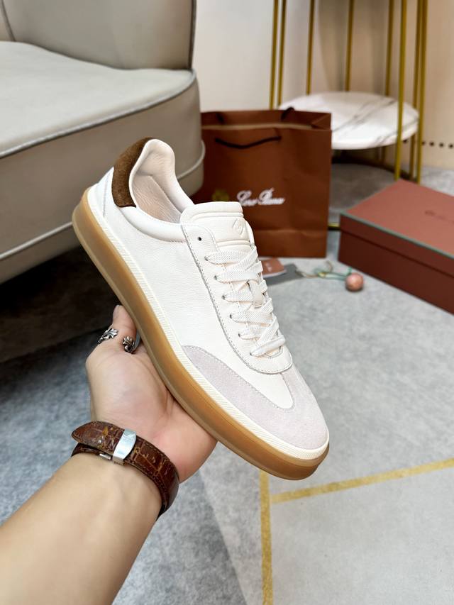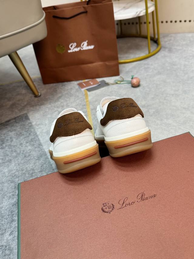 Loropiana popular sneaker style. The breathable and flexible texture of natural materials makes these sneakers both functional and comfortable. High-quality metal-free tanning and tumbling processes highlight the natural texture of the leather, while the camel-colored sole and white rubber trim create a double-layer sole effect, making them versatile for everyday wear and creating a casual style.