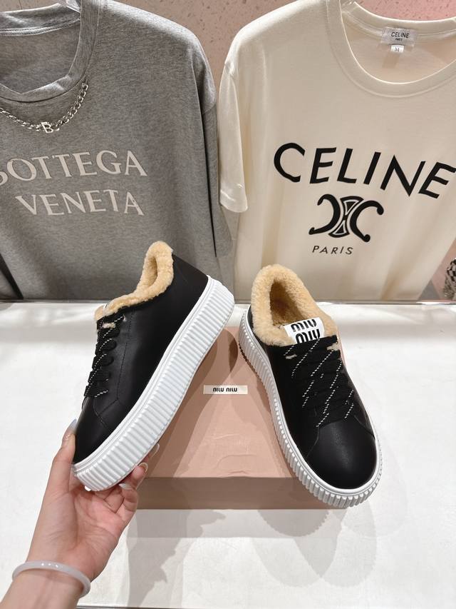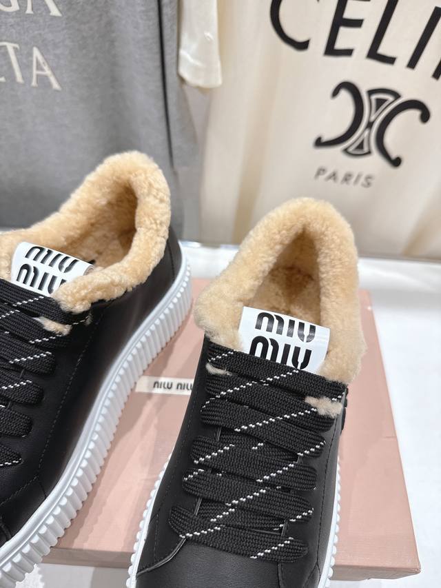 High-quality factory direct. Miu Miu F015 2025 Autumn/Winter New Lace-up Thick-soled Wool White Sneakers, Sports Casual Shoes, Furry Shoes. These lace-up sports casual shoes are a must-have for everyday winter wear