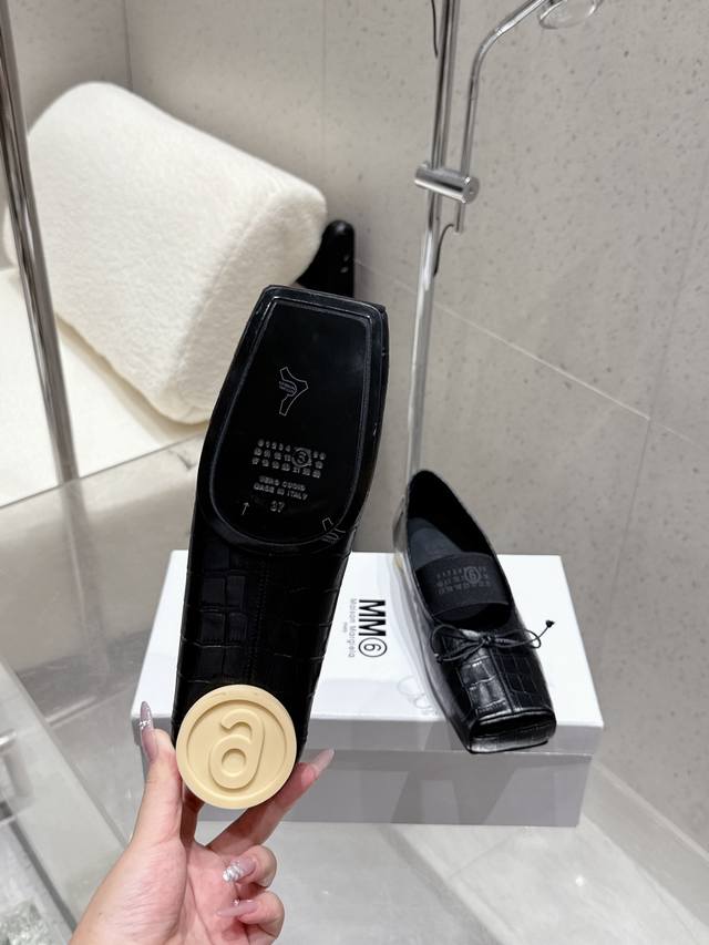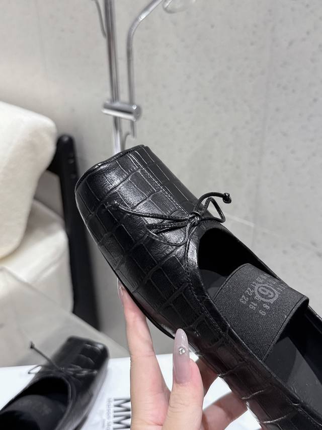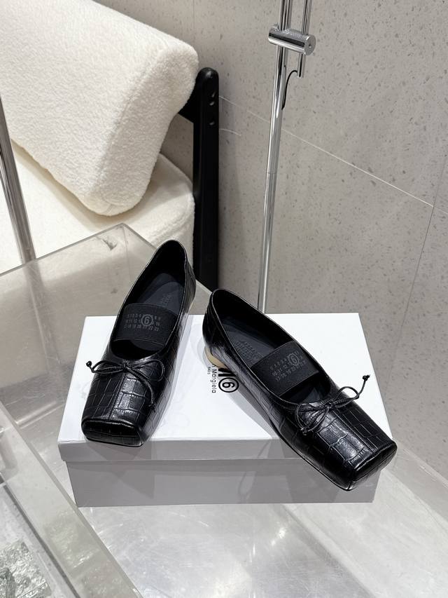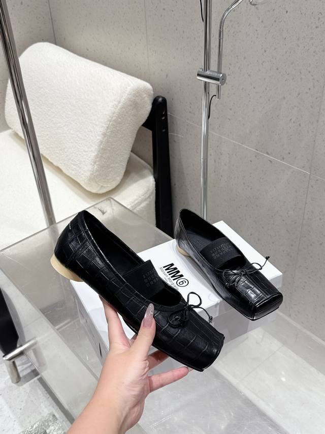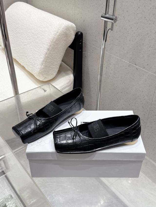 High-quality factory direct. Mm6 Maison Magical 2025Ss new arrival, the super popular square-toe flat Mary Jane ballet flats. Comfort is guaranteed, the unique silhouette, and the ingenious fabric and contrasting material patchwork are all hallmarks of Mm6 Maison Magical. A must-have feature! These ballet flats are made with high-quality imported crocodile-patterned cowhide leather. The elegant square toe, logo, elastic band, and Italian genuine leather outsole are simply stunning. Sizes: 35-39, 40 (custom made). Comes with original packaging.