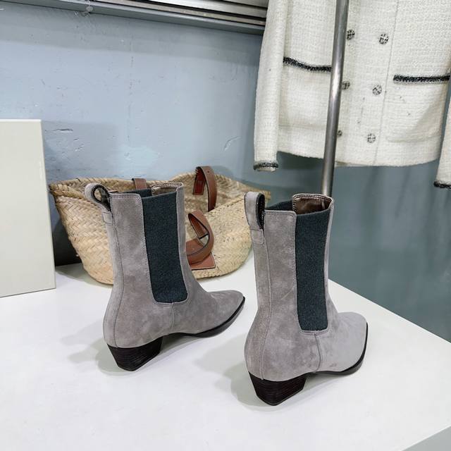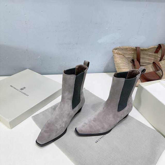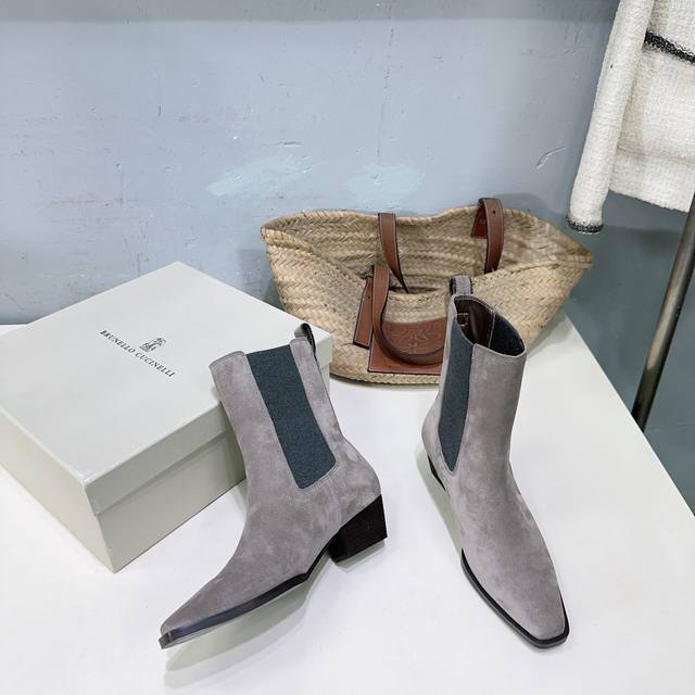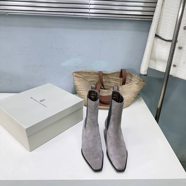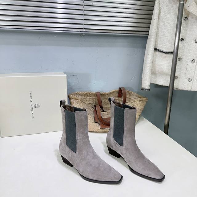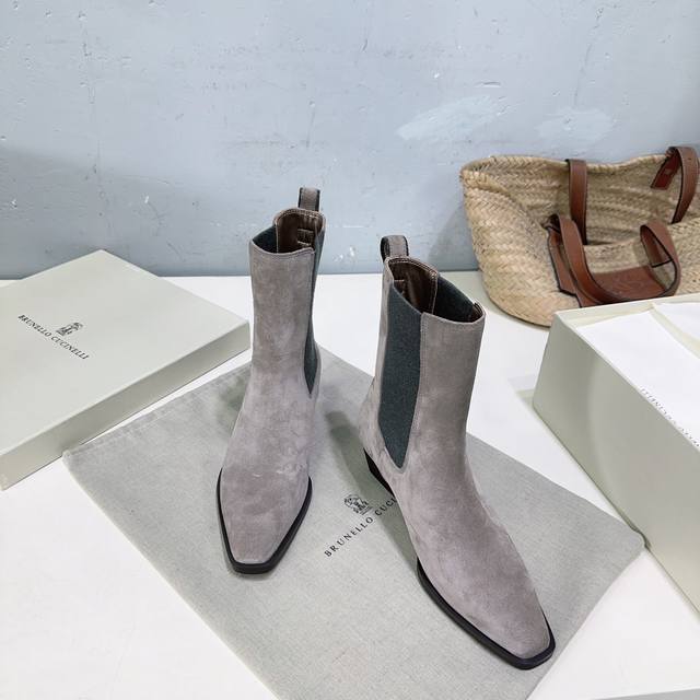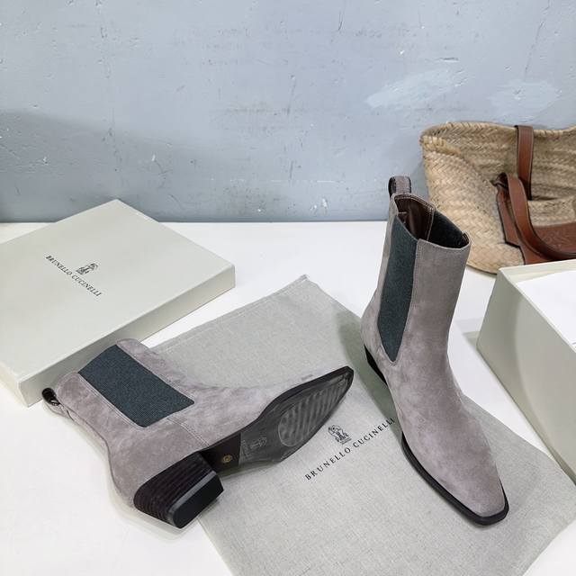 Brunello Cucinelli Bc 2025Ss Autumn/Winter Simple Square Toe Chunky Heel Elastic Chelsea Ankle Boots! New Autumn/Winter collection!
