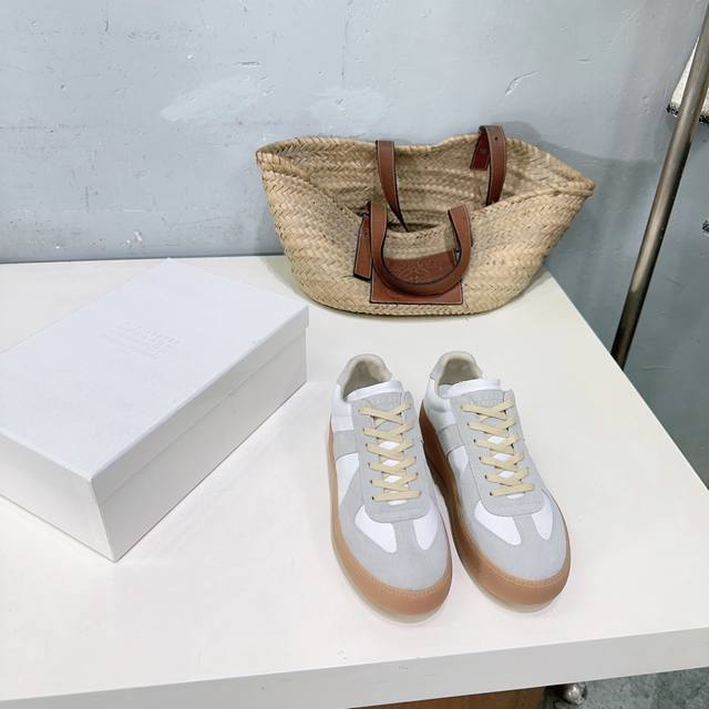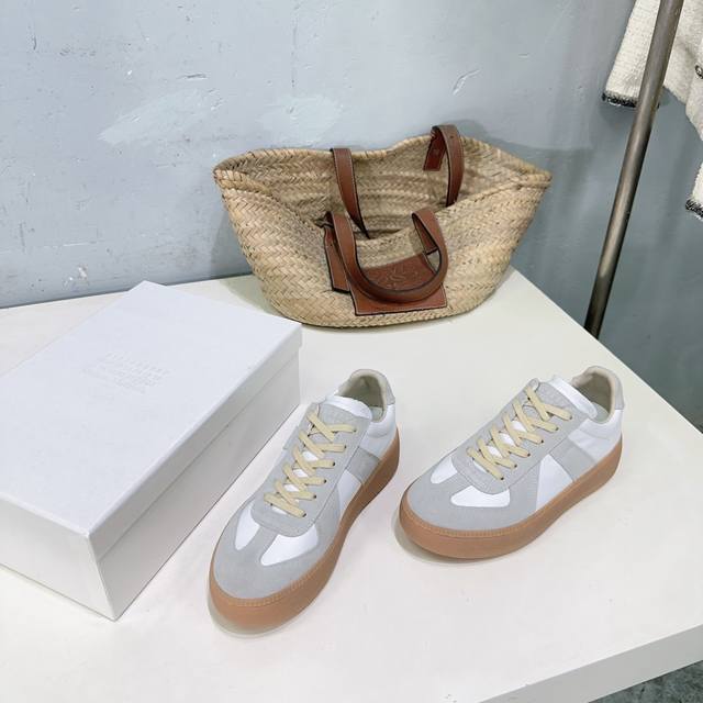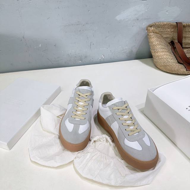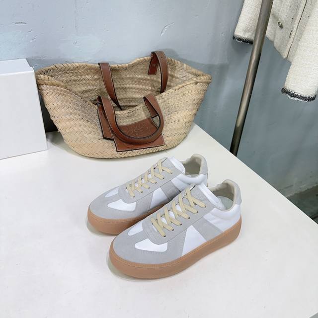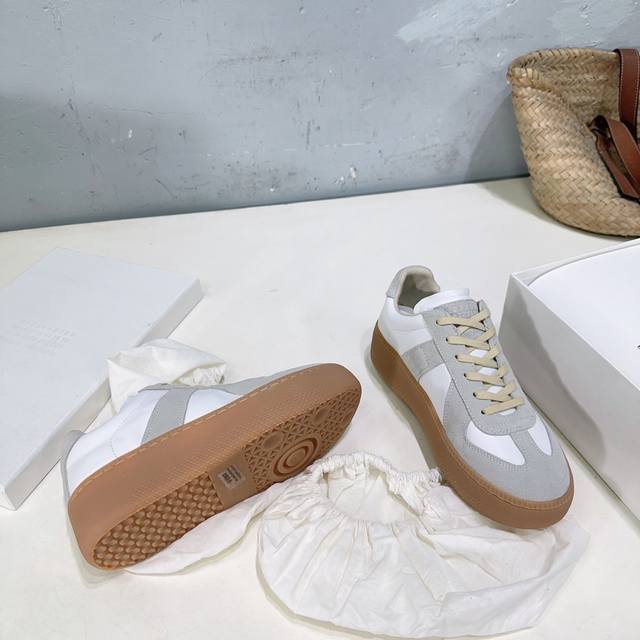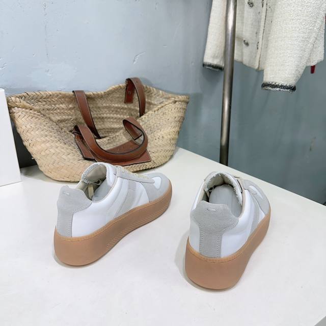 High-quality factory! Niche trendy brand Maison Margiela 25Ss Fall/Winter New Arrival Mm6 Platform German Trainer Shoes, Forrest Gump Casual Shoes, Biscuit Shoes! The Mm6 platform German trainer shoes are here! They're so stylish! The soft and sophisticated color scheme and platform design subtly increase height and make legs look slimmer. Whether paired with casual wear or a light retro style, they can unlock a casual yet eye-catching look in one click. Paired with Maison Margiela's new platform German trainer shoes, they instantly elongate my proportions while adding a touch of vitality to my mature, old-fashioned style. Don't be fooled by the thick sole; the shoes are surprisingly lightweight. You won't feel tired even after a whole day of city driving. The upper is made of calfskin and suede. The inner lining is sheepskin. Original molded rubber outsole. Platform: 3cm. Sizes: 35-40. Size 40 is non-refundable. Comes with original packaging.