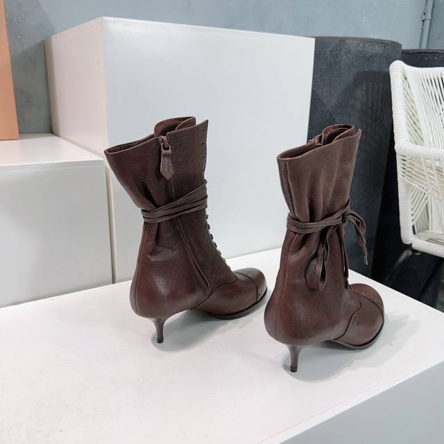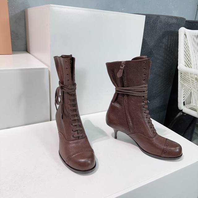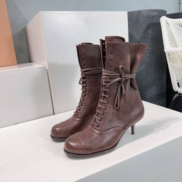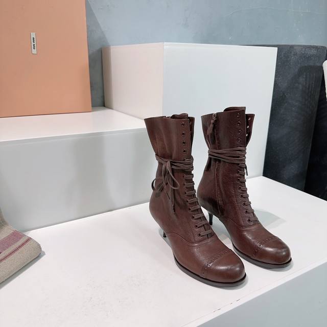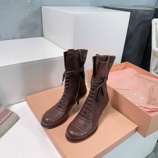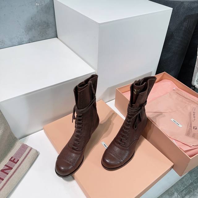 High-quality factory production! Top-tier original version! Miu Miu 25Ss Fall/Winter runway new retro low-heeled round-toe lace-up ankle boots! Crazy hot, New Arrival! Miu 24Ss runway main style! Classic retro motorcycle boot design, cool and modern! Winter boots for summer wear, a fashionable trend! These ankle boots are really amazing and photogenic! Retro, stylish, sexy, and rugged