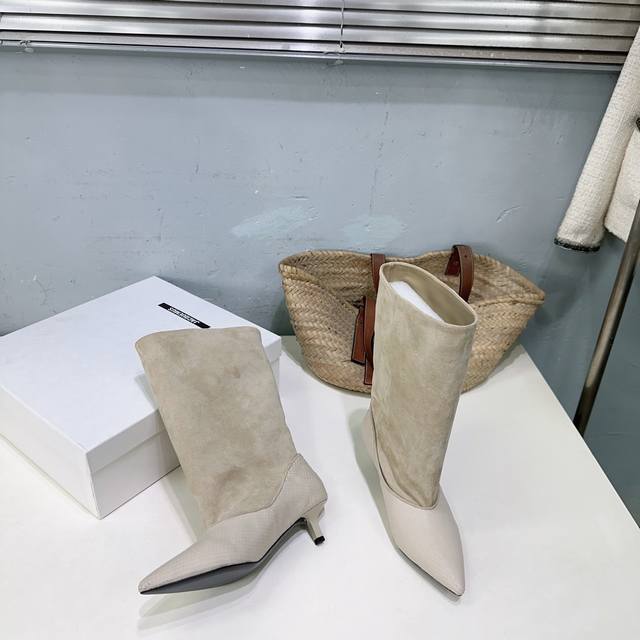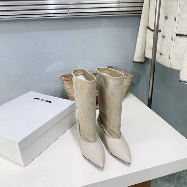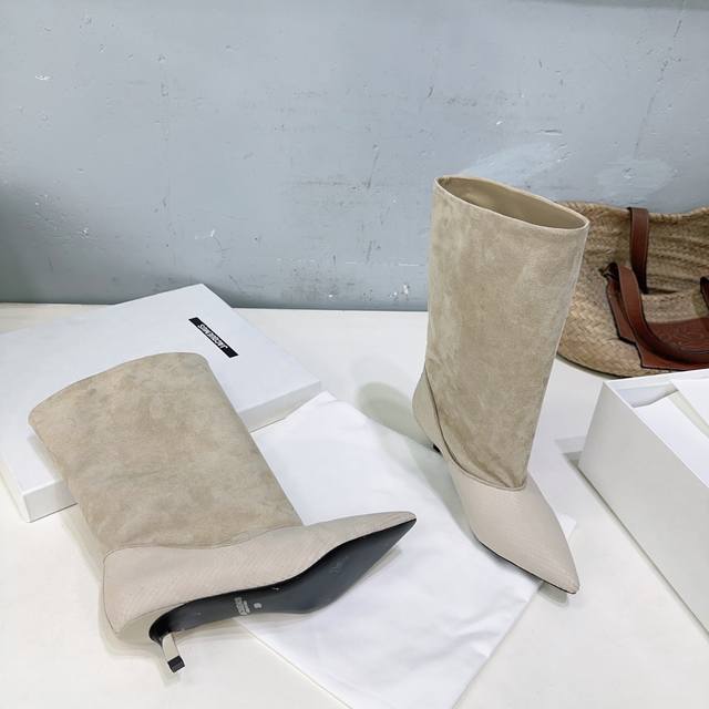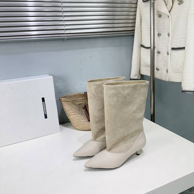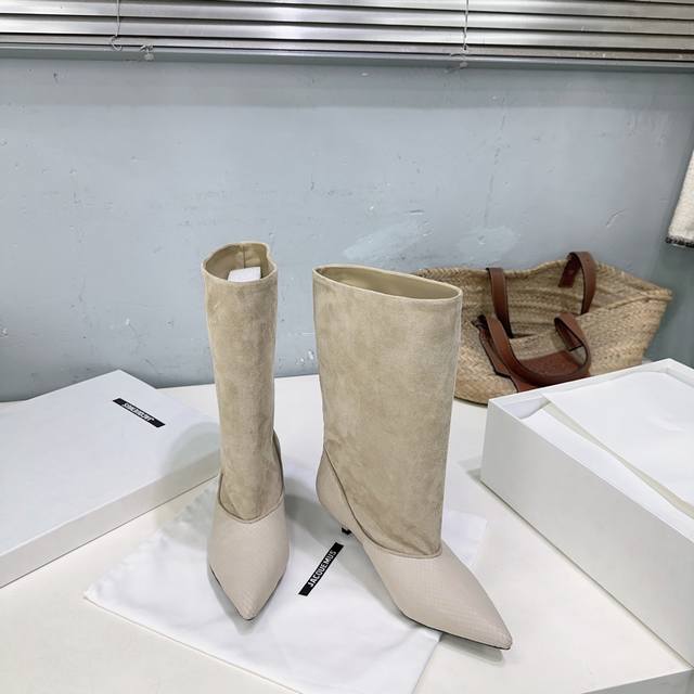 High-quality factory release! Jacquemus Fall/Winter 2025 Ss wide-top slip-on pointed-toe kitten heel mid-calf boots, a new arrival from the niche streetwear brand. These boots are truly exceptional; the combination of suede and snakeskin creates a sophisticated and layered look. The pointed toe and stiletto heel perfectly capture elegance and sexiness. Wearing them makes you the center of attention, easily slaying any occasion. Features include: imported suede upper with hand-cut cowhide trim; imported lambskin lining; Italian imported genuine leather outsole; heel height: 4.5cm; sizes: 35-41; sizes 40 and 41 are non-refundable and non-exchangeable. Comes with original packaging.