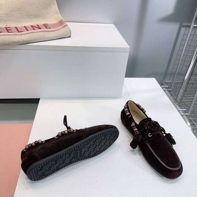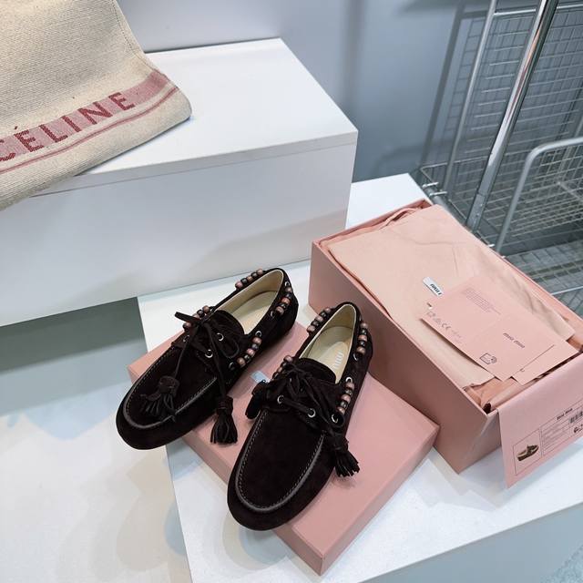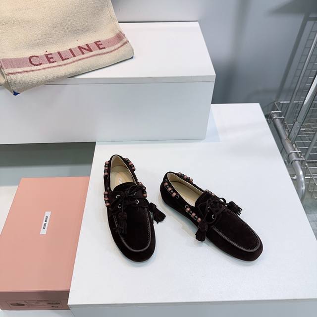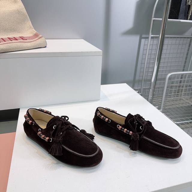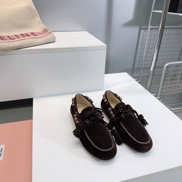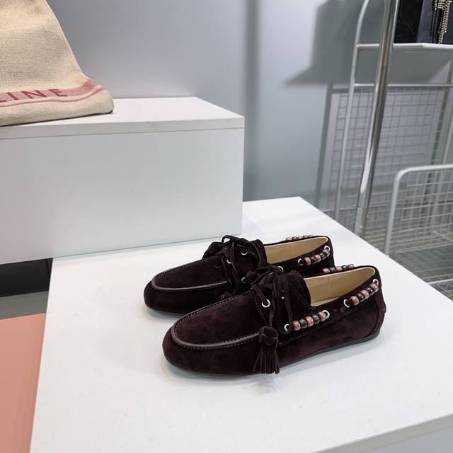 High-quality factory release! Miumiu 25Ss Autumn/Winter New Retro Ethnic Style Beaded Tassel Loafers, Flat Shoes! These loafers feature a simple and classic design. The latest beaded tassel details make them stand out among other loafers. The overall shape is smooth and elegant without being bulky, fully exposing the ankle and flattering the leg proportions! Super stylish and versatile! The upper is made of imported sheepskin suede, the insole is suede, and the sole is made to the original mold. Sizes: 35-40. Size 40 is custom-made and non-refundable. Comes with original packaging.