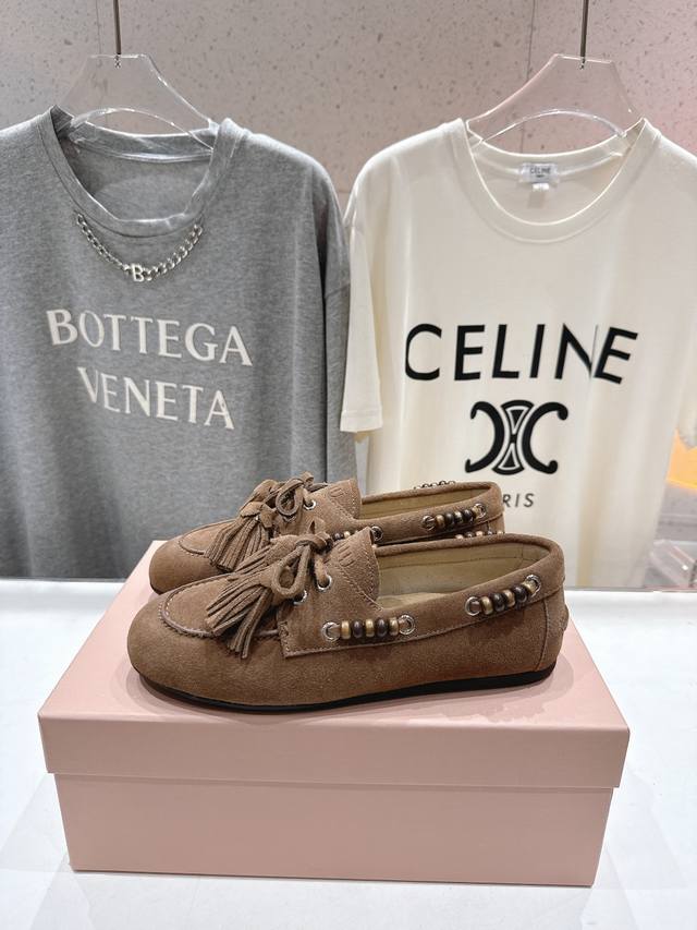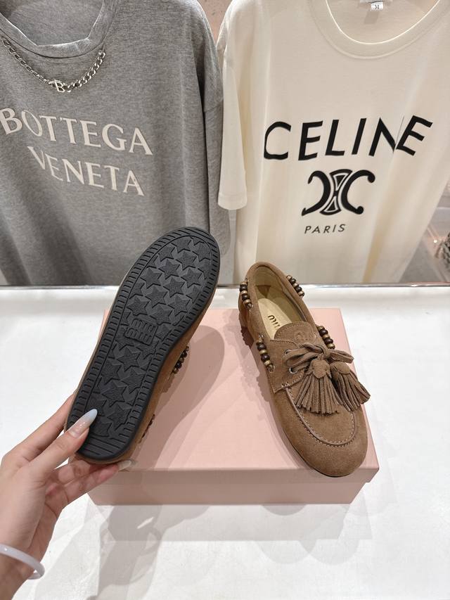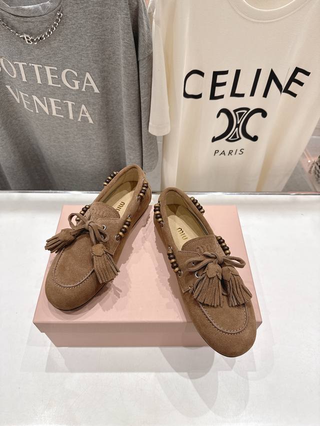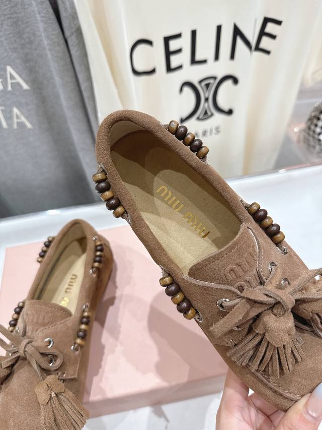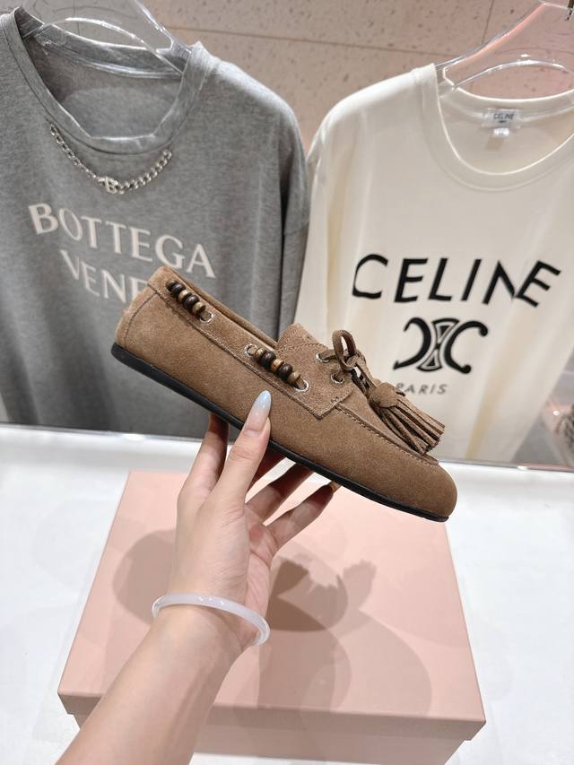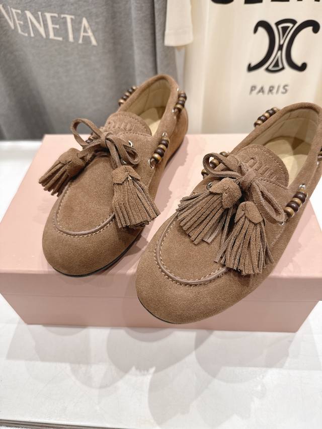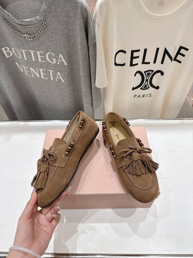 High-quality factory release. Miumiu Miu Miu F029 25Ss new fall/winter hand-beaded tassel slip-on driving shoe, loafer, and casual slip-on. These timeless suede driving shoes feature Indian-inspired tassels, showcasing a unique, classic style. Extremely comfortable and stable, they can be paired with anything from savory to sweet. Zp develops hardware and custom colors. Upper: Custom imported high-mercerized cow suede. Lining: Imported sheepskin. Sole: Zp molded rubber outsole. Sizes: 35-40, 40.41 custom-made. Complete packaging.