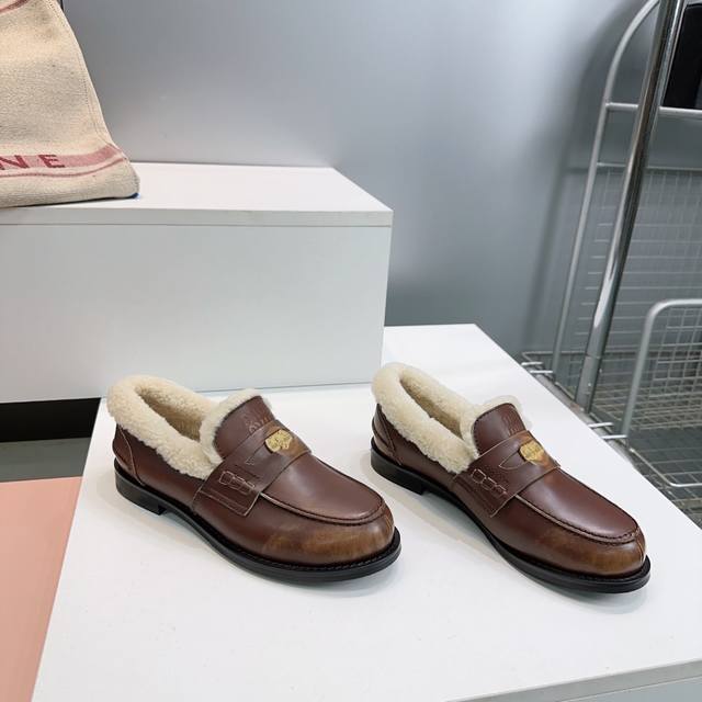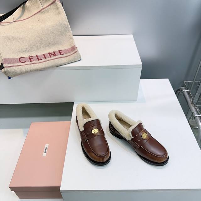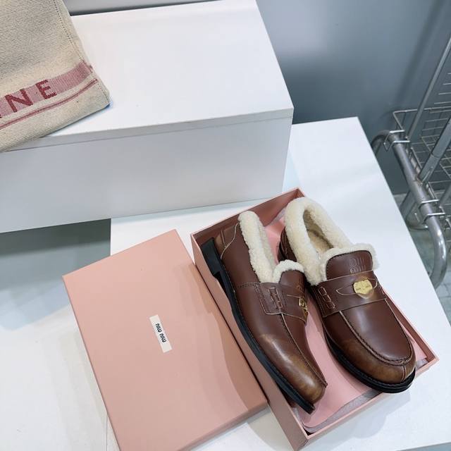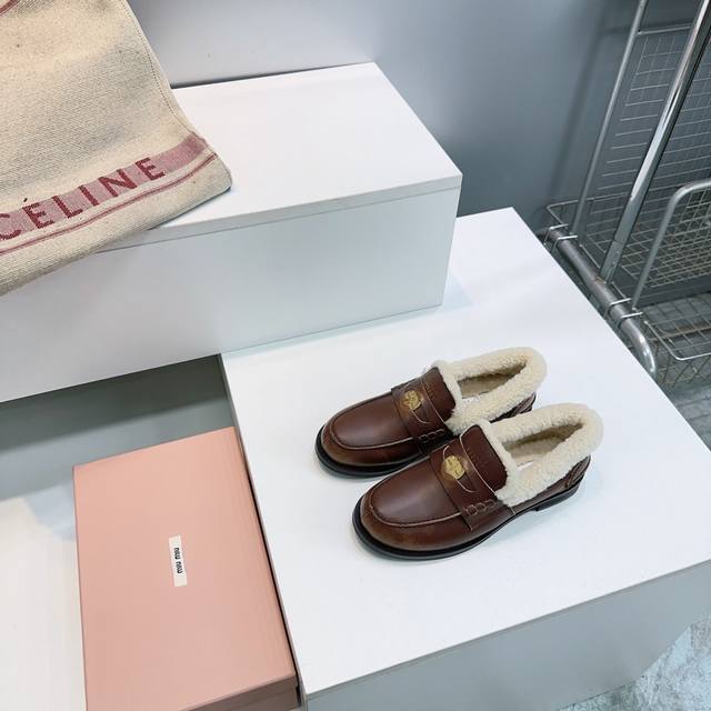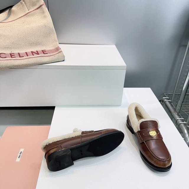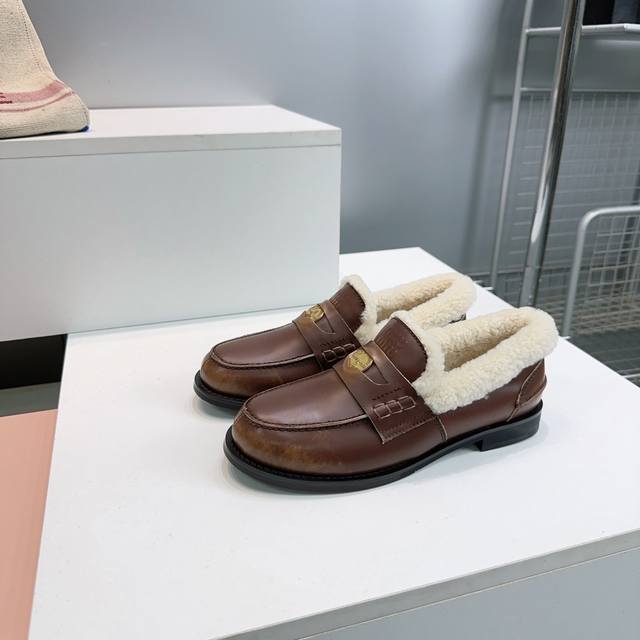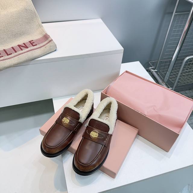 High-quality factory release! Top quality Miu Miu 25Ss Autumn/Winter new coin-patterned wool warm cotton loafers, single shoes, furry bun shoes! 100% pure wool loafers, runway new style, a blessing for driving ladies, retro fashion, simple and high-end, easy to match, very comfortable and super warm! The upper features gold coins and embossed logos, showcasing a unique classic style! The upper is made of imported cow suede calfskin, the insole is made of sheepskin, and the original molded rubber outsole is non-slip and wear-resistant! Sizes: 35-41, 40, 41 are custom-made and non-refundable. Comes with original packaging.
