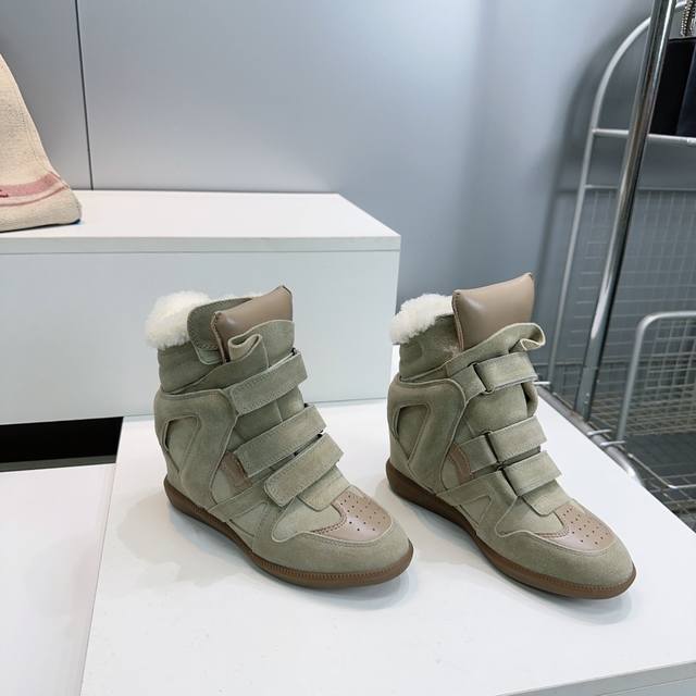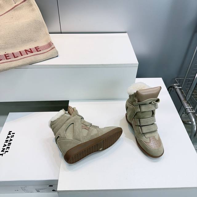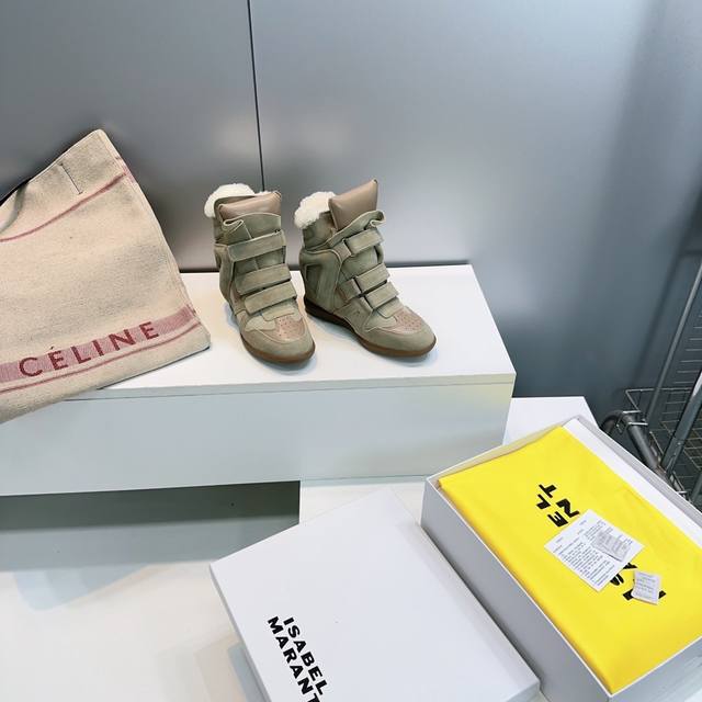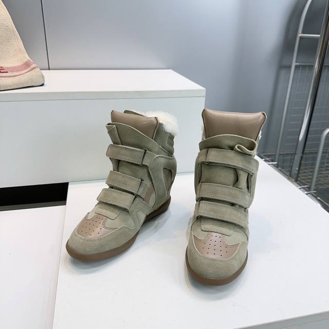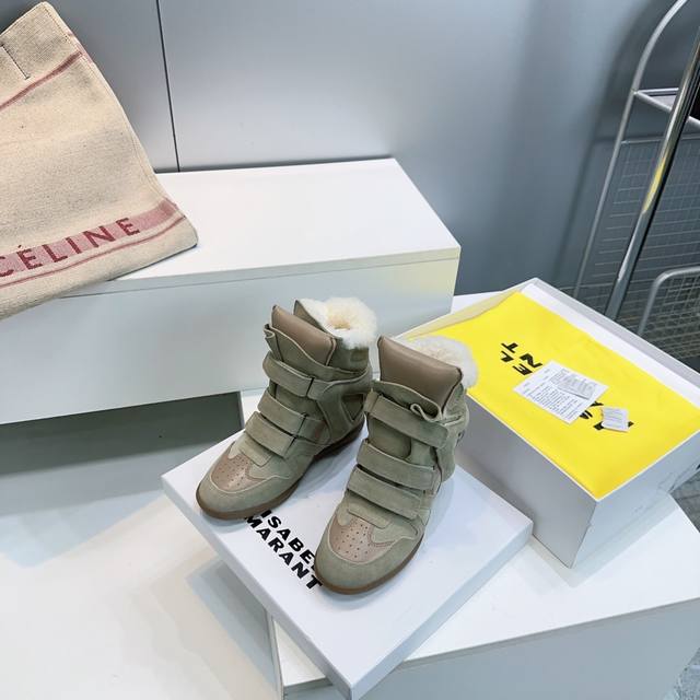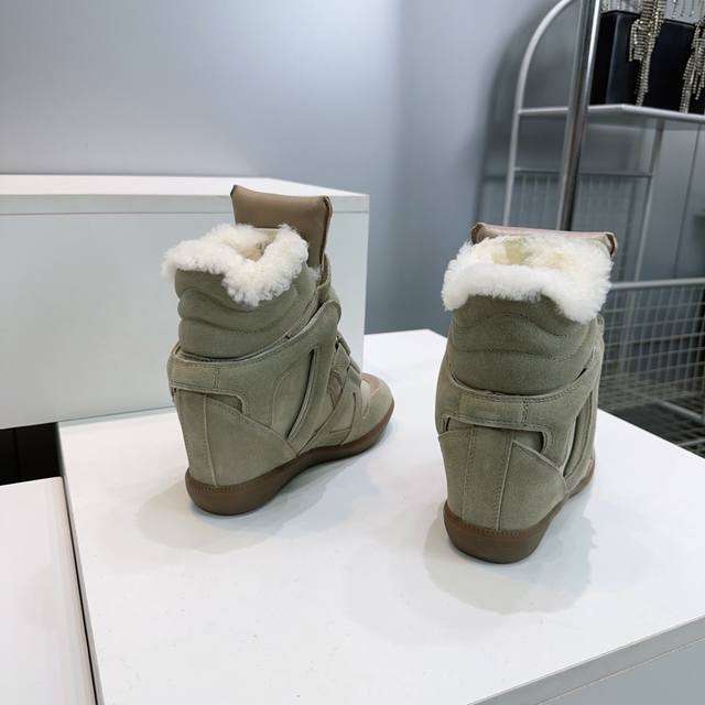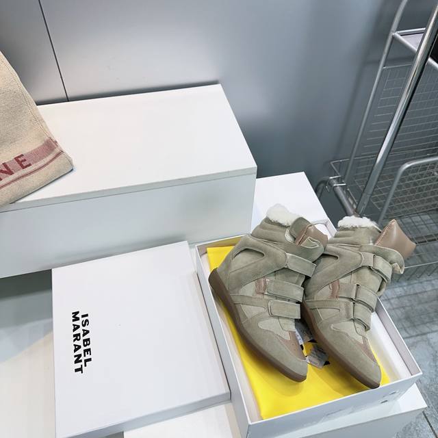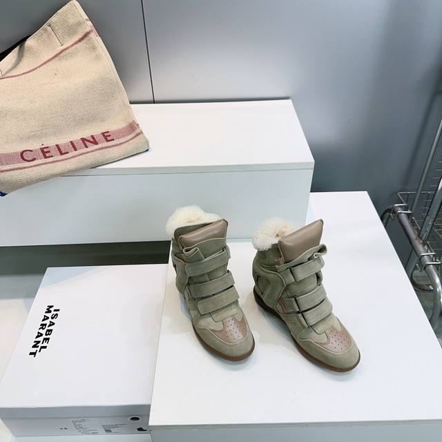 High-quality factory! Top quality Isabel Marant 2025 Autumn/Winter new classic high-top warm lamb wool casual shoes with inner wedge Velcro closure, short boots with fur lining! Super high-end feel, looks great on, and most importantly, super comfortable. Suitable for all body types. A must-buy! Versatile, stylish, and warm for autumn and winter! Y version developed, materials consistent with Zp, midsole, and sole are all Y version developed. Original custom imported cow suede + top layer cowhide upper. Imported lamb wool lining for warmth and comfort. Original molded rubber outsole. Sizes: 35-40. Size 40 is custom-made and non-refundable. Comes with full packaging.