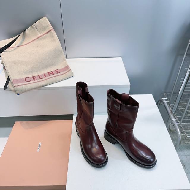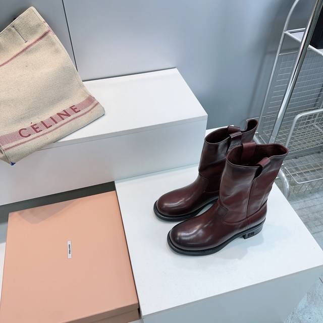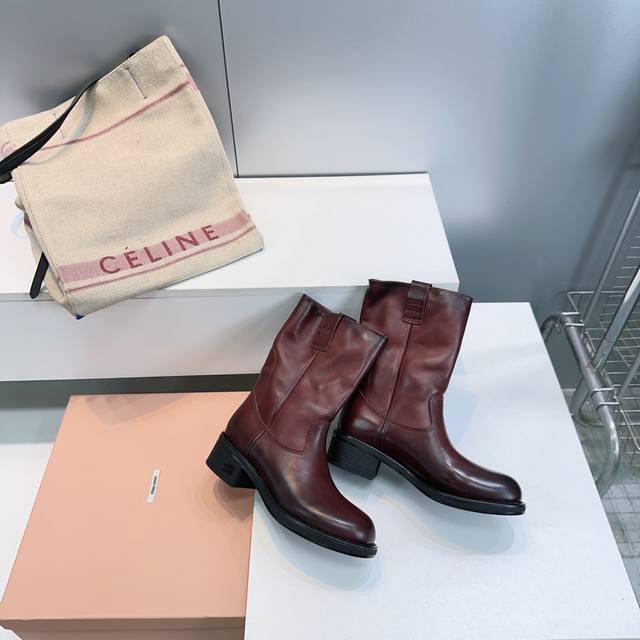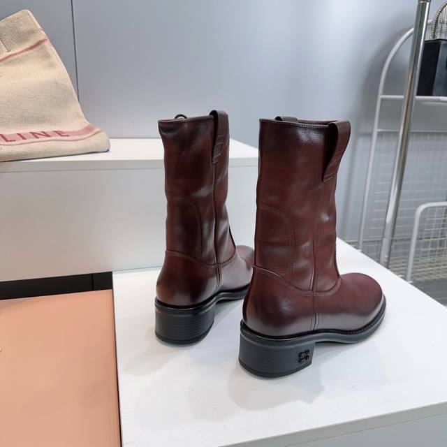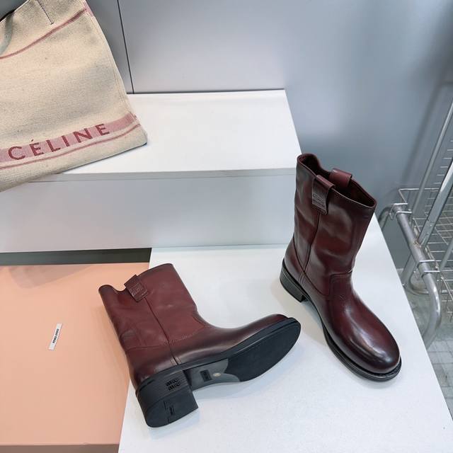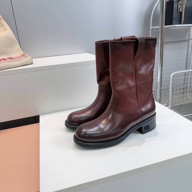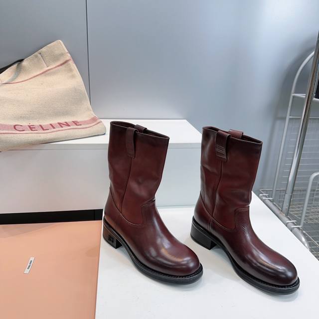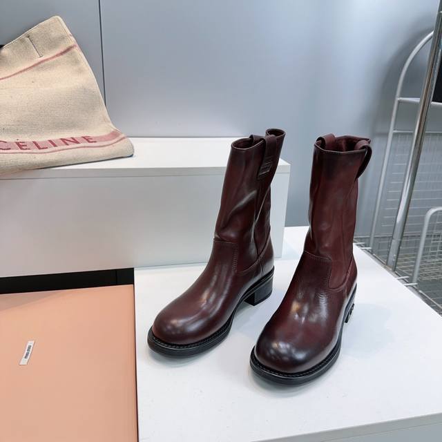 High-quality factory! Top quality Miu Miu 25Ss Fall/Winter new arrival, water-dyed cowhide distressed retro double-ear wide-shaft chunky heel ankle boots, mid-calf boots, new Fall/Winter runway style! This year's most worthwhile boots, bar none! Many internet celebrities and stars have worn Miu's Fall/Winter collection, it's undeniably cool and sexy! This Fall/Winter limited edition is very hard to find in stores. It looks stiff, but it's actually incredibly soft and comfortable! Super comfortable! The wide boot shaft provides a relaxed feel regardless of leg size and makes legs appear straighter! Full of punk style! Distressed distressed calfskin upper, water-dyed cowhide insole, original mold rubber outsole. Sizes: 35-40, size 40 is custom-made and non-refundable. Comes with original packaging.
