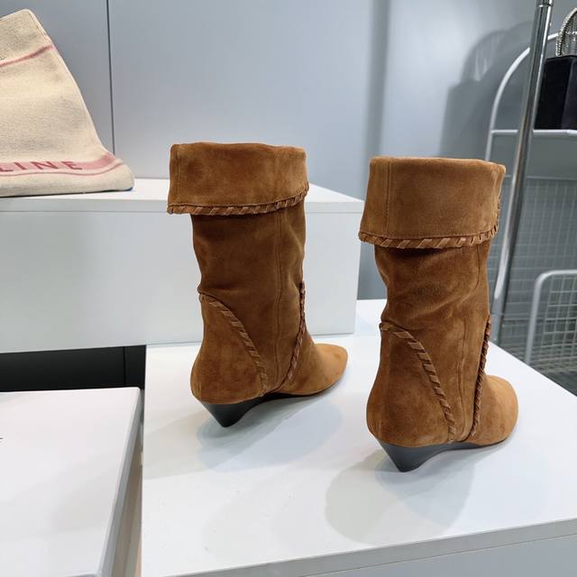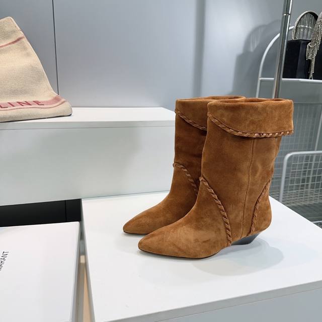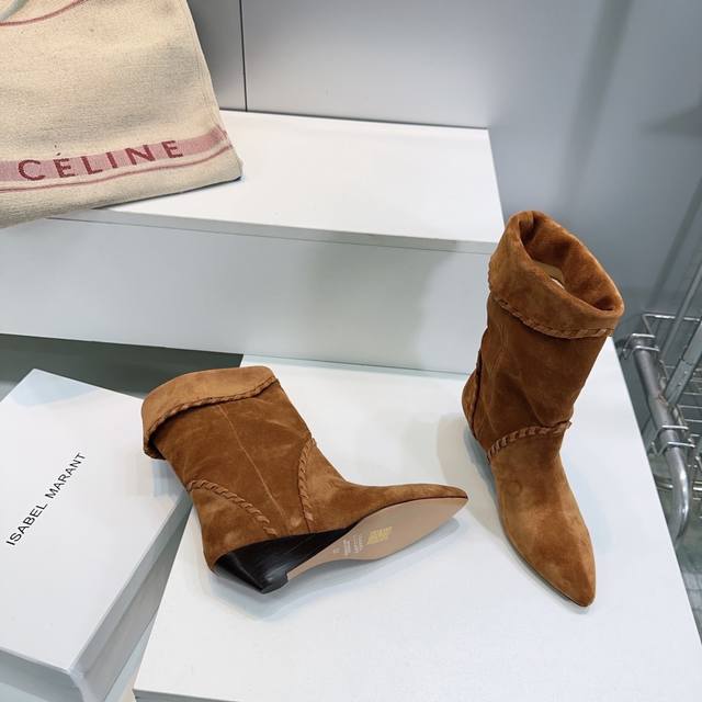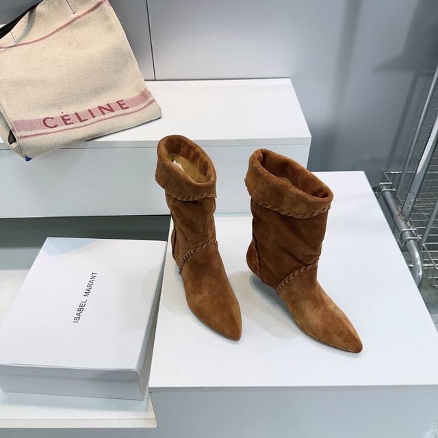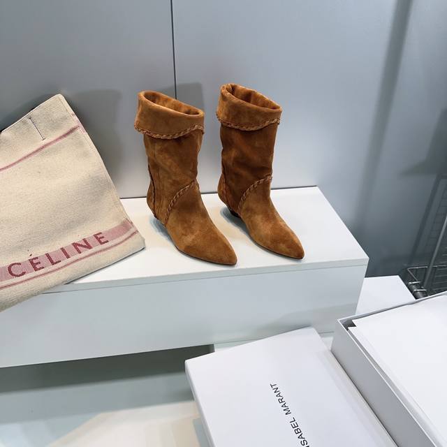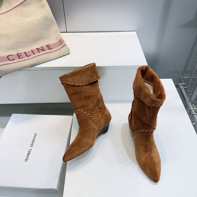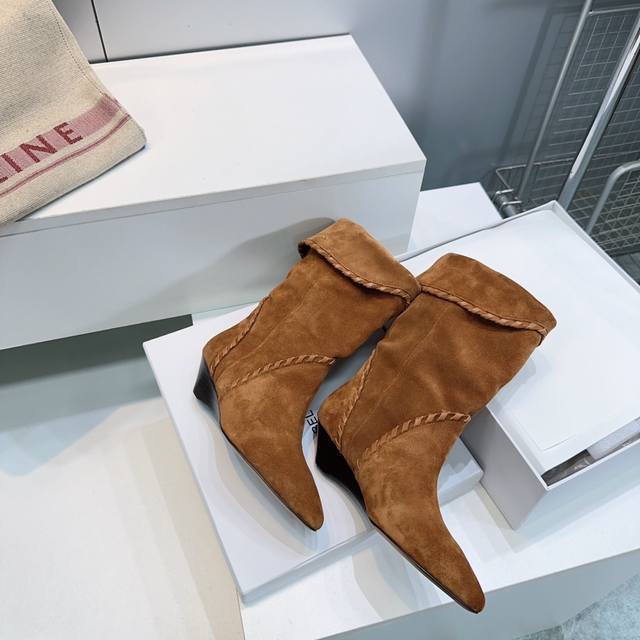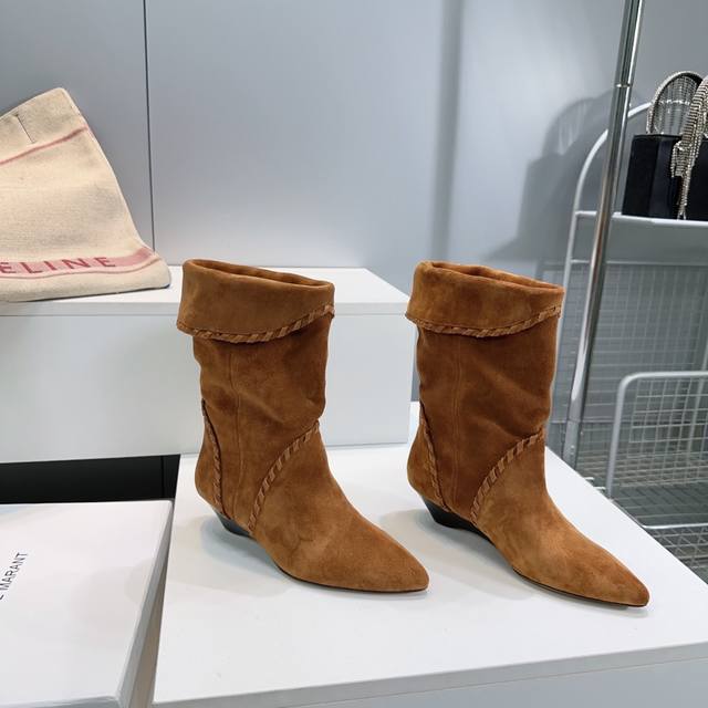 High-quality factory! Top-quality Isabel Marant 25Ss Fall/Winter runway style European and American style slouch boots, retro wedge heel, pointed toe, woven slip-on short boots/mid-boots! Boots that can be worn all year round are here! A pair of legendary retro boots with a simple retro design, and most importantly, 100% comfortable for shopping or everyday wear. They will never become just decorations in your shoe cabinet. A must-have for cool girls, the loose boot shaft makes your legs look slimmer, and they are easy to match with anything, stylish and versatile, perfect for Instagram!