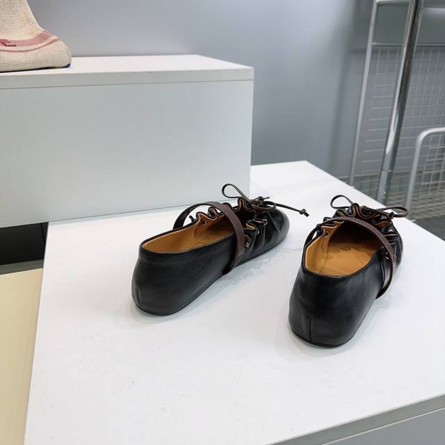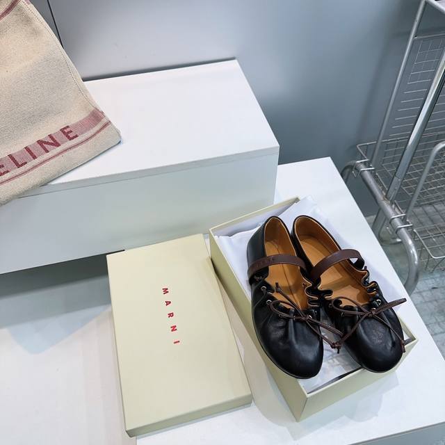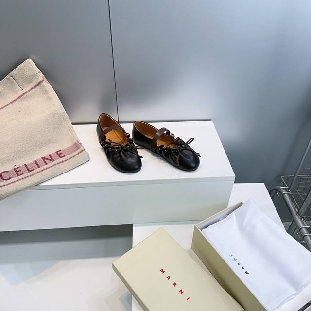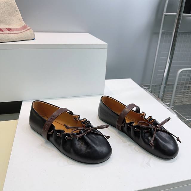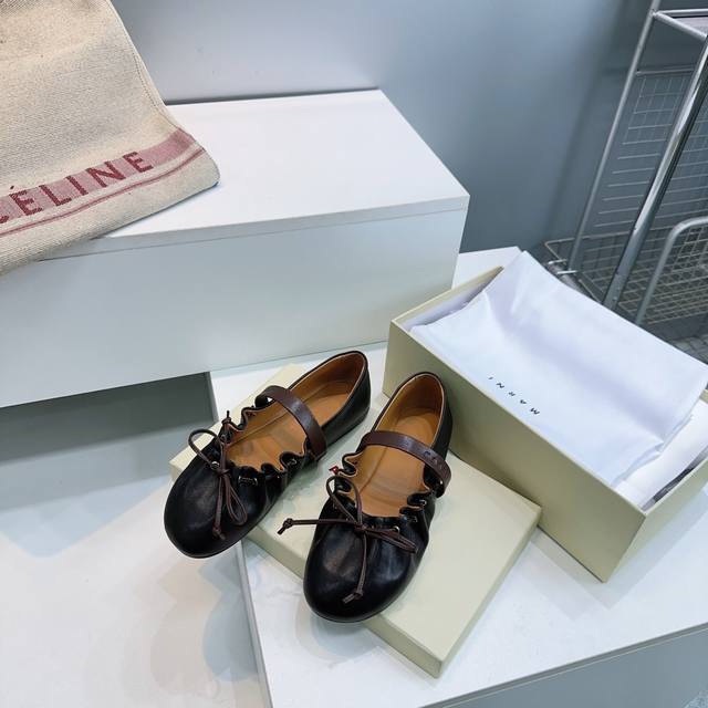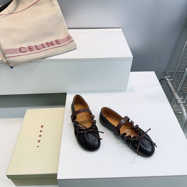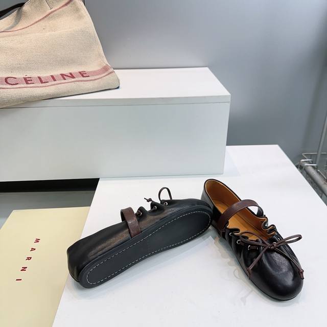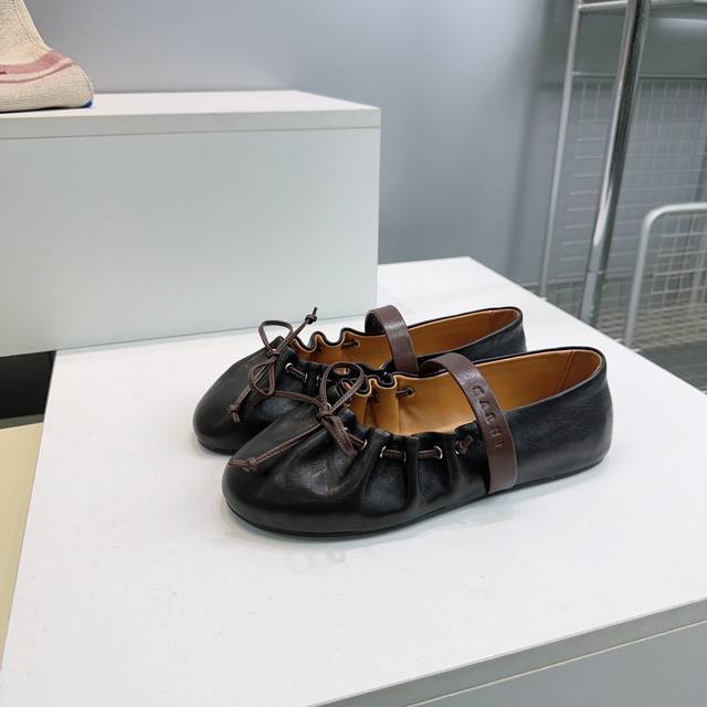 High-quality factory! Top-quality Marni 26Fw Spring/Summer new arrival pleated bow ballet flat Mary Jane shoes! Round toe silhouette, contrasting upper, brown bow and lace-up collar, presenting a cute and minimalist style. These super cute Marni ballet flats have a relaxed feel with their color blocking and lace-up detail, perfectly balancing sweetness and coolness. The romantic season for ballet flats is here again. Open your shoe cabinet, and ballet flats are definitely the item that can match everything and brighten up everything! Upper made of imported calfskin, insole made of sheepskin, original mold rubber outsole. Sizes: 35-41. Sizes 40 and 41 are custom-made and non-refundable. Comes with original packaging.