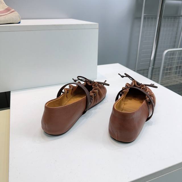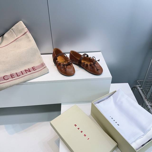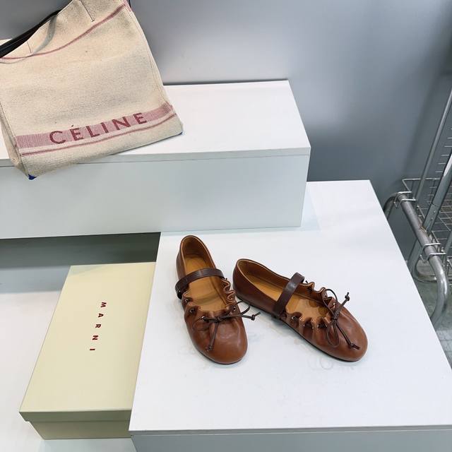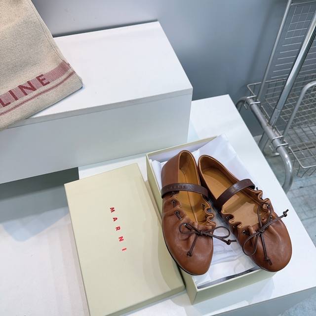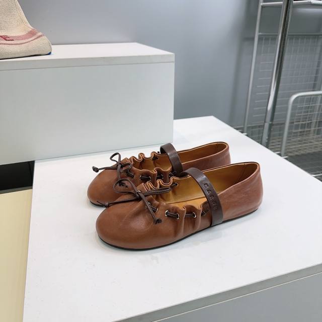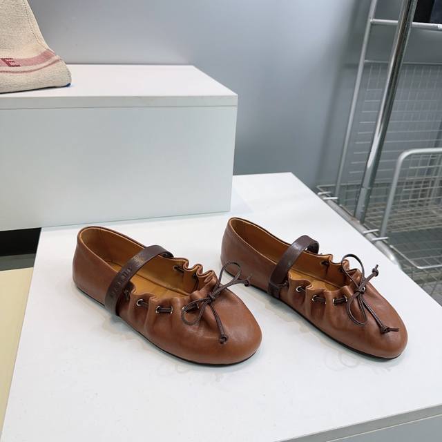 High-quality factory! Top-quality Marni 26Fw Spring/Summer new arrival pleated bow ballet flat Mary Jane shoes! Round toe silhouette, contrasting upper, brown bow and lace-up collar, presenting a cute and minimalist style. These super cute Marni ballet flats have a relaxed feel with their color blocking and lace-up detail, perfectly balancing sweetness and coolness. The romantic season for ballet flats is here again. Open your shoe cabinet, and ballet flats are definitely the item that can match everything and brighten up everything! Upper made of imported calfskin, insole made of sheepskin, original mold rubber outsole. Sizes: 35-41. Sizes 40 and 41 are custom-made and non-refundable. Comes with original packaging.