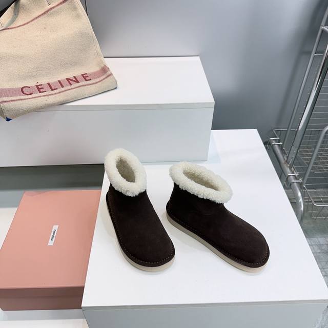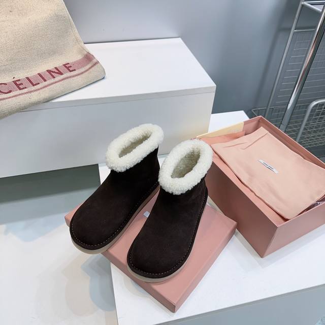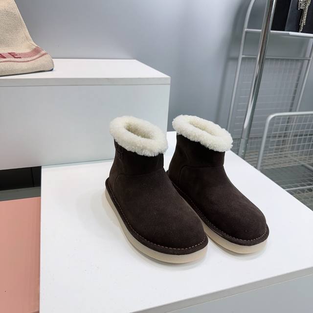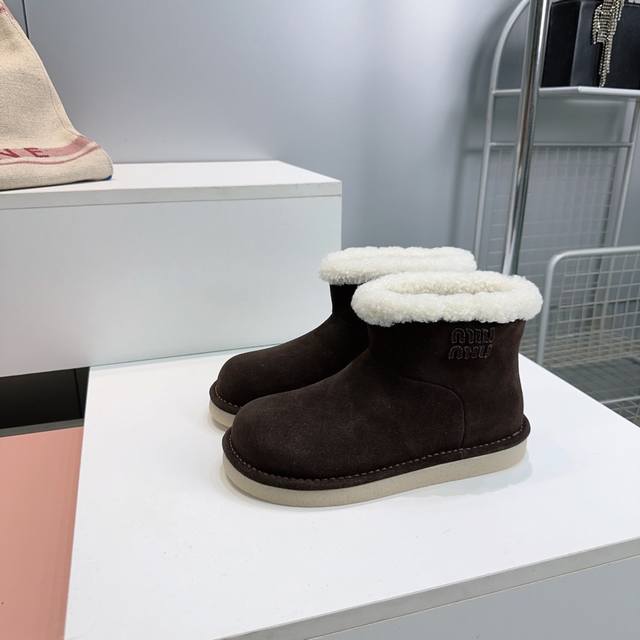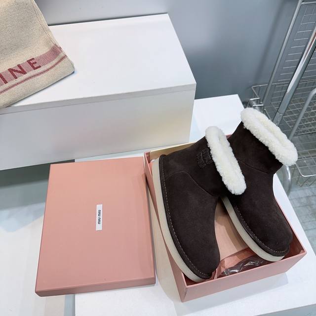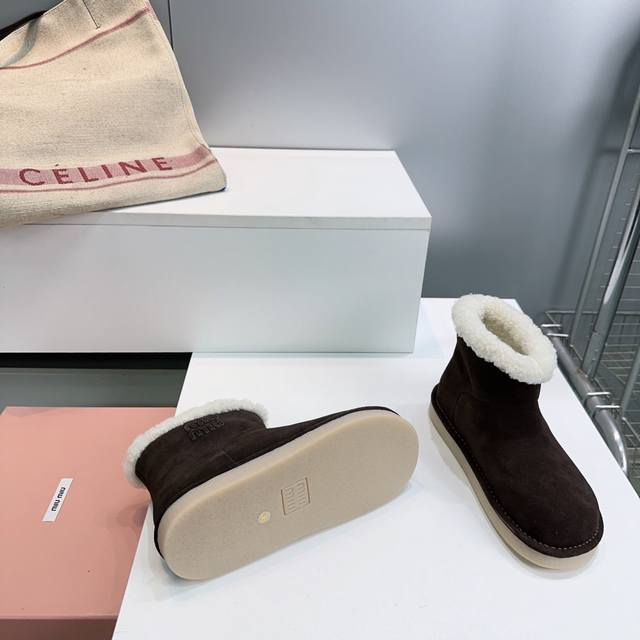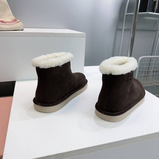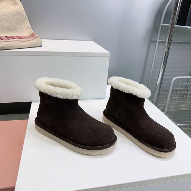 High-quality factory! Top-quality Miu Miu 2025 Winter New Simple Round Toe Lambswool Snow Boots! Most winter snow boots are very thick and heavy, but this Miu Miu boot is so cute this winter! The simple round toe design, with a logo embellishment on the side, is adorable yet warm for winter. The upper is made of imported cow suede, the insole is made of Australian curly wool, and the outsole uses original Ev smoked glue for slip resistance! Sizes: 35-40. Size 40 is custom-made and non-refundable. Comes with original packaging.